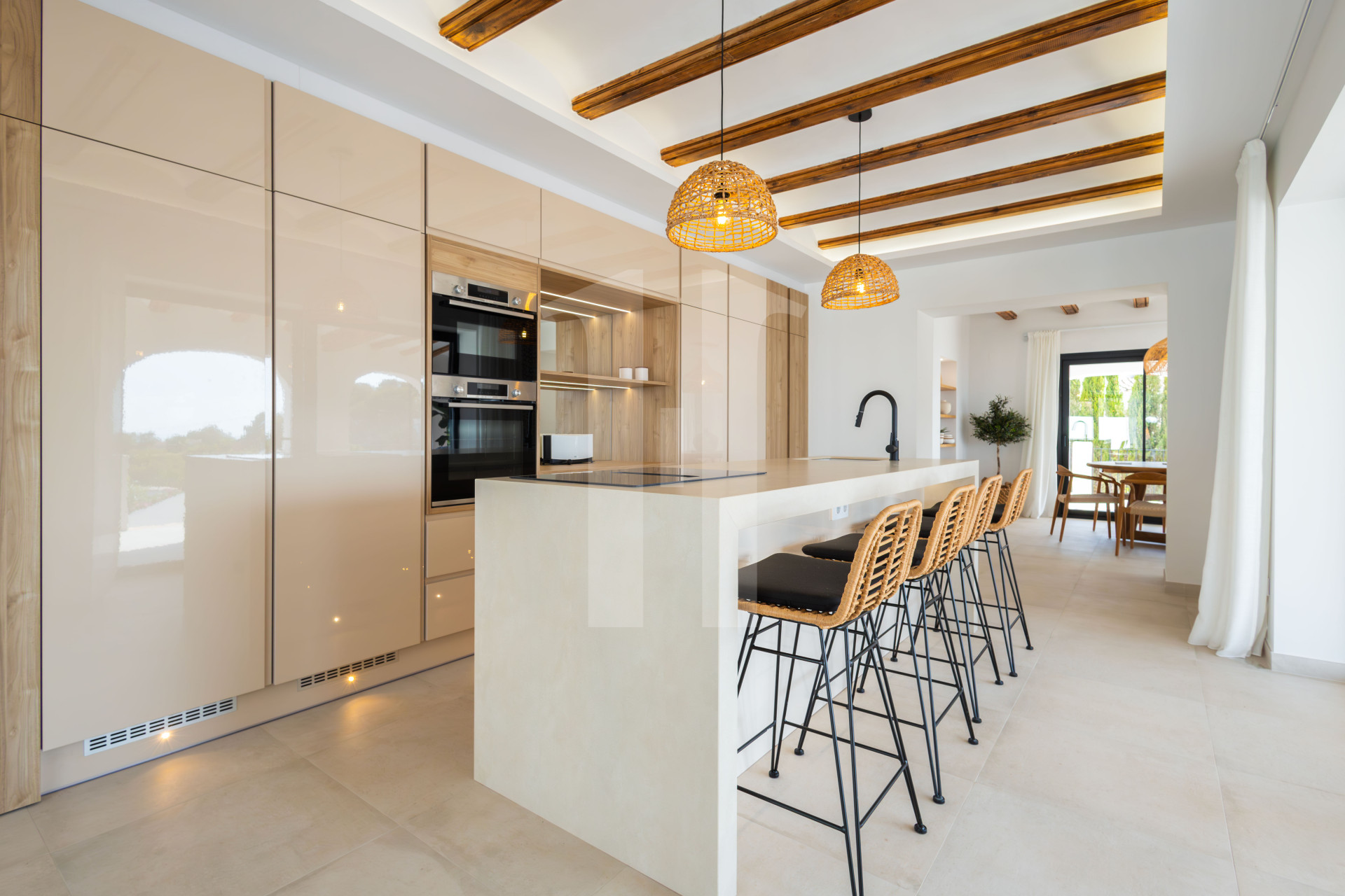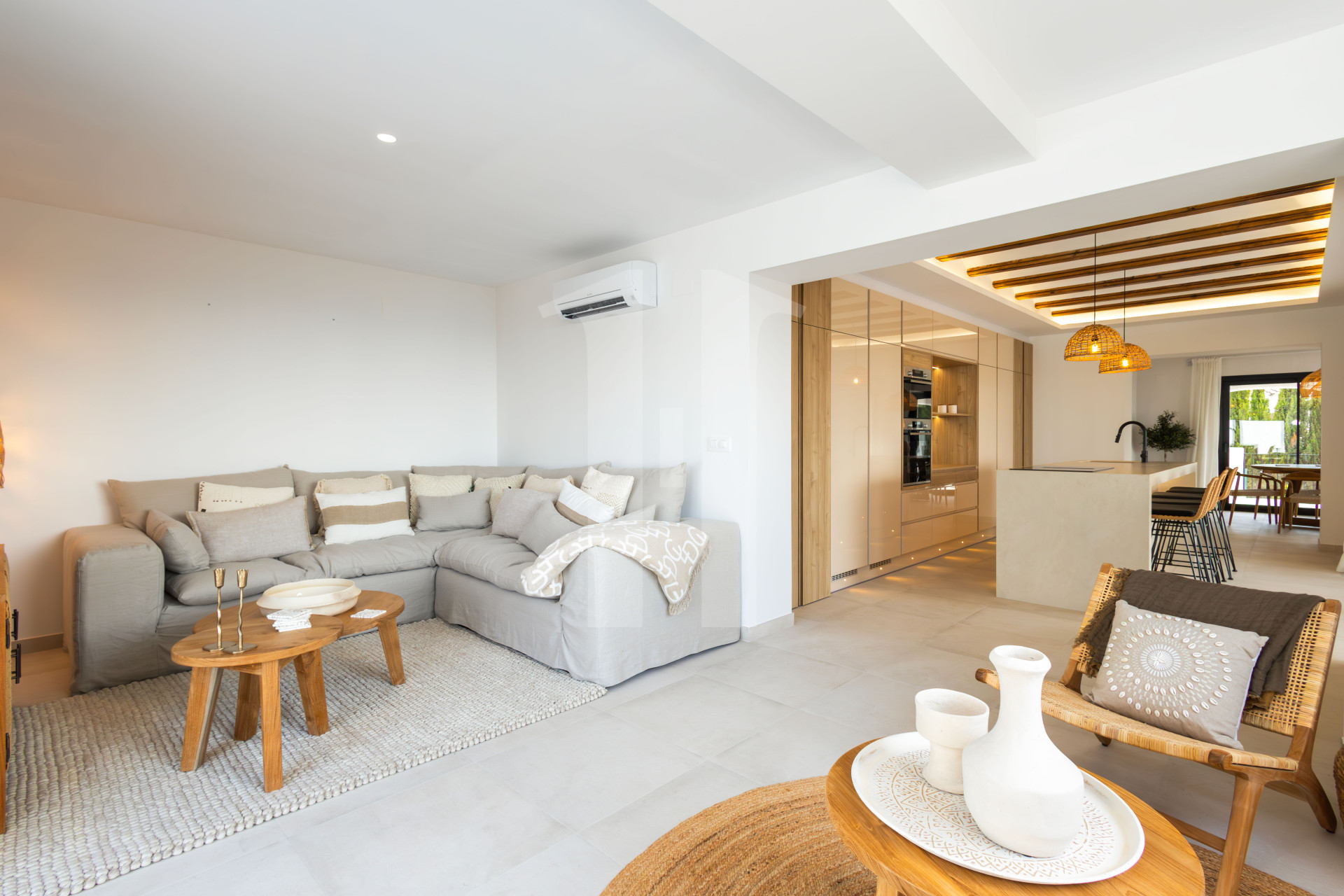 The modern open-plan kitchen blends into the main living room, creating an ideal environment for sharing moments with family or enjoying evenings with friends.