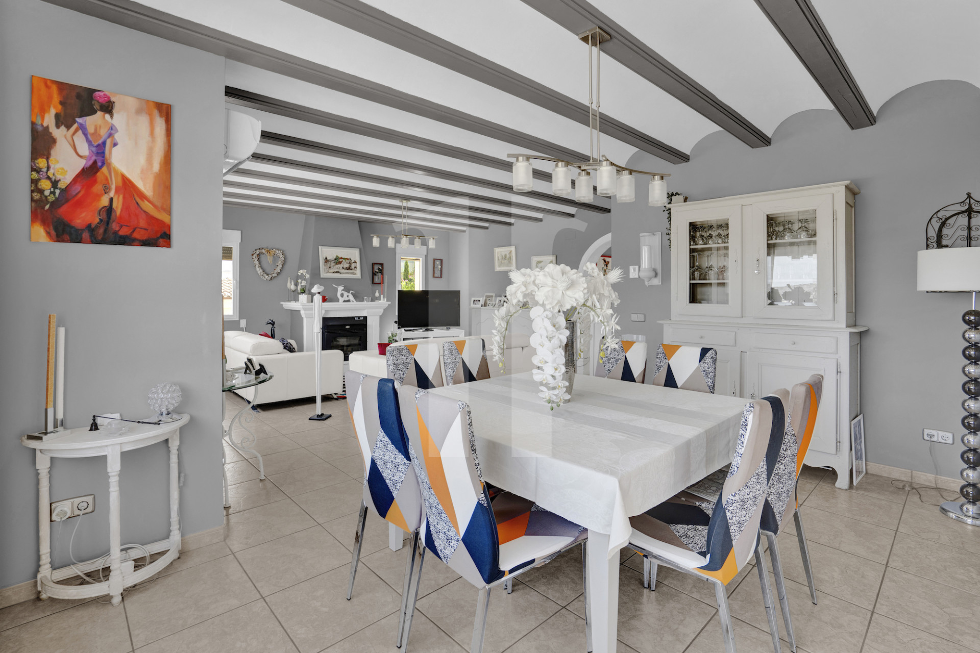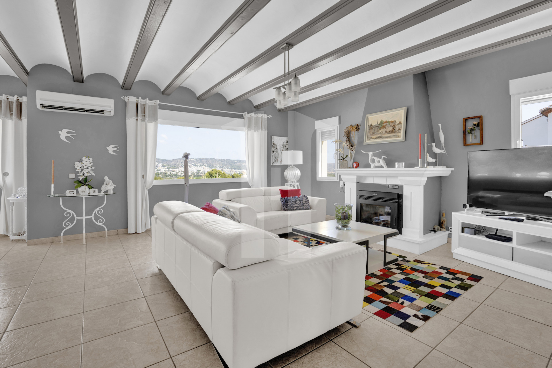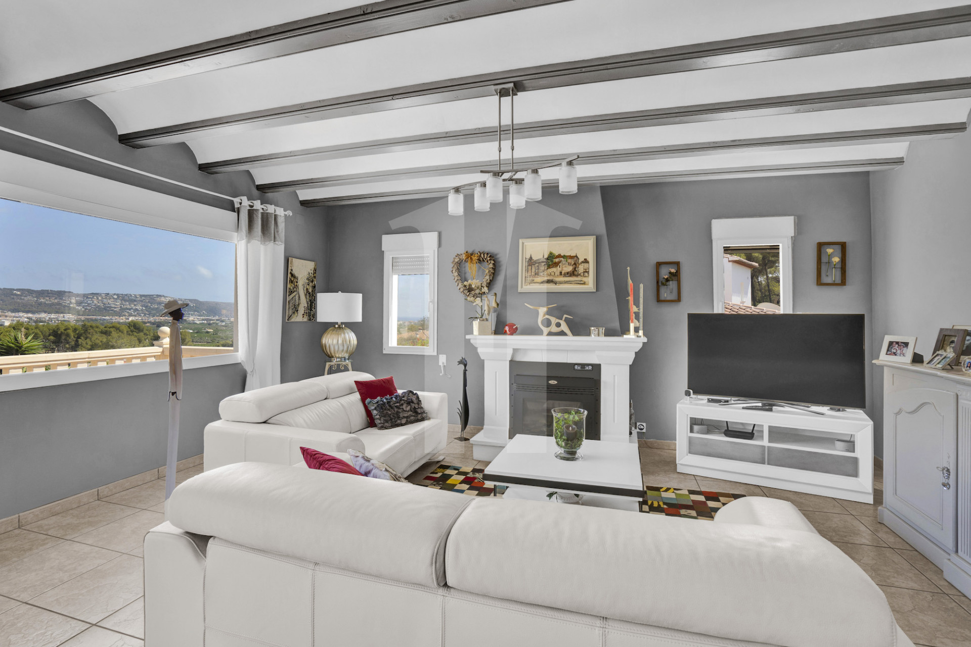 Impressive living-dining room with fireplace and panoramic windows framing unbeatable views of the sea and the Montgó, with access to a large covered terrace.