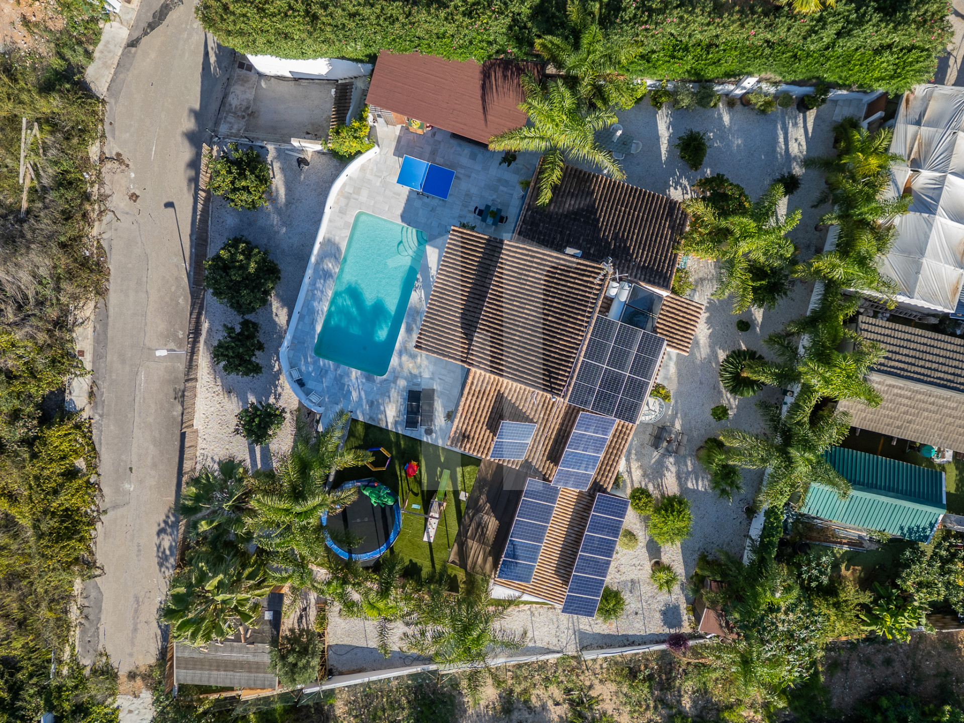 trees and fruit trees, a chill-out area by the pool, and a wooden garden house ideal for
