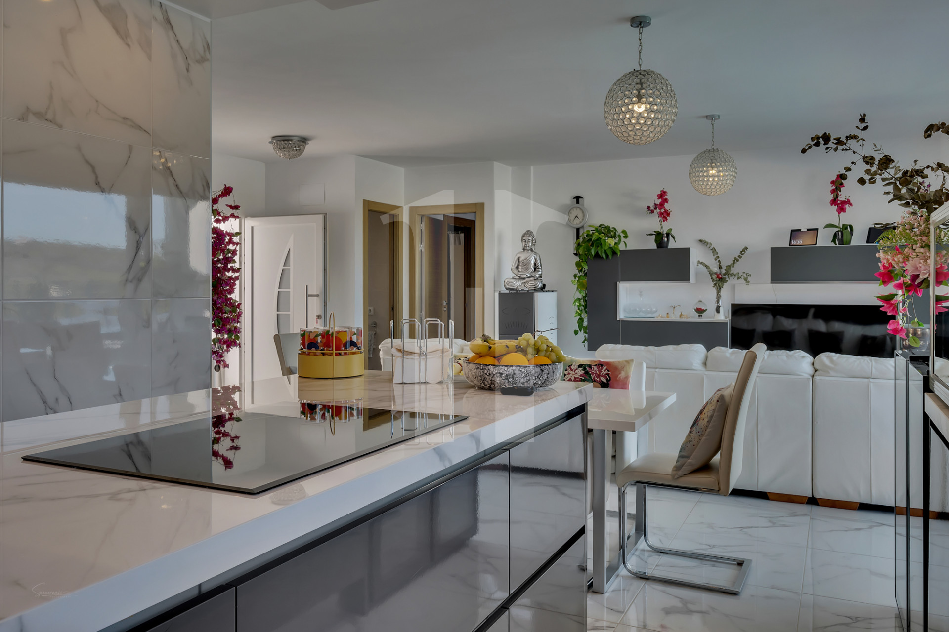 The main house features a bright and spacious living-dining area with an open-plan designer