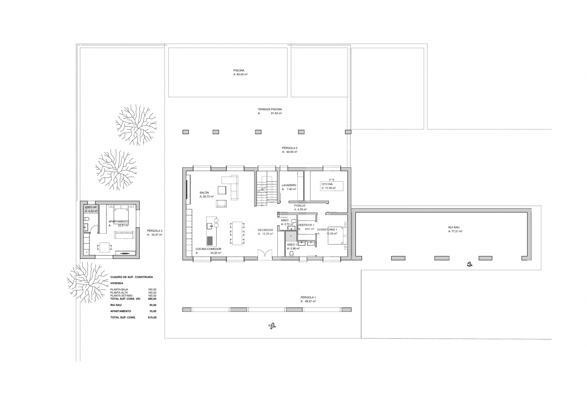 Unique Luxury Mediterranean Finca 5/10 minutes to the amenities, beach and schools, newly built home stands out for its contemporary design, spacious interiors and privileged location. With a total built area of 480 m², the property is functionally distributed across a basement, ground floor and first floor, offering maximum comfort and efficiency in every space.