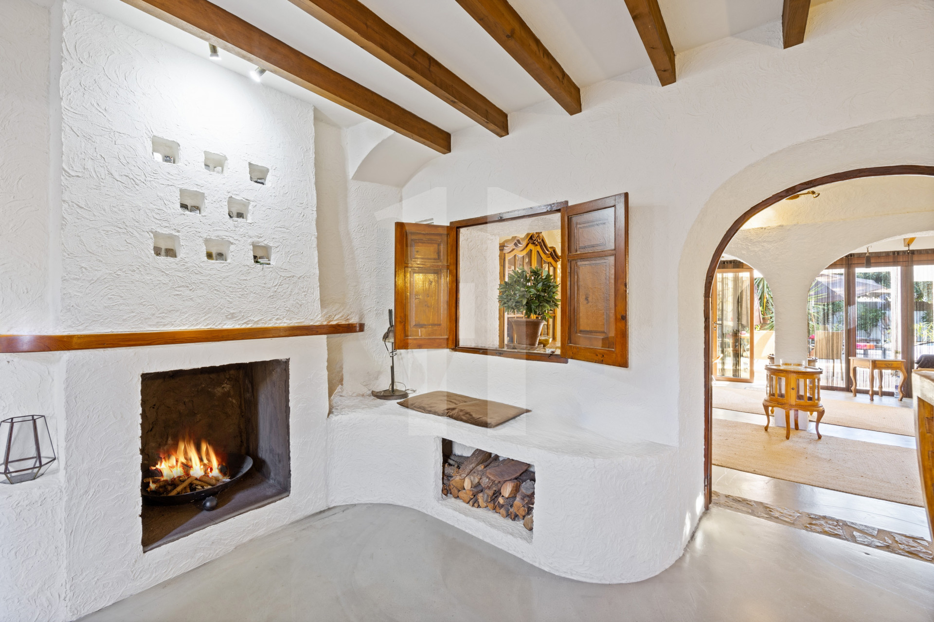 The main house includes a spacious living room with a fireplace, a cosy Naya overlooking