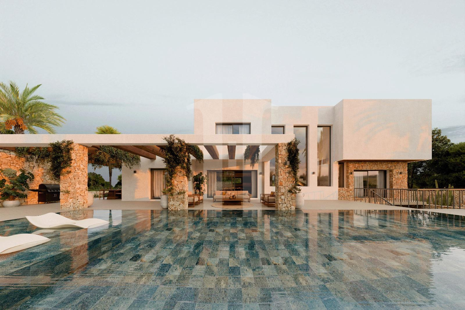 This elegant Ibiza-style villa, spread over two levels, perfectly combines modernity with Mediterranean tradition. On the ground floor, a spacious and light-filled living-dining area opens onto breathtaking landscapes, creating an atmosphere of serenity and luxury. The open-concept kitchen is modern, functional, and equipped with the latest technology. This level also features a guest WC and a practical utility room. The upper floor houses four spacious double bedrooms and three full bathrooms….