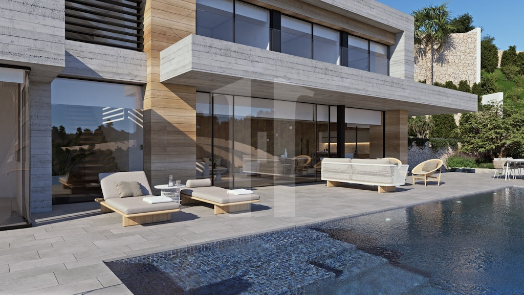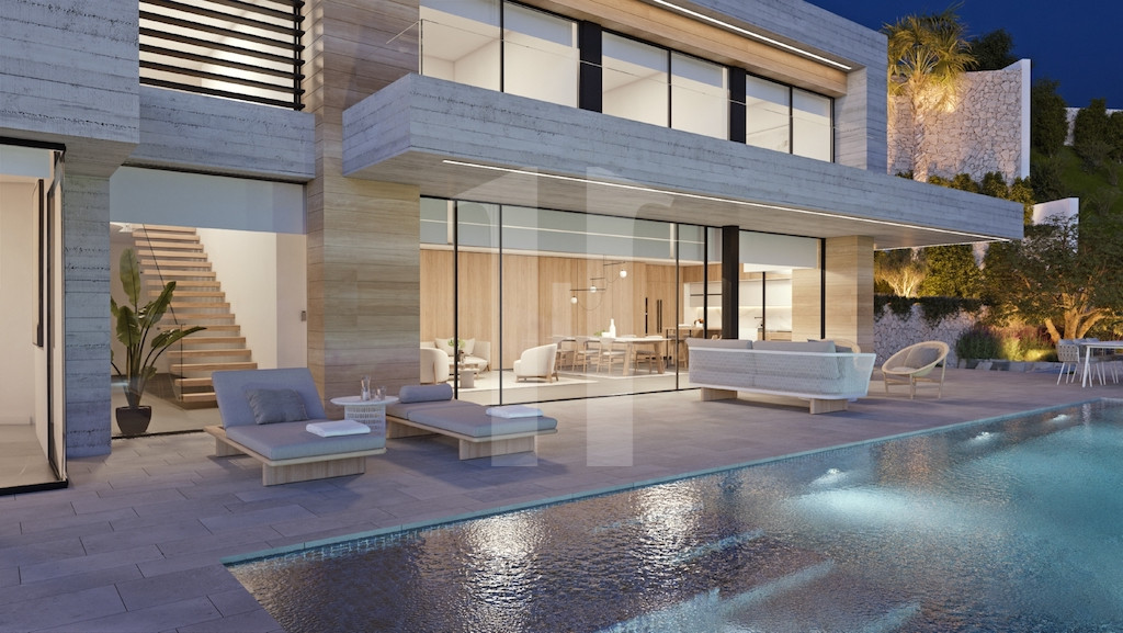 Le jardin est de type méditerranéen, entièrement intégré dans l’architecture et les différents espaces extérieurs dont bénéficie cette villa, parmi lesquels la piscine rectangulaire harmonieuse avec un mur de verre qui se confond avec la mer, une grande terrasse, un chill-out et plusieurs porches.