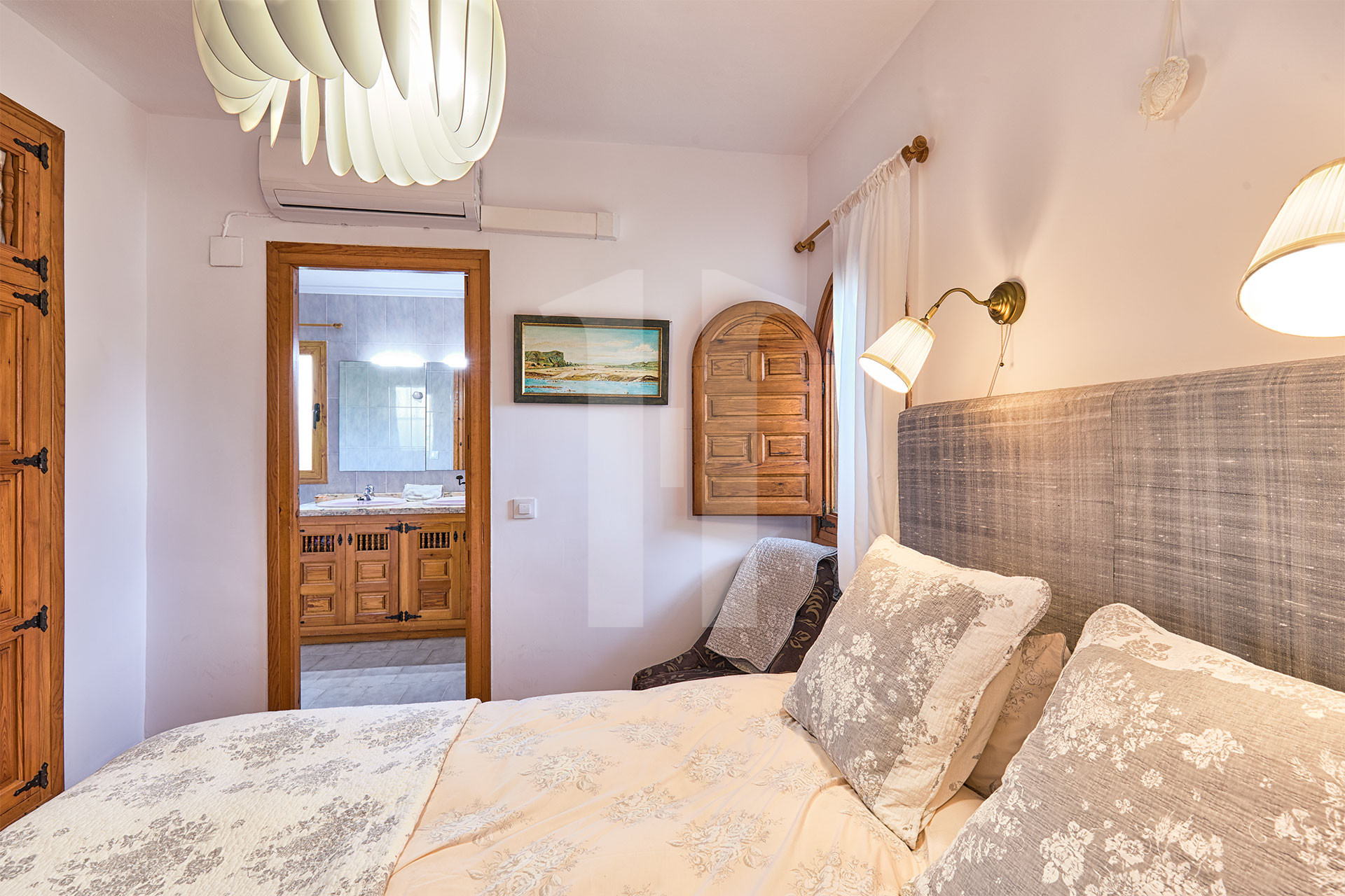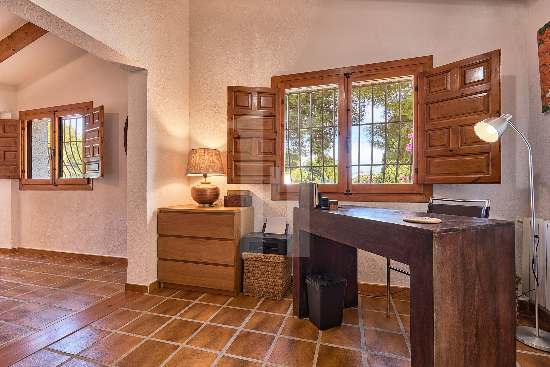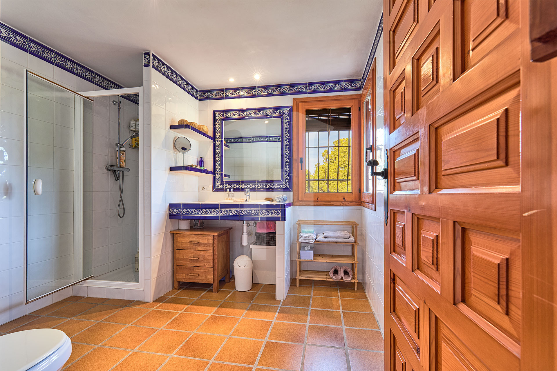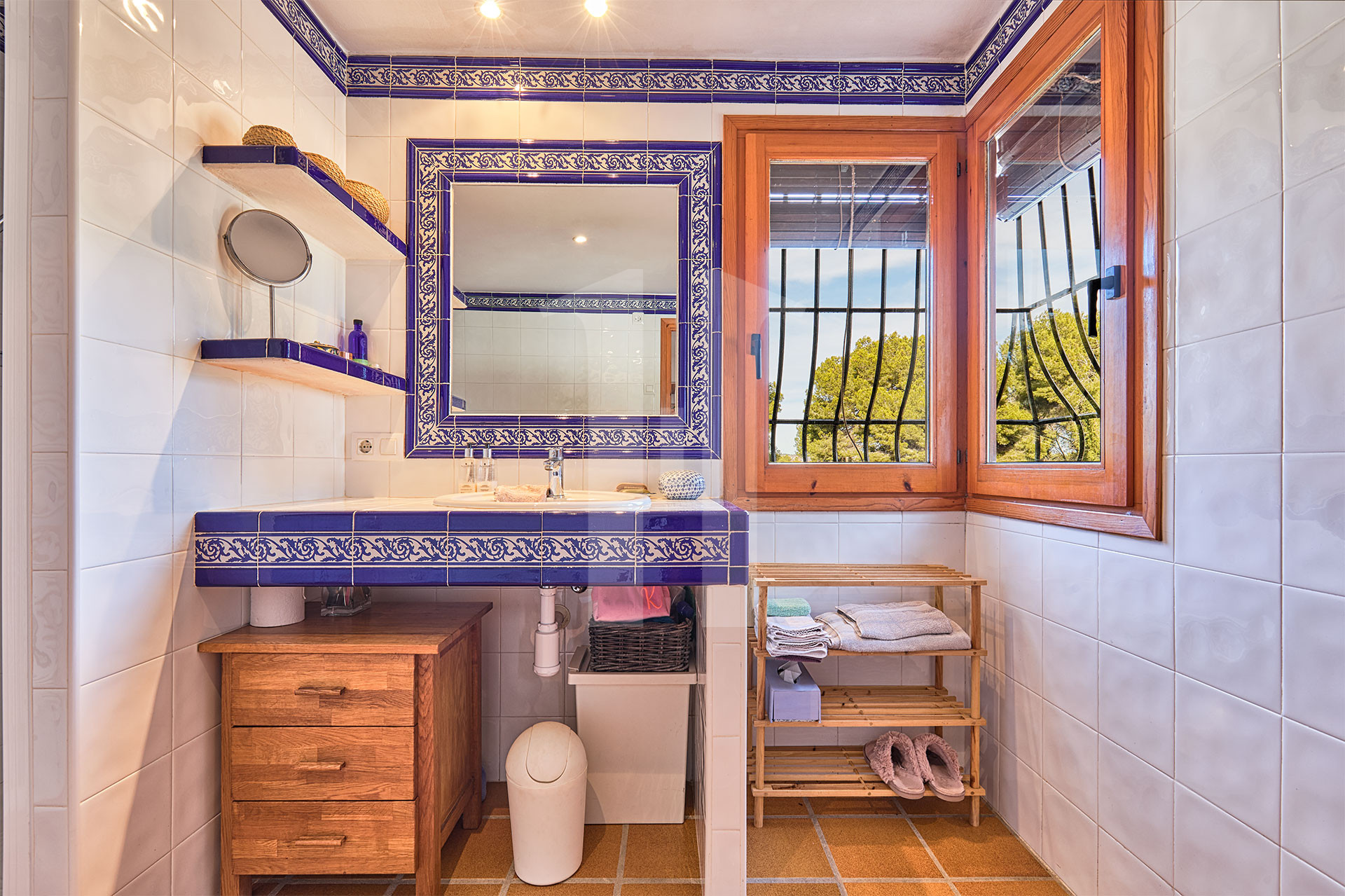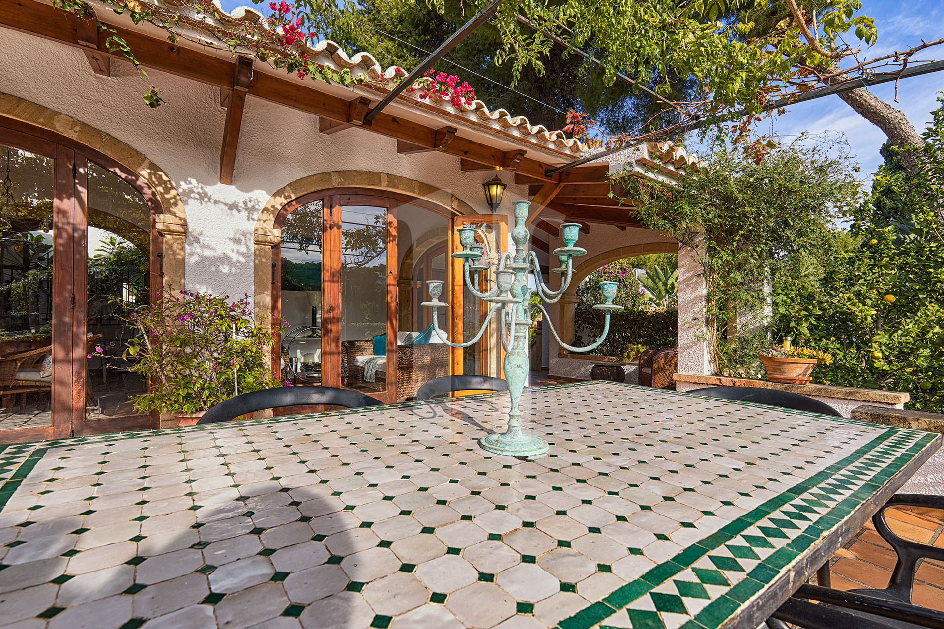 L’accès principal se fait par un élégant escalier décoré de carreaux espagnols traditionnels menant à une terrasse ensoleillée avec vue sur la piscine et le jardin. De là, on accède à la lumineuse Naya, parfaite pour un espace salon et salle à manger.