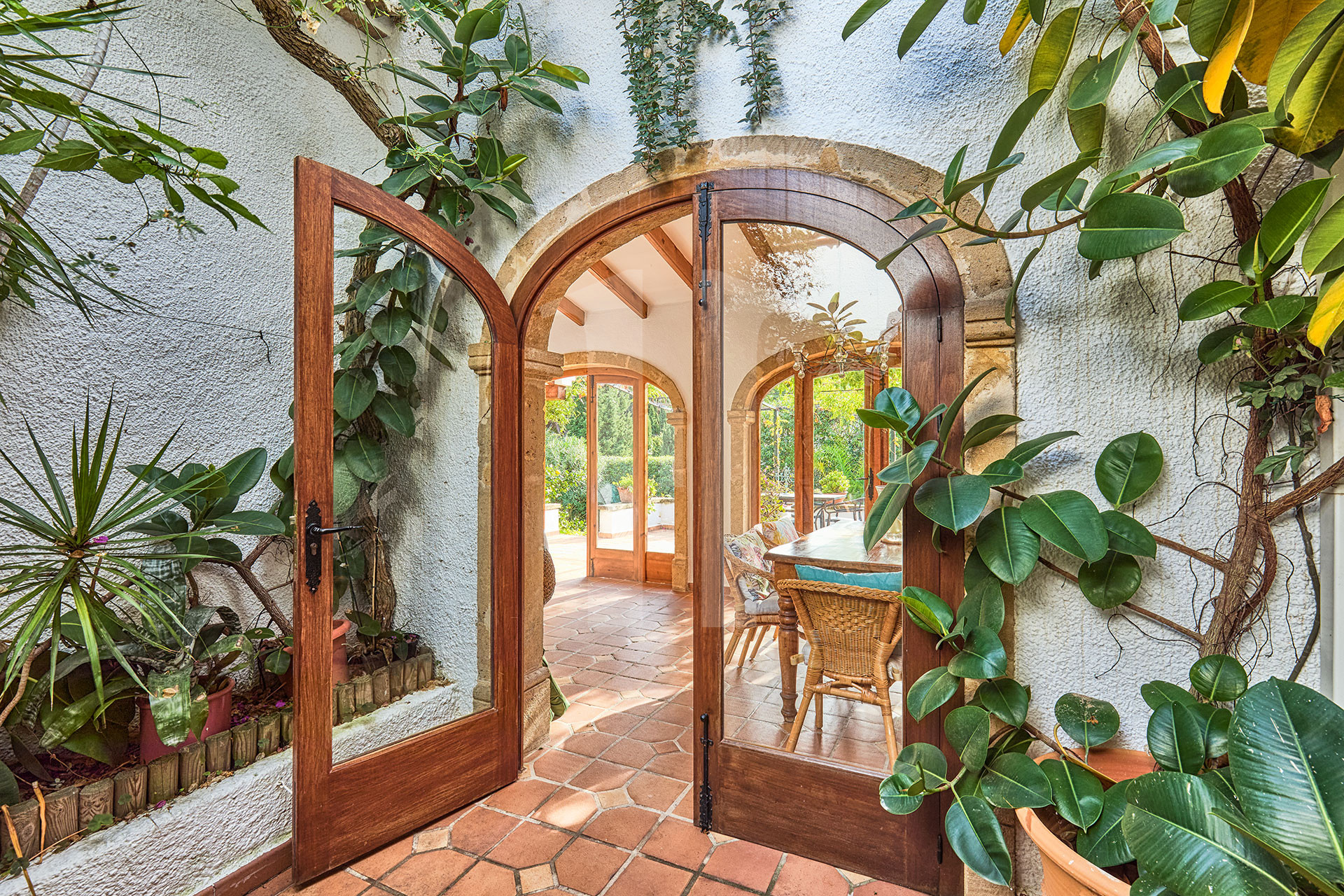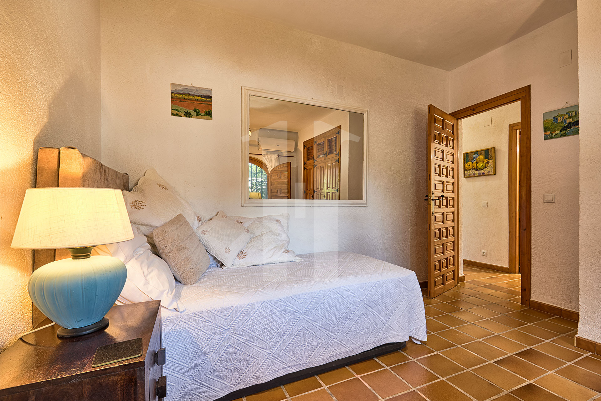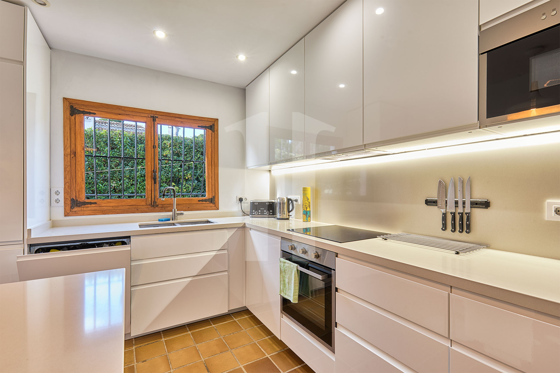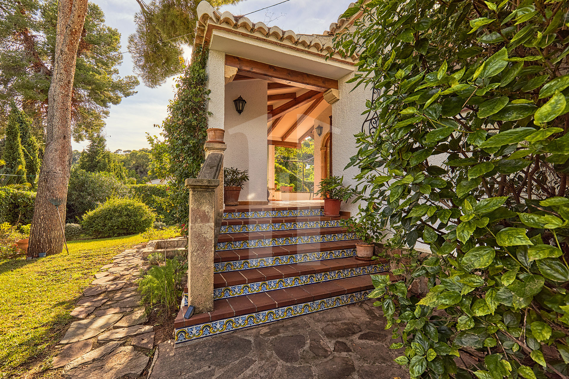 L’accès principal se fait par un élégant escalier décoré de carreaux espagnols traditionnels menant à une terrasse ensoleillée avec vue sur la piscine et le jardin. De là, on accède à la lumineuse Naya, parfaite pour un espace salon et salle à manger.