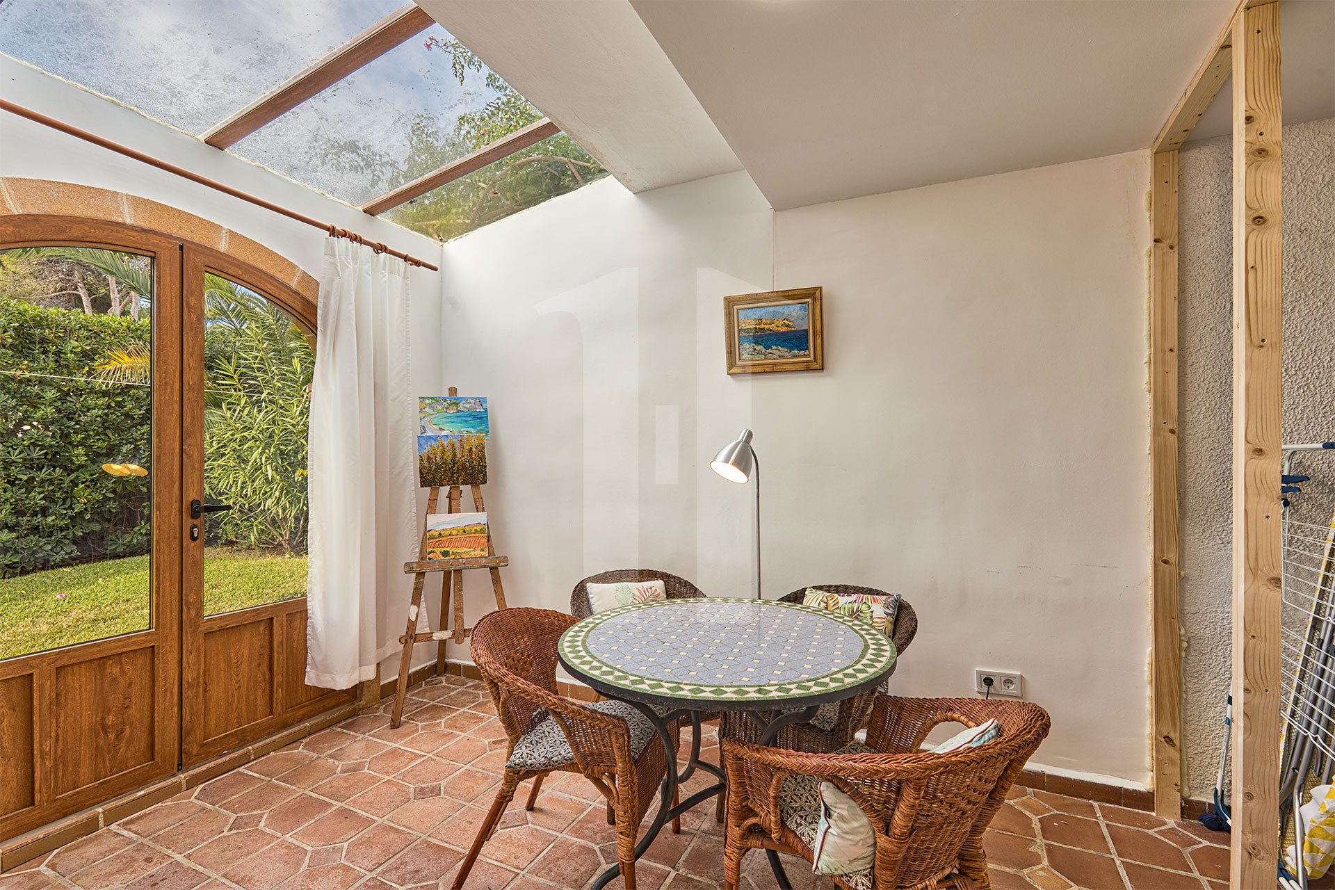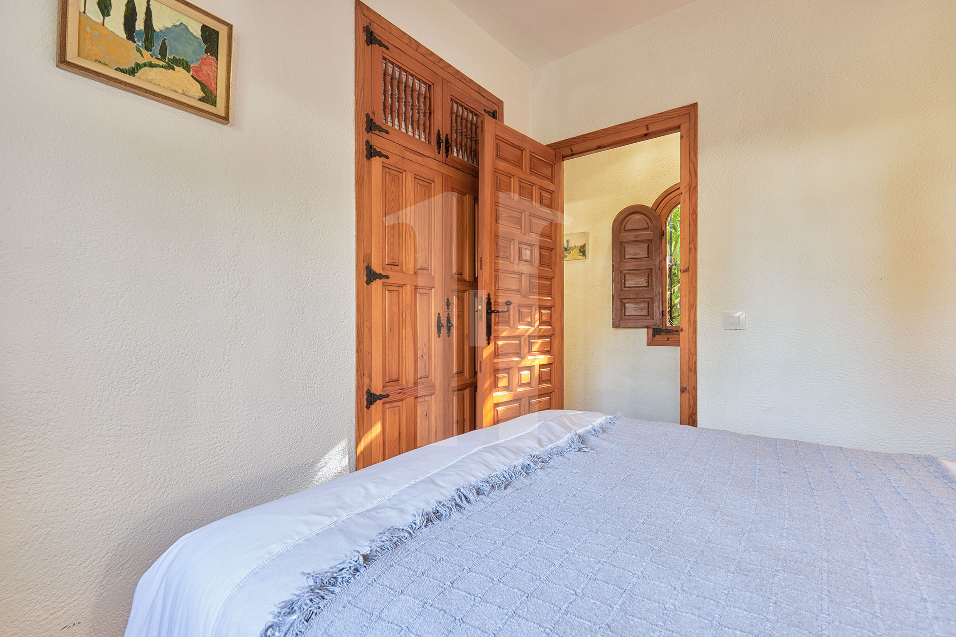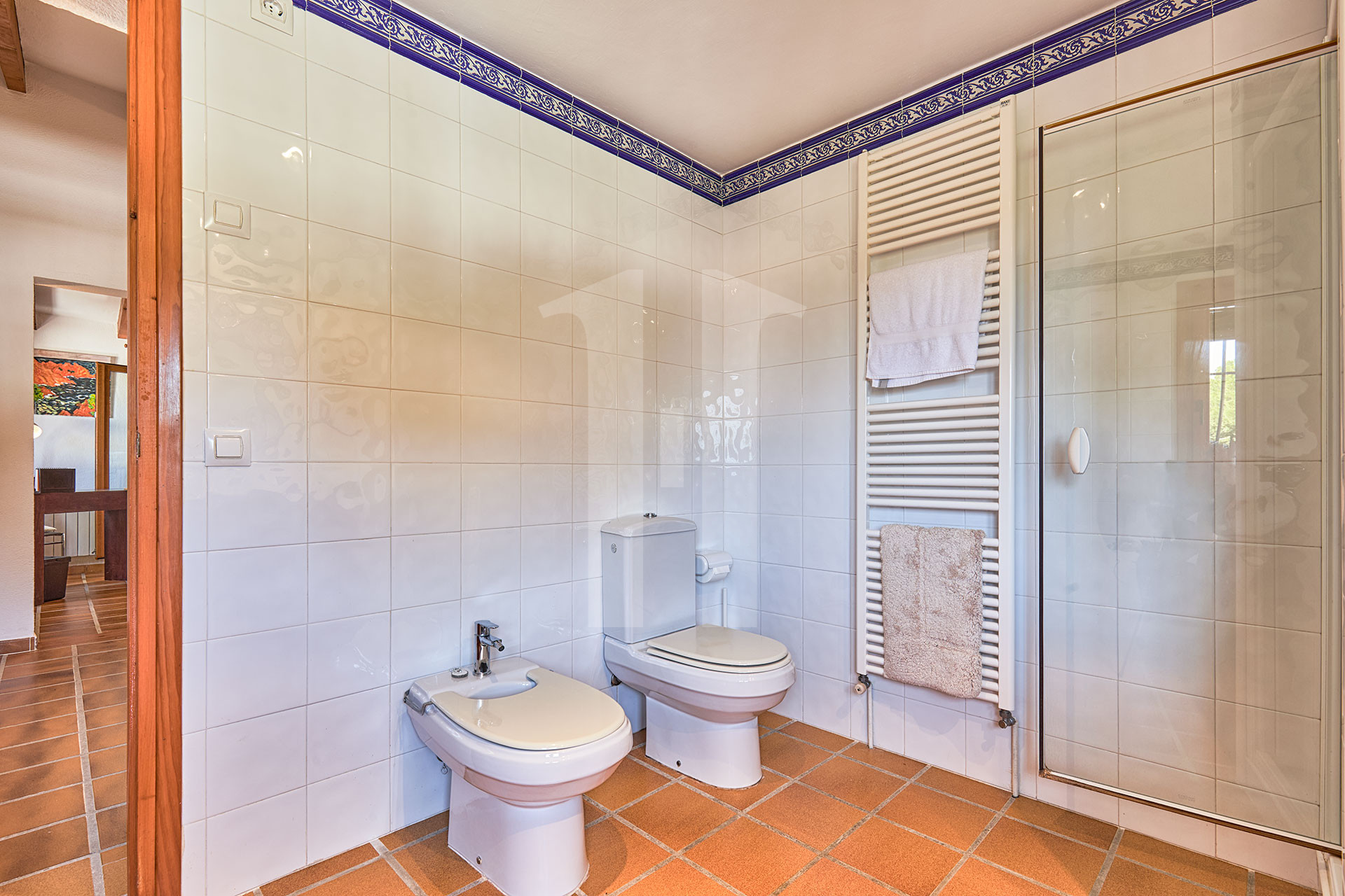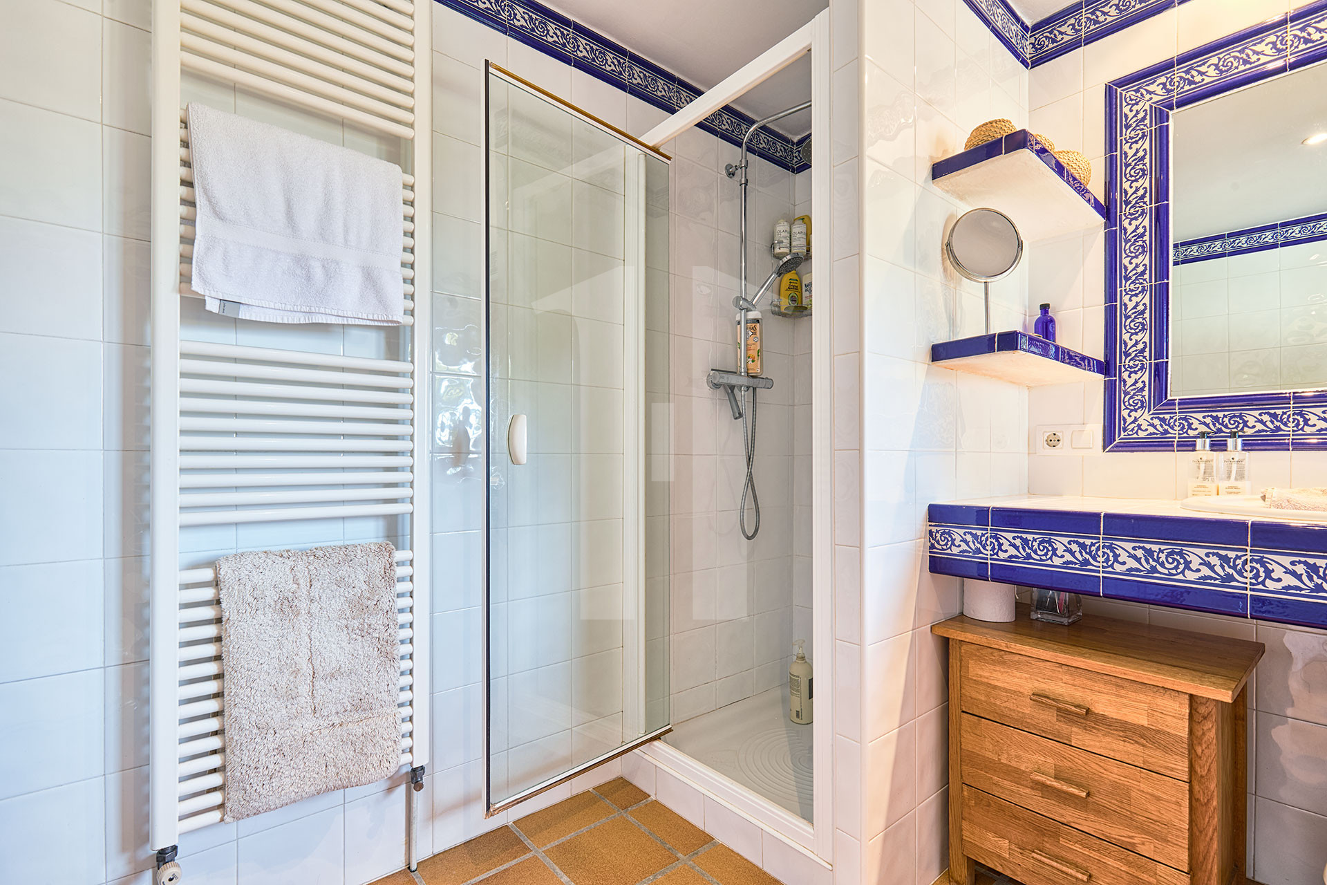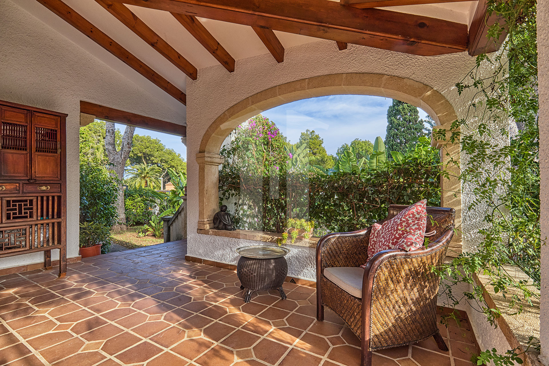 L’accès principal se fait par un élégant escalier décoré de carreaux espagnols traditionnels menant à une terrasse ensoleillée avec vue sur la piscine et le jardin. De là, on accède à la lumineuse Naya, parfaite pour un espace salon et salle à manger.
