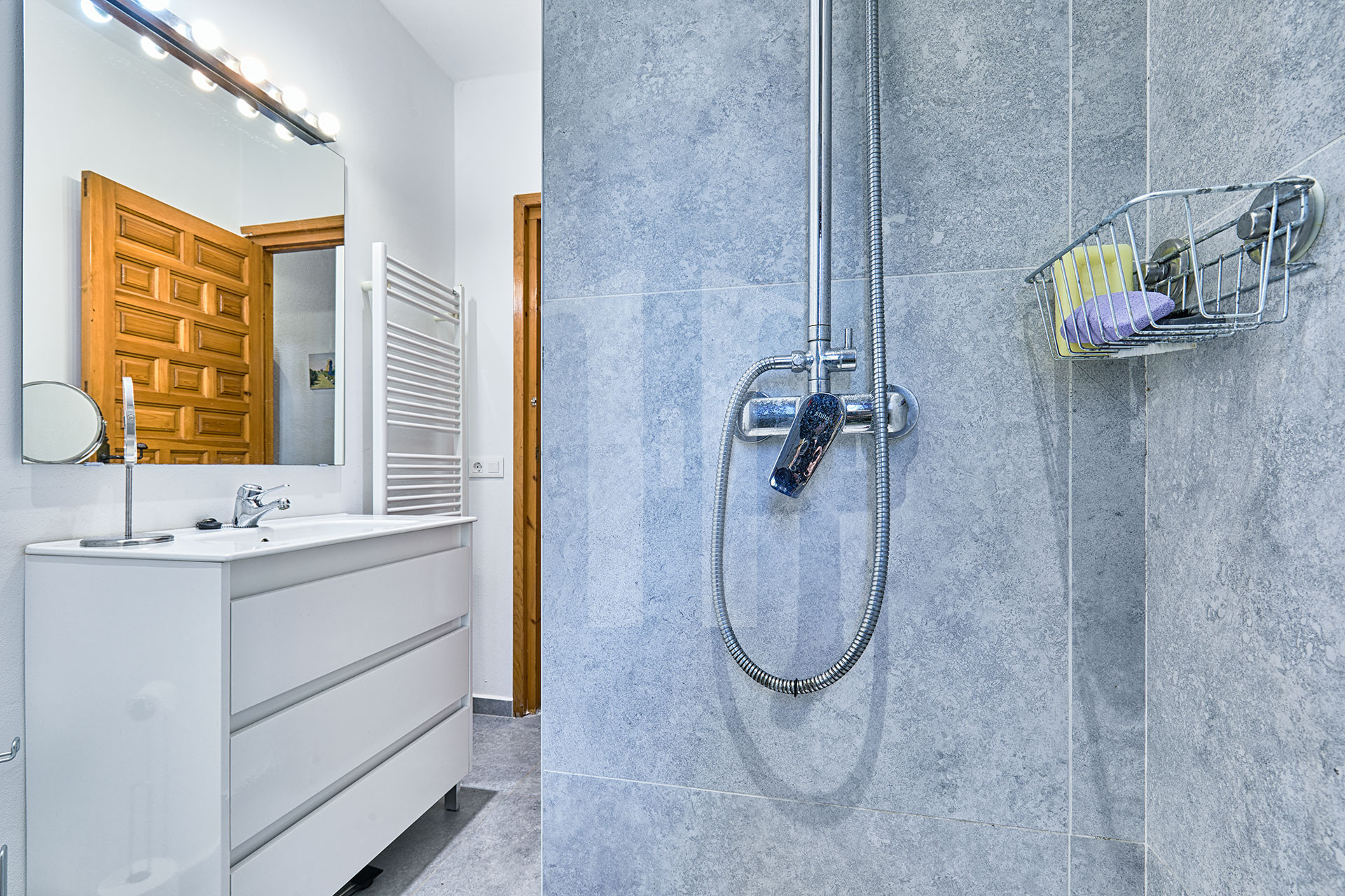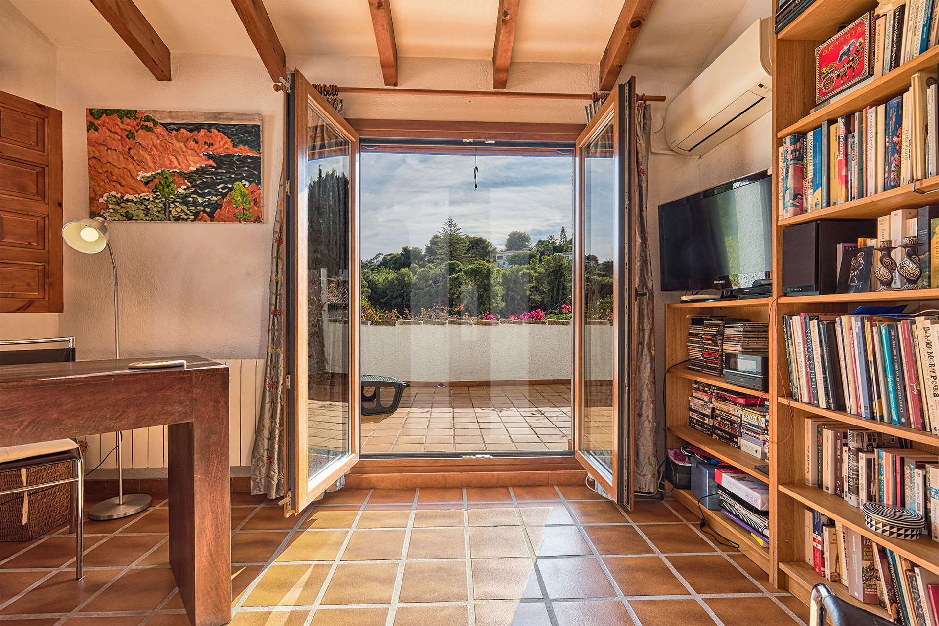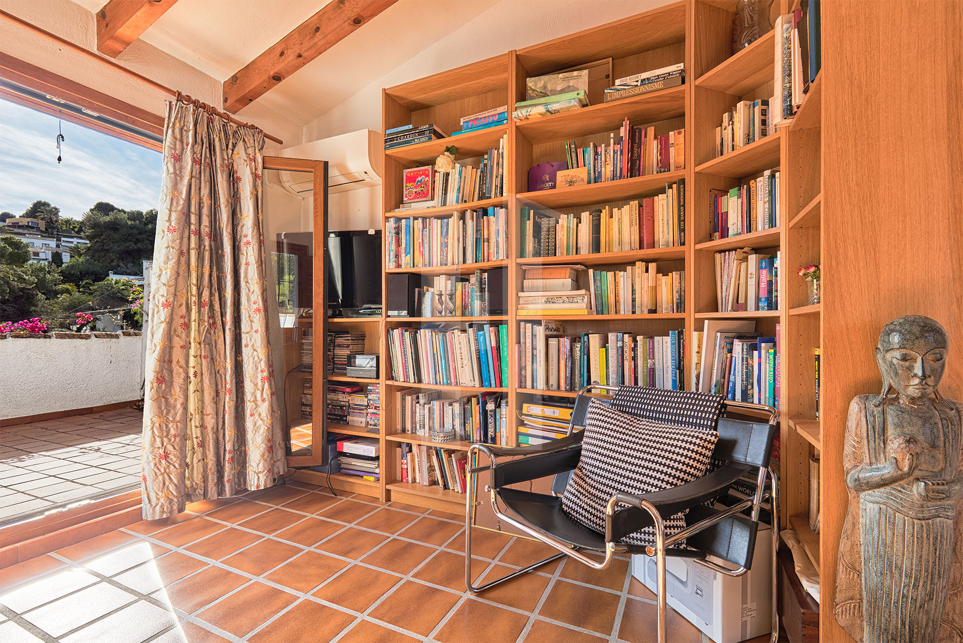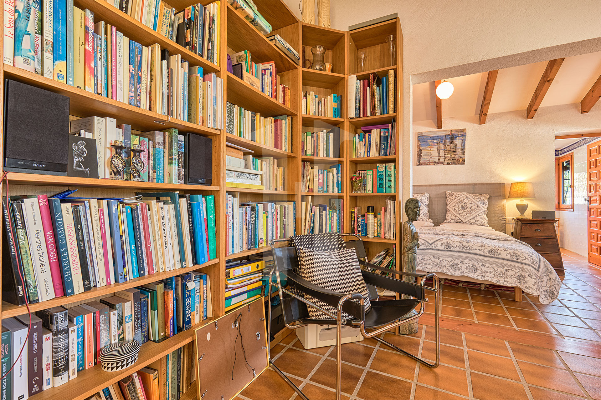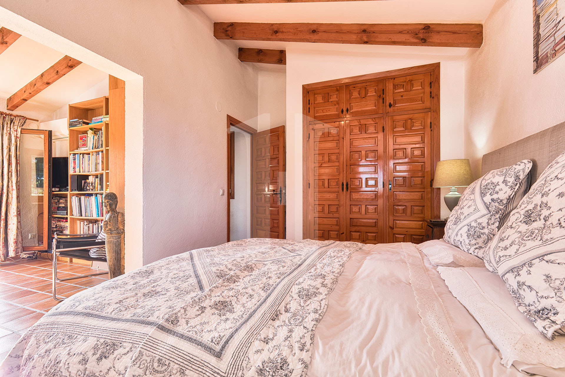 L’accès principal se fait par un élégant escalier décoré de carreaux espagnols traditionnels menant à une terrasse ensoleillée avec vue sur la piscine et le jardin. De là, on accède à la lumineuse Naya, parfaite pour un espace salon et salle à manger.