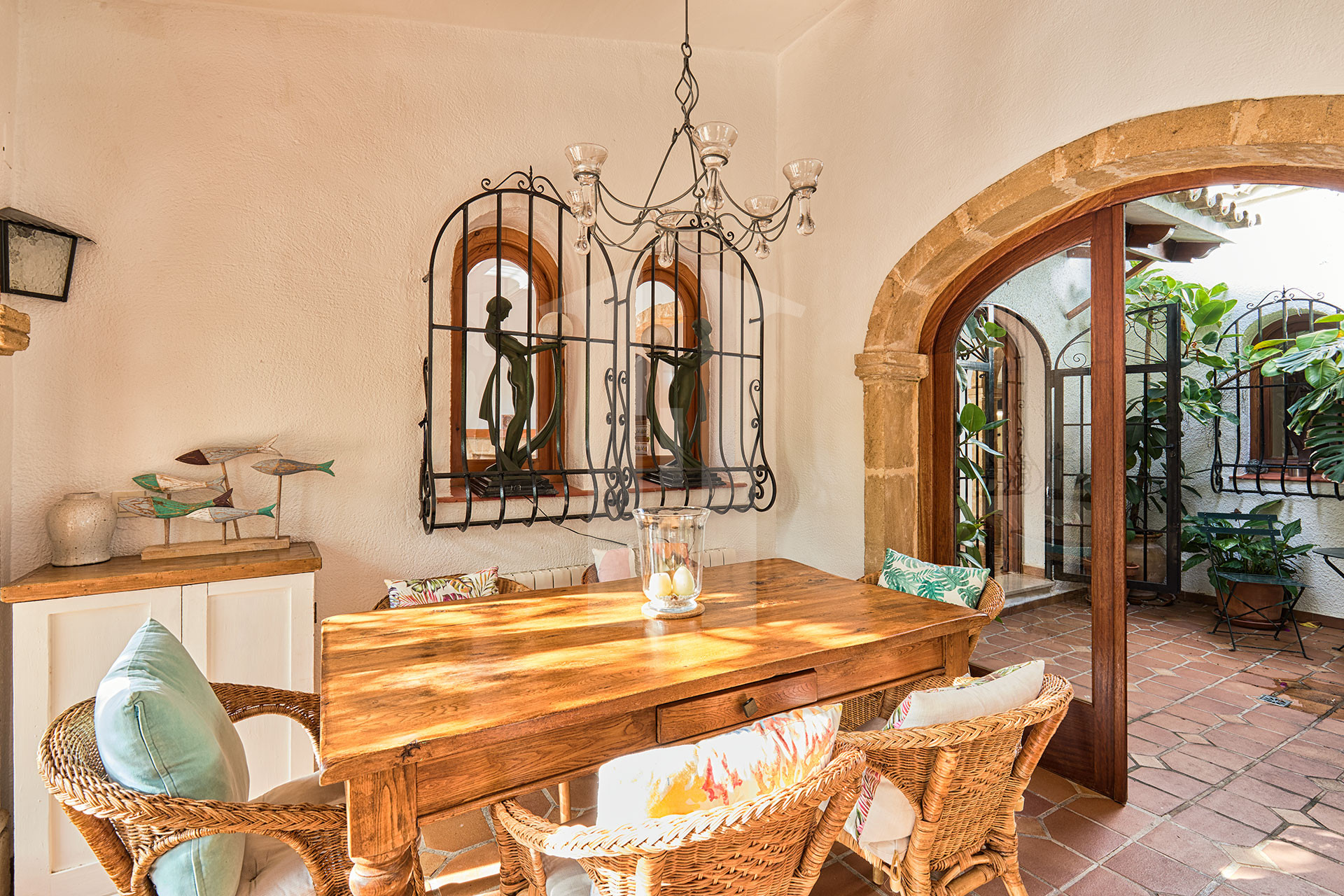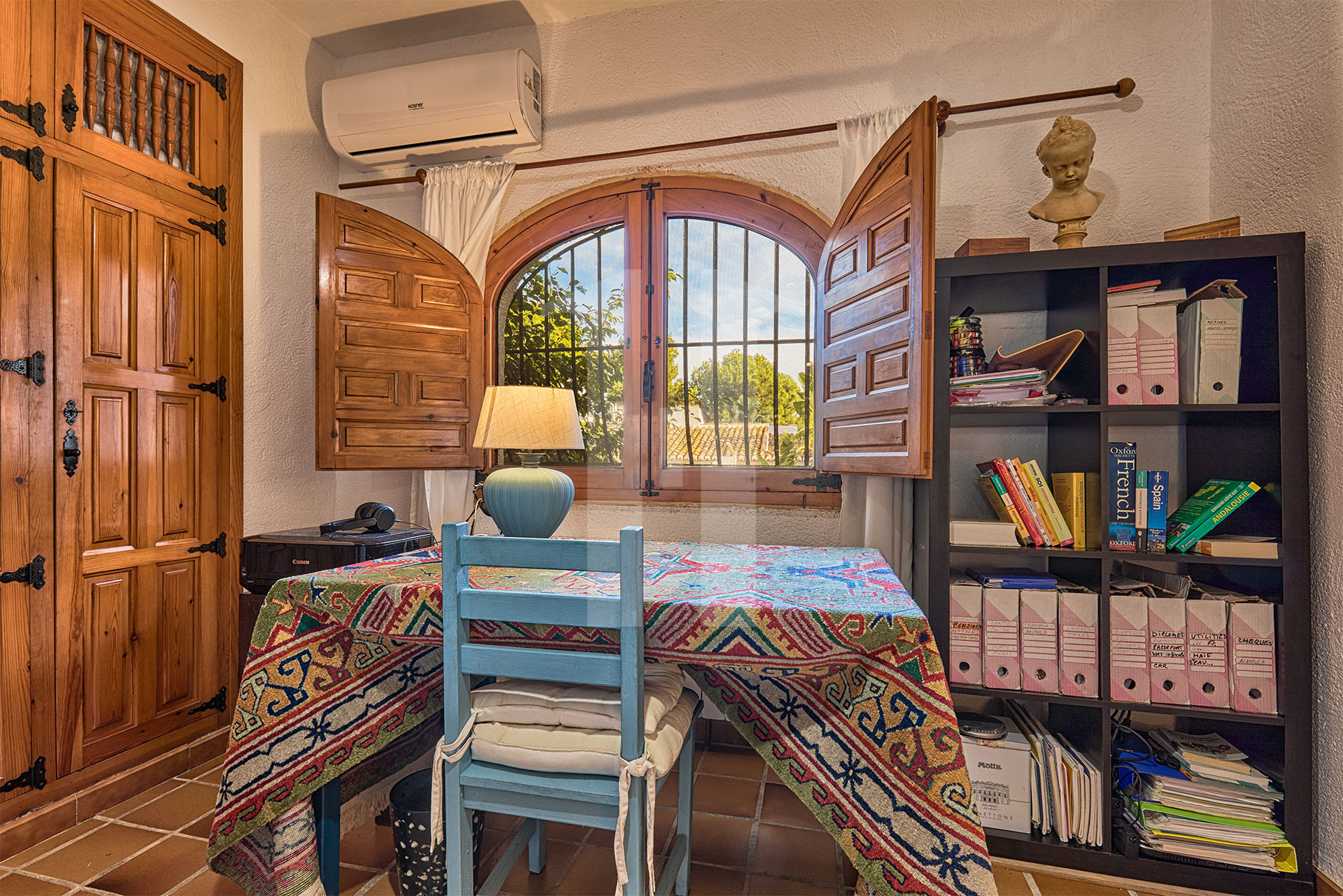 Construite en 1977, la villa séduit par ses éléments architecturaux d’origine : patio intérieur, poutres en bois, arches en pierre Tosca, volets traditionnels et sols carrelés typiques.