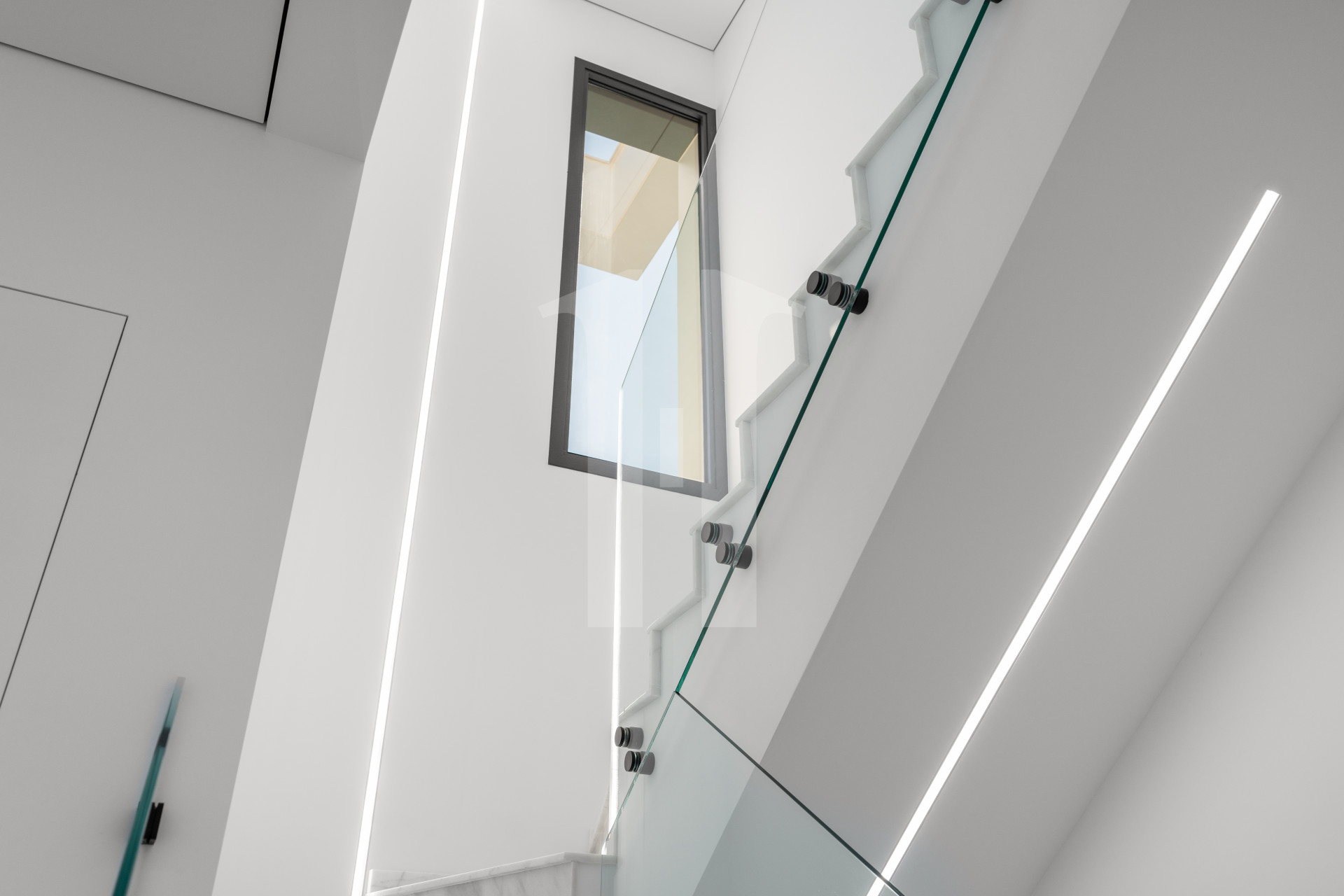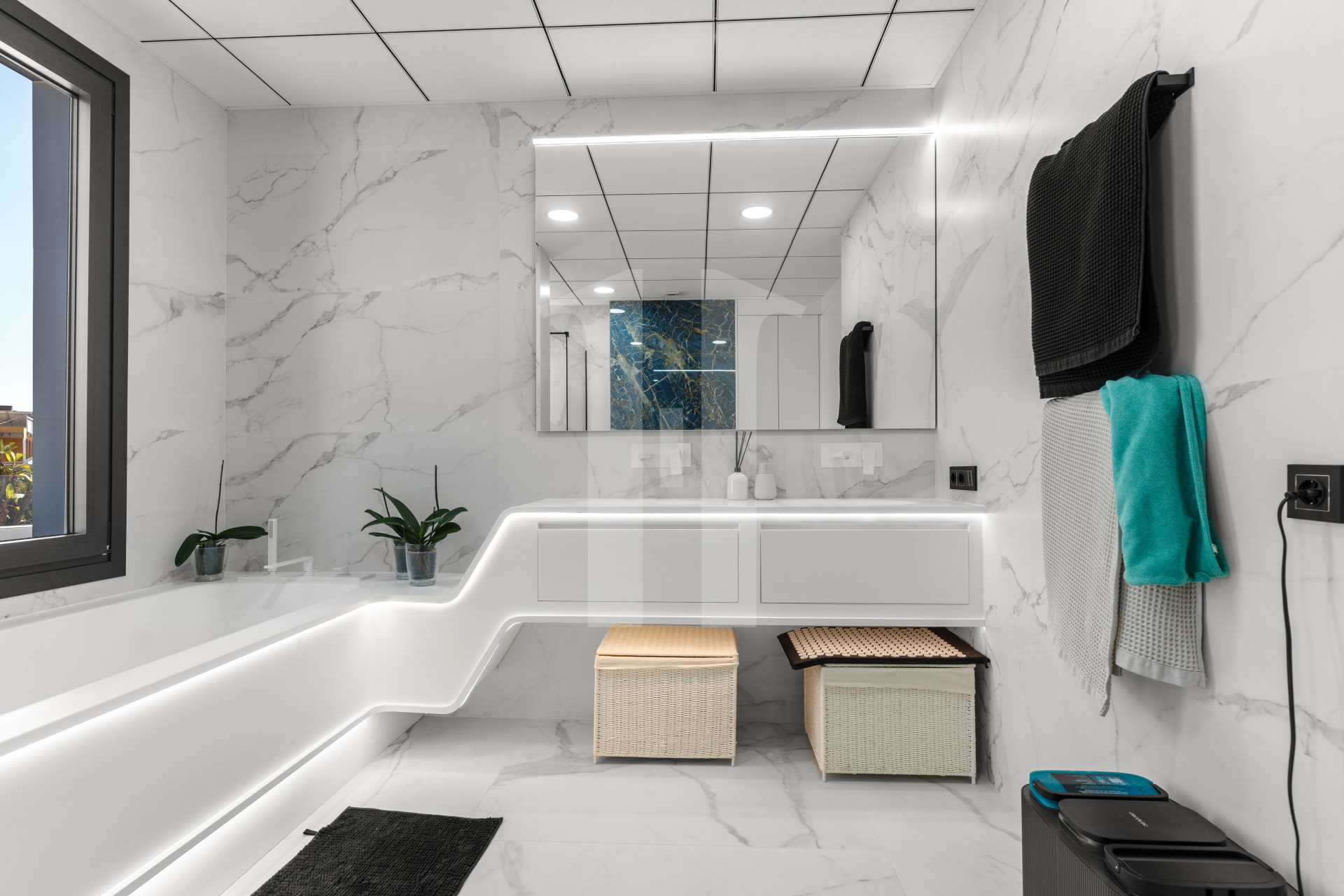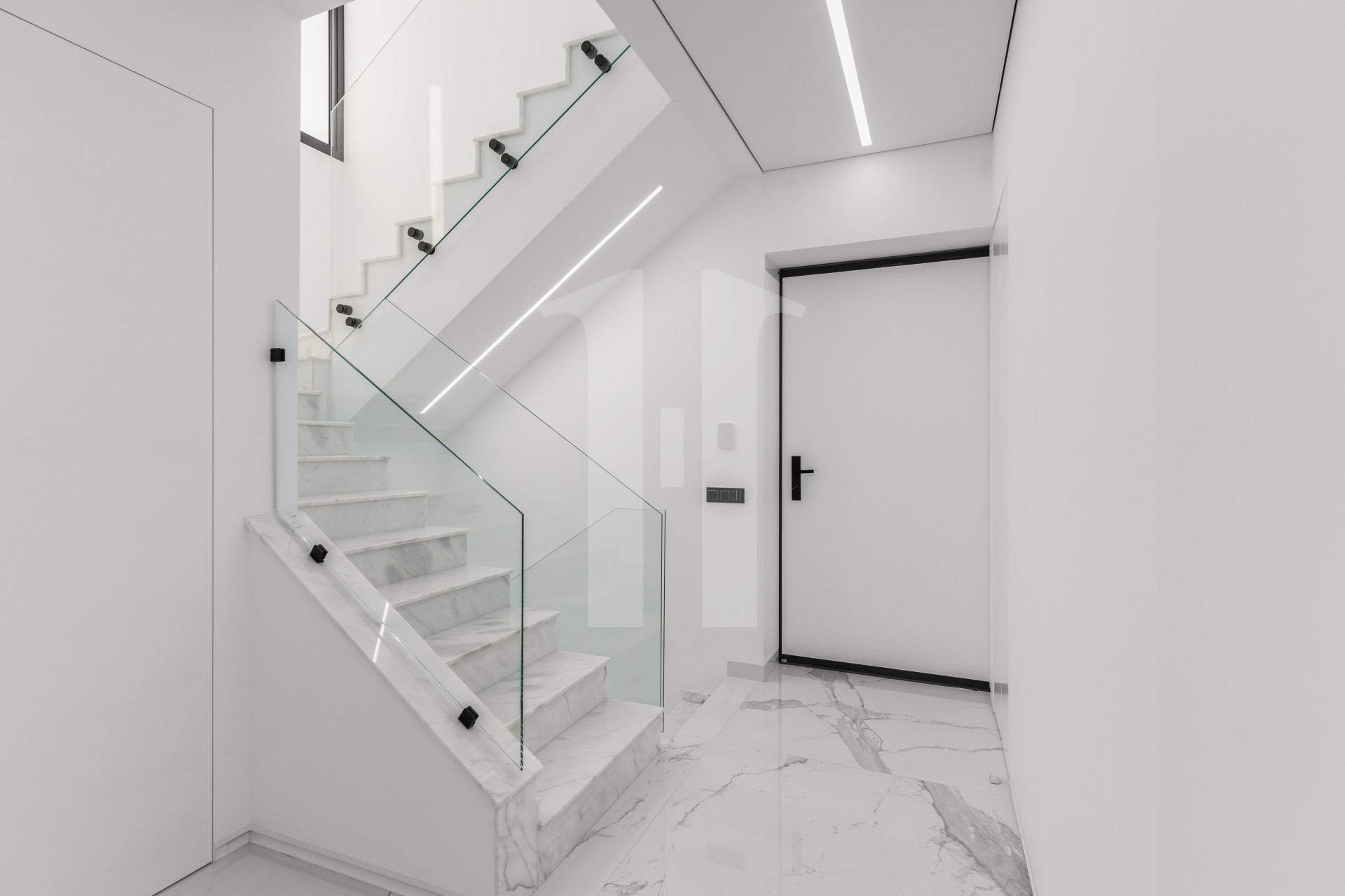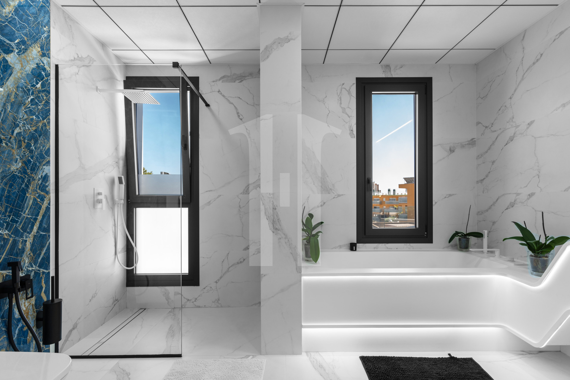 De begane grond beschikt over een open ruimte van meer dan 100 m² met de woonkamer, eetkamer en open keuken, uitgerust met AEG-apparatuur, wijnkast en kookeiland. Hoogwaardige afwerkingen, samen met een volledig domoticasysteem, vloerverwarming via aerothermische energie, zone-klimaatregeling en geautomatiseerde gordijnen, zorgen voor een moderne en efficiënte woonervaring.