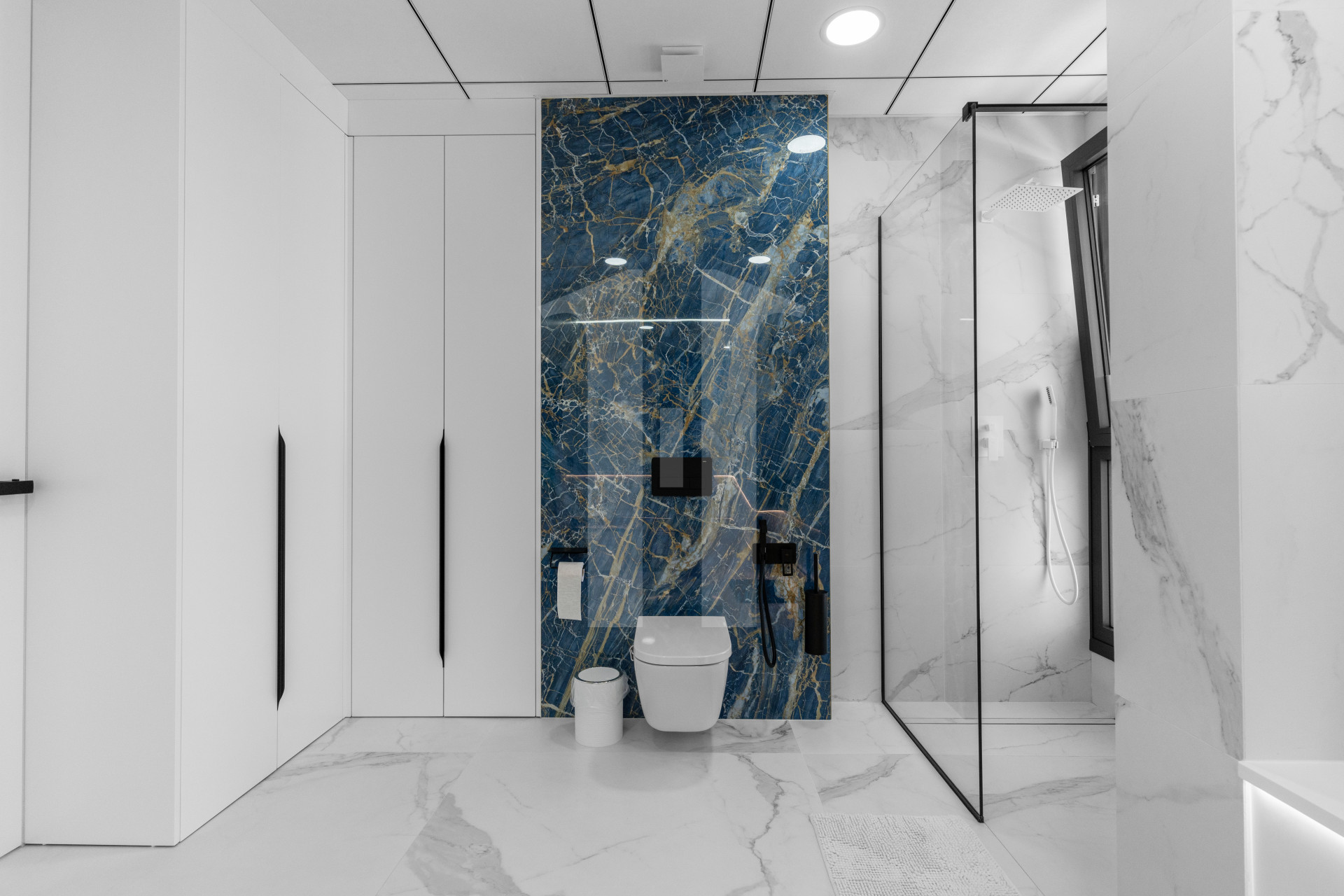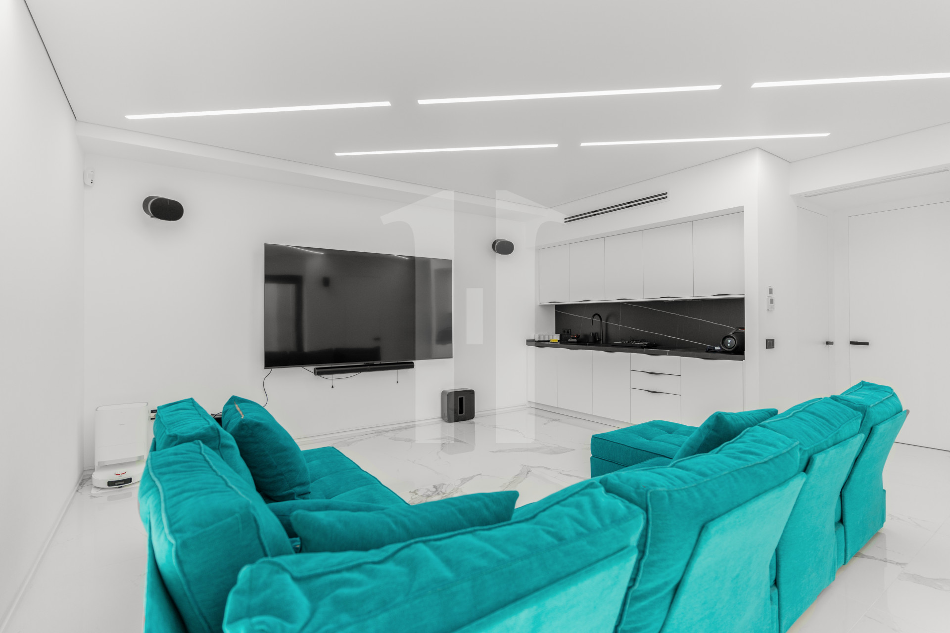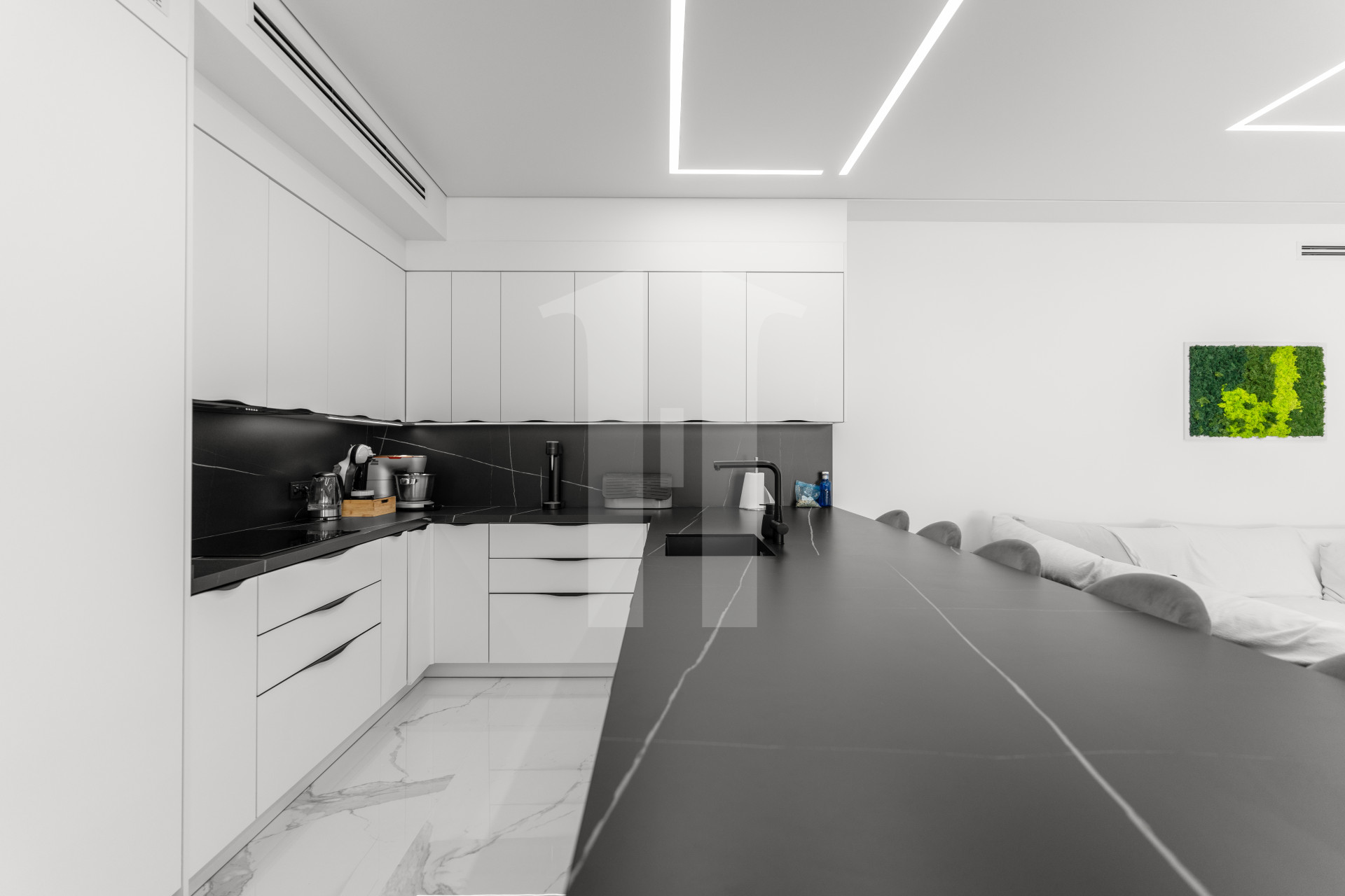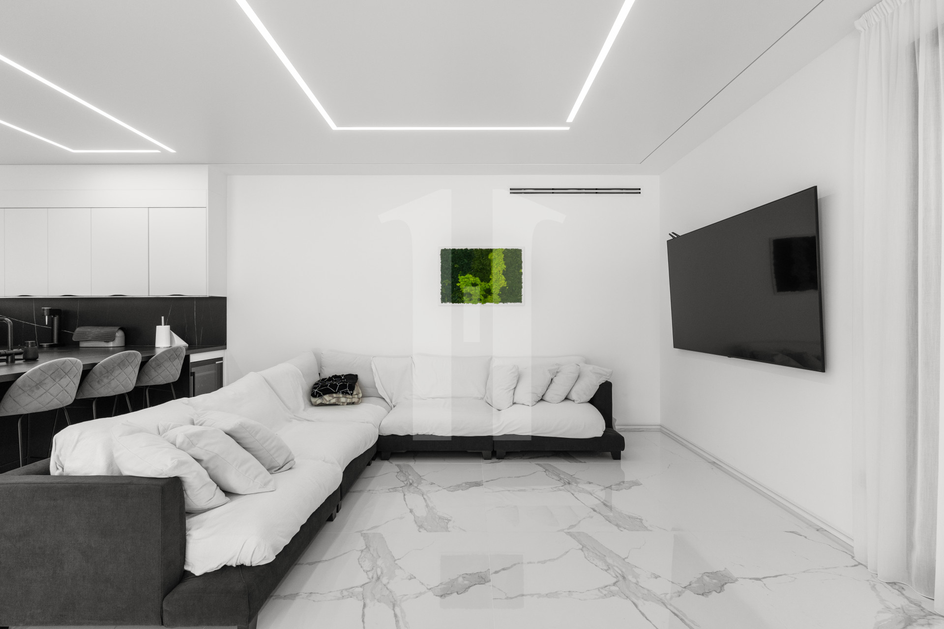 De begane grond beschikt over een open ruimte van meer dan 100 m² met de woonkamer, eetkamer en open keuken, uitgerust met AEG-apparatuur, wijnkast en kookeiland. Hoogwaardige afwerkingen, samen met een volledig domoticasysteem, vloerverwarming via aerothermische energie, zone-klimaatregeling en geautomatiseerde gordijnen, zorgen voor een moderne en efficiënte woonervaring.