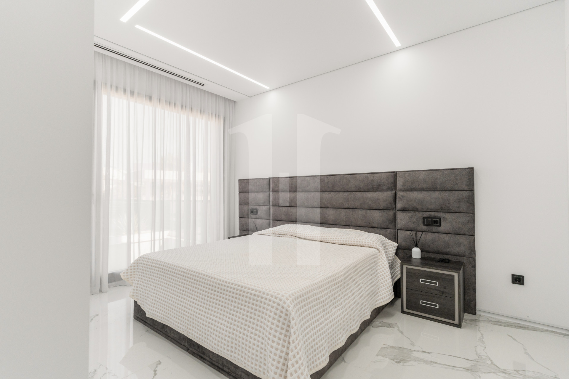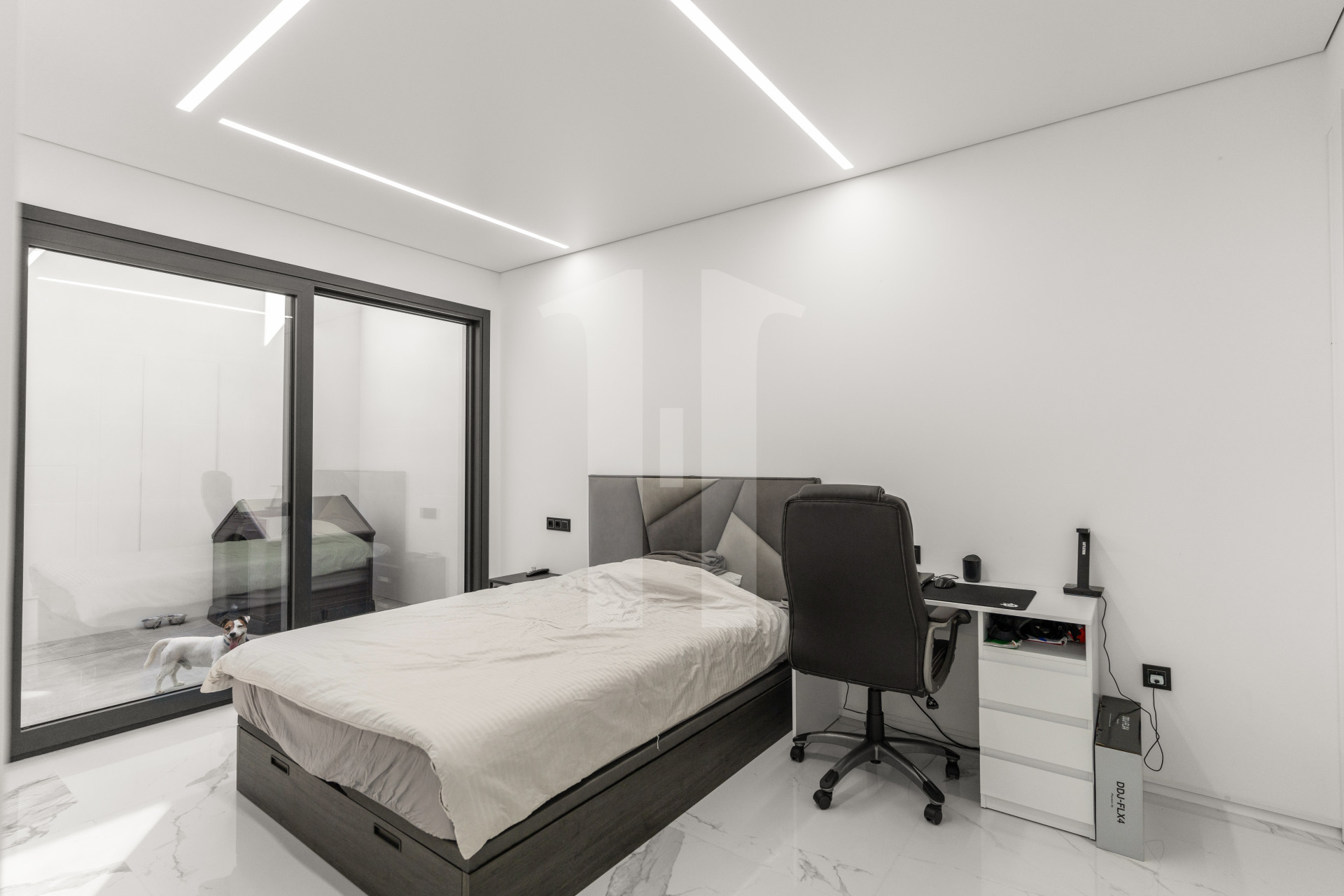 De bovenverdieping is volledig gewijd aan de mastersuite, met inloopkast, privébadkamer en een ruim terras met uitzicht op het park. De benedenverdieping biedt twee slaapkamers met eigen badkamer, een thuisbioscoop, tweede keuken en wasruimte, waardoor het een onafhankelijk gastenverblijf vormt.