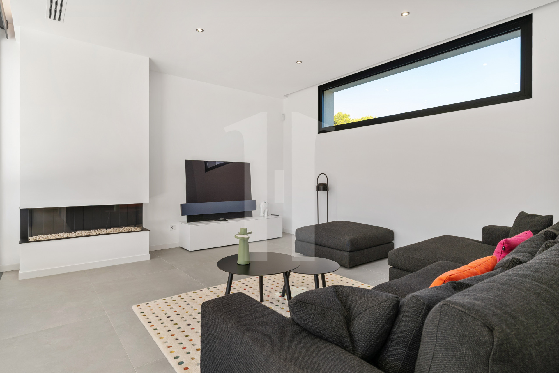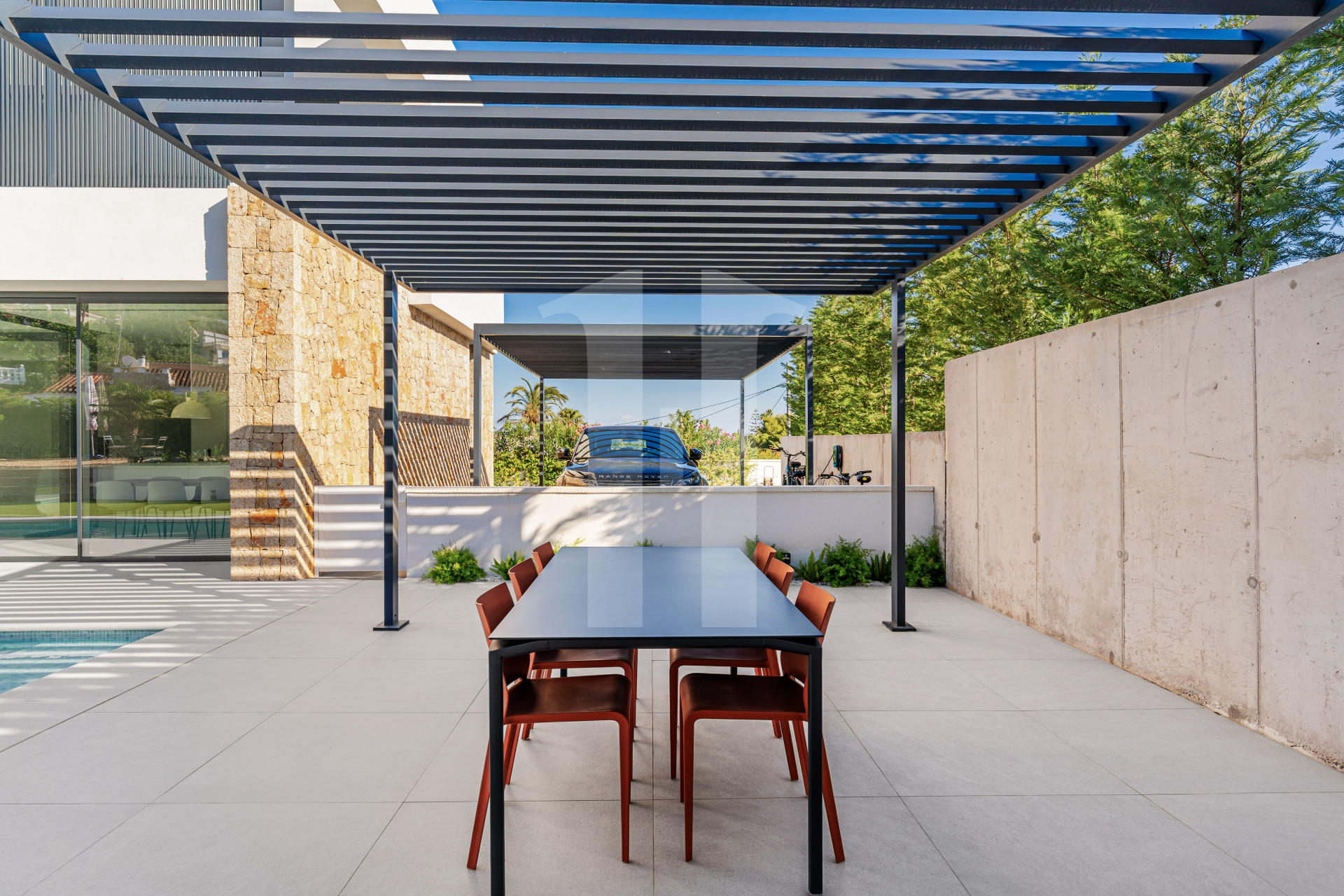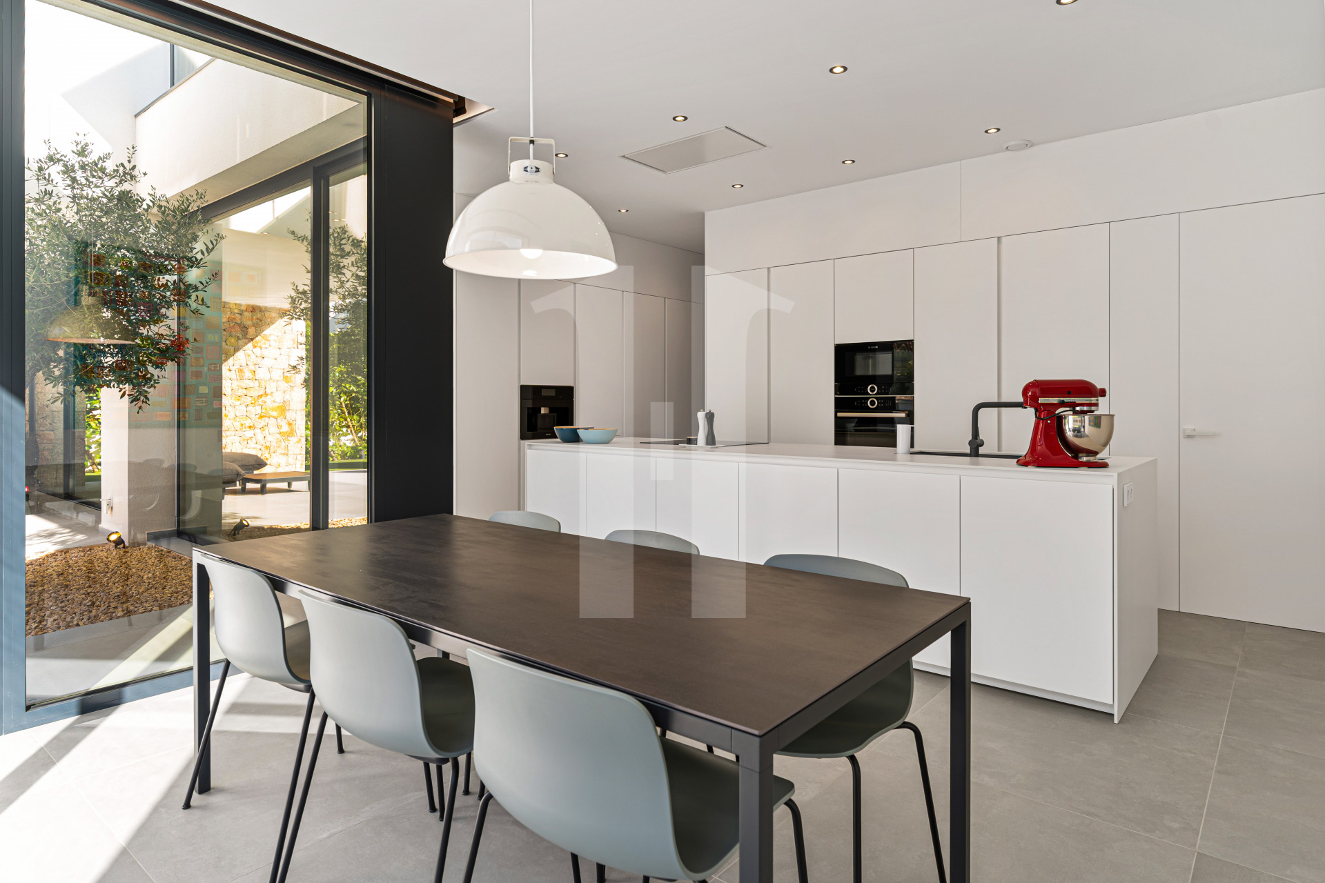 De villa valt op door haar lichtinval en ruimtegevoel, met vloer-tot-plafondramen van TECHNAL die het interieur naadloos verbinden met de terrassen en de tuin, en die een prachtig uitzicht bieden op de zee, de Montgó en het kasteel van Dénia.