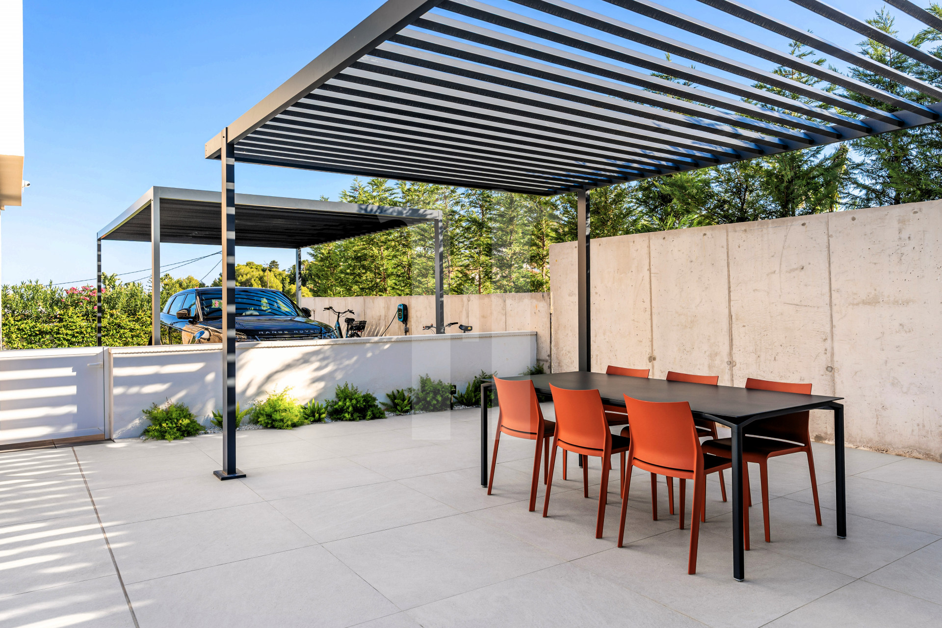 Op de begane grond bevindt zich een open leefruimte met gashaard, eetgedeelte en een designkeuken uitgerust met BOSCH– en MIELE-apparatuur, naast een bijkeuken, wasruimte en gastentoilet. De buitenruimte is een waar mediterraan toevluchtsoord, met een verwarmd zwembad met zout-elektrolysesysteem, een onderhoudsarme tuin met fruitbomen, een zomerkeuken, eetgedeelte onder een pergola, een petanquebaan en een imposante olijfboom die ’s avonds sfeervol wordt verlicht. Er is tevens een carport met elektrische laadpaal en extra parkeerruimte voor meerdere voertuigen.