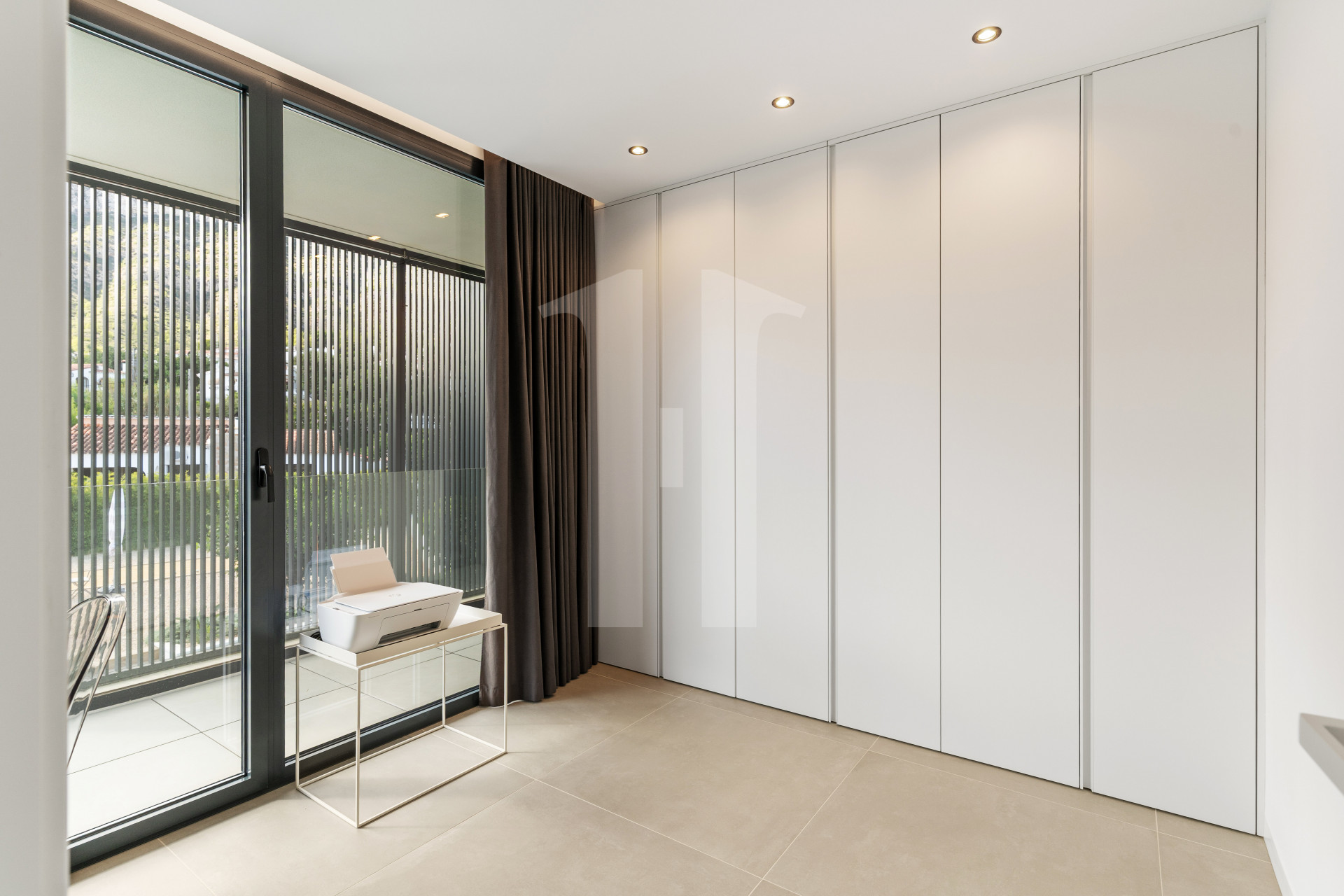 Het benedenniveau, verlicht door een binnenpatio, beschikt over een onafhankelijk appartement dat momenteel als fitnessruimte wordt gebruikt, maar eenvoudig kan worden omgevormd tot een derde of vierde slaapkamer met eigen toegang.