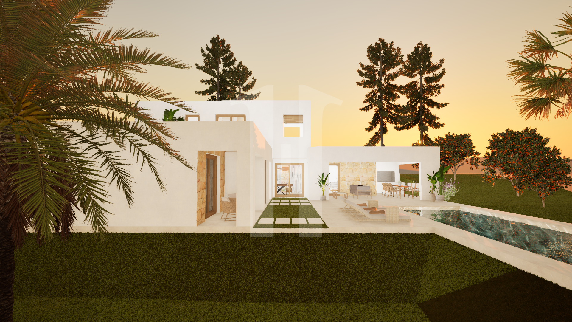 Met een witte gevel met vloeiende lijnen en afgeronde hoeken, versterkt door de natuurlijke schoonheid van handgeslepen Montgó-stenen met subtiele roodachtige tinten. Het mediterrane ontwerp nodigt uit tot bezinning en genot in elke ruimte. Microcement, gebruikt in zowel de badkamers als de vloeren binnen, combineert naadloos met roestkleurige aluminium ramen met dubbele beglazing voor een sfeer van luxe en comfort….