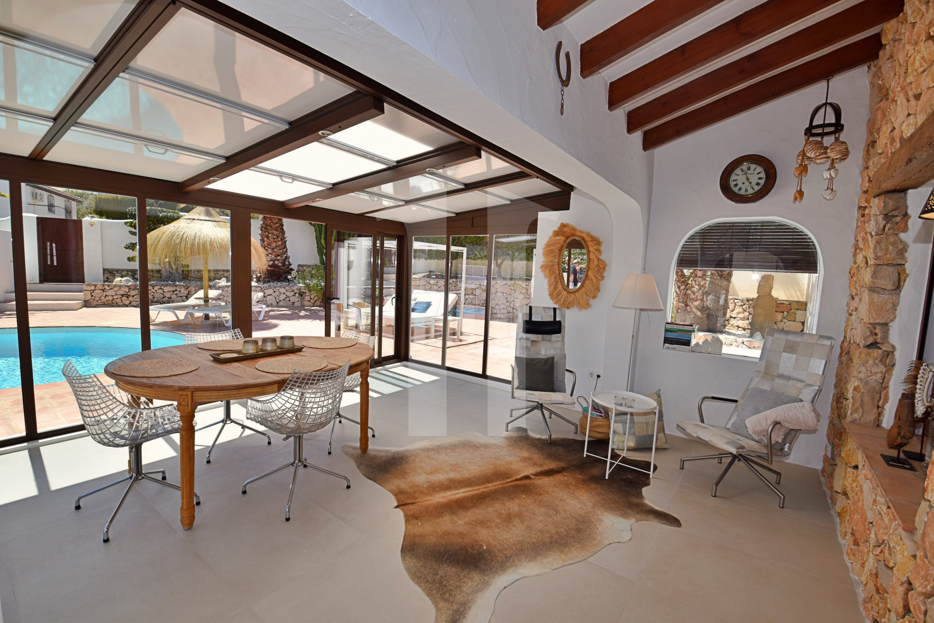Zowel de glazen als de open terrassen nodigen u uit om te ontspannen en bieden een schilderachtig uitzicht op het zwembad en de weelderige tuin rondom het pand.