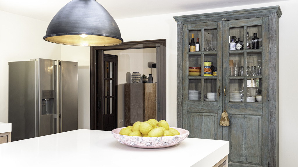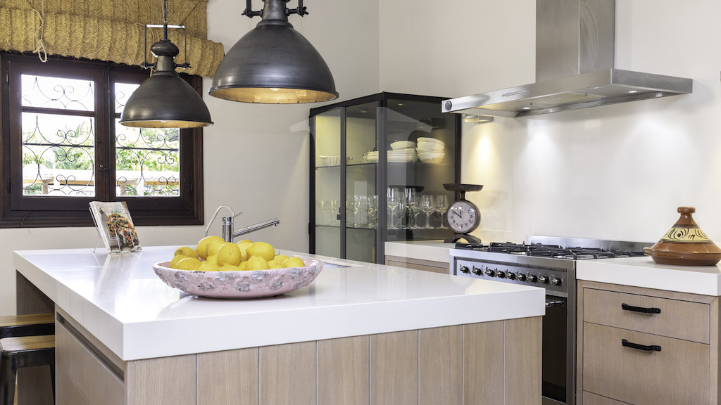 La cocina, espaciosa y elegante, consta de una gran isla (con barra americana) , una estancia diseñada en un estilo moderno y rústico. Es una hermosa combinación, con elegantes frentes de madera maciza y una encimera de composite blanco roto. Junto a la cocina hay un amplio porche. Es un impresionante espacio al aire libre con capacidad para muchas personas. Aquí podrá disfrutar de las zonas verdes de los alrededores y del Montgó, la famosa "Casa Montaña" de Jávea.