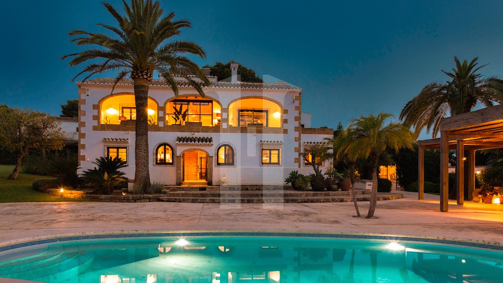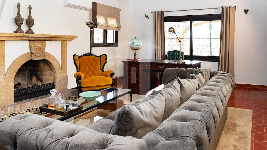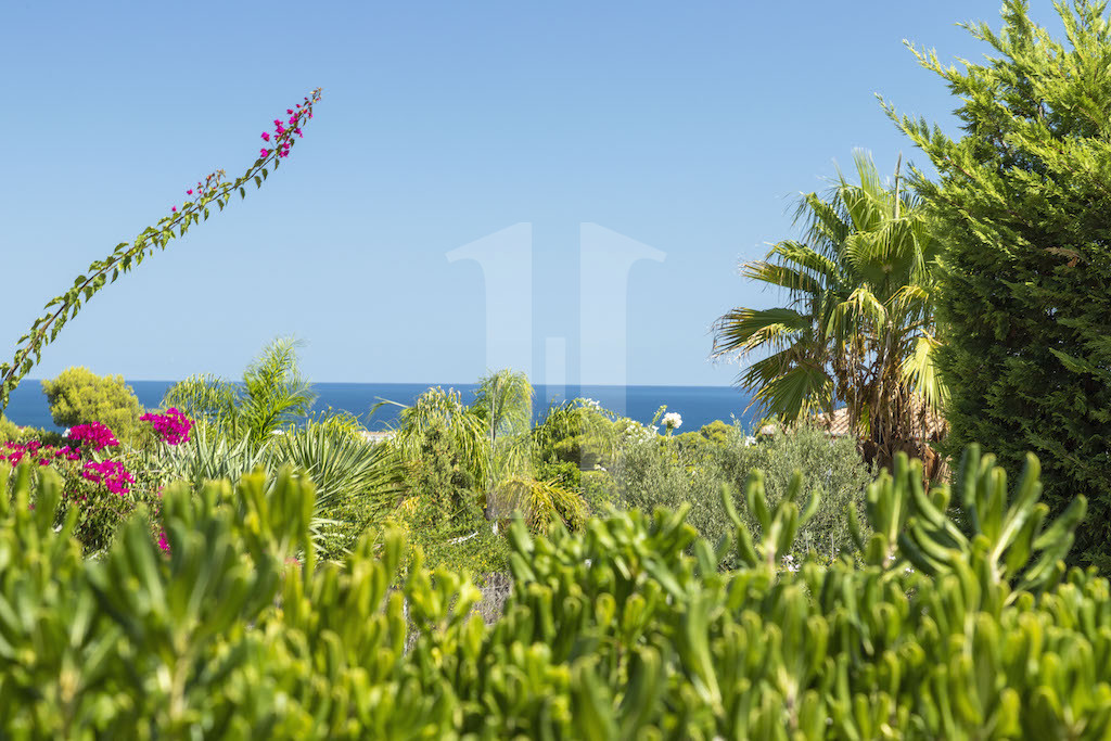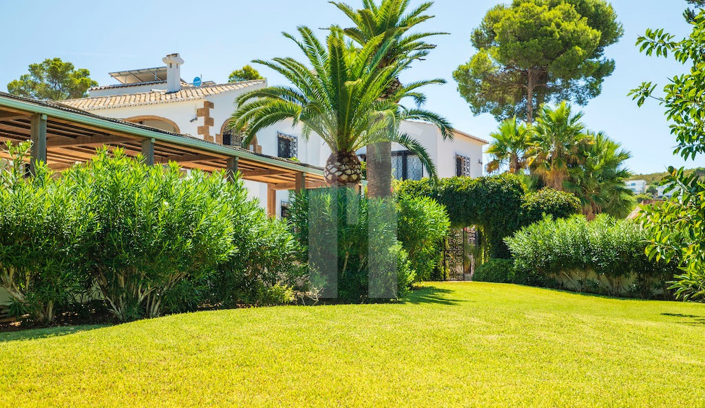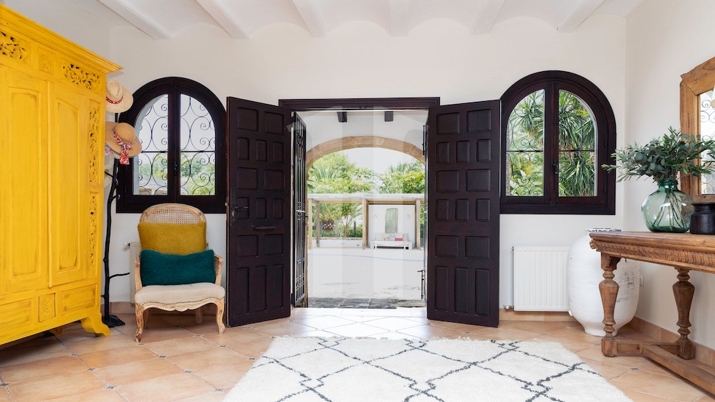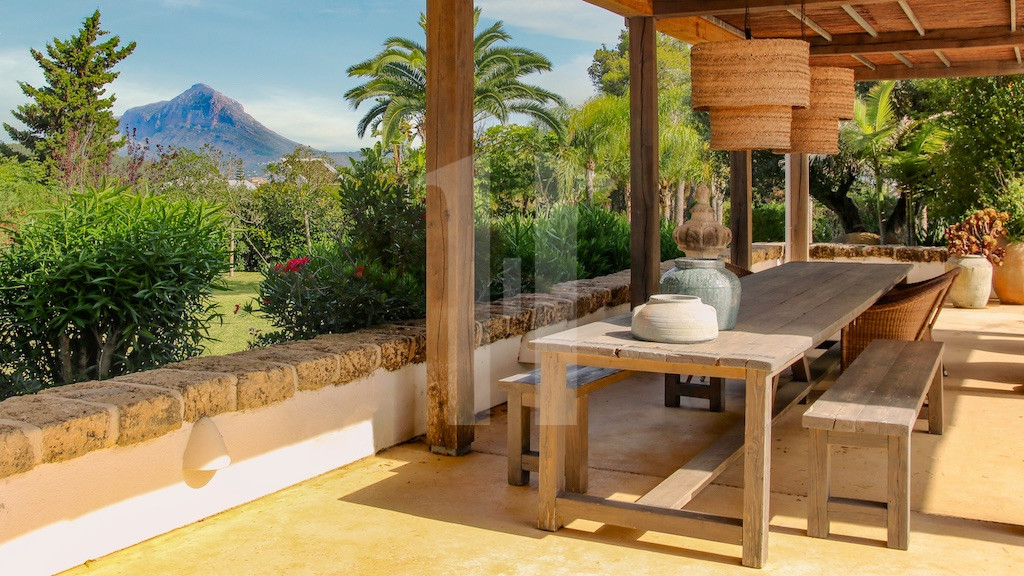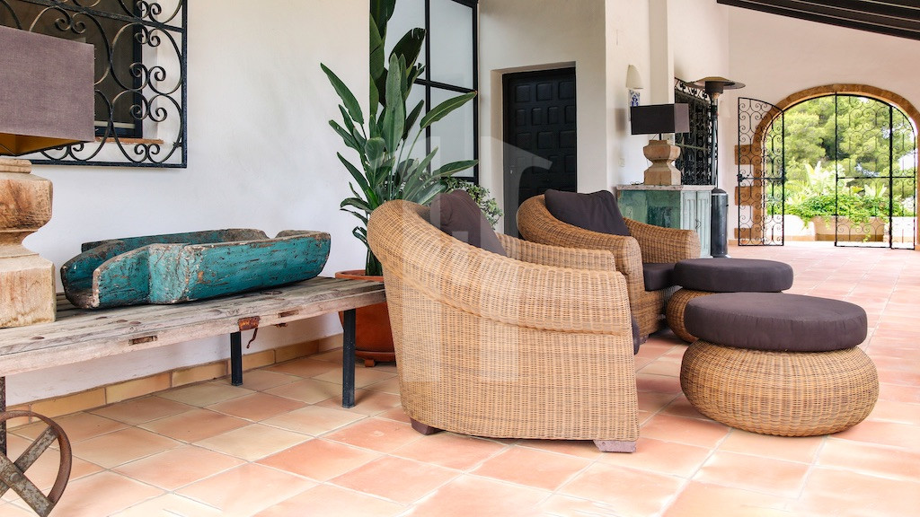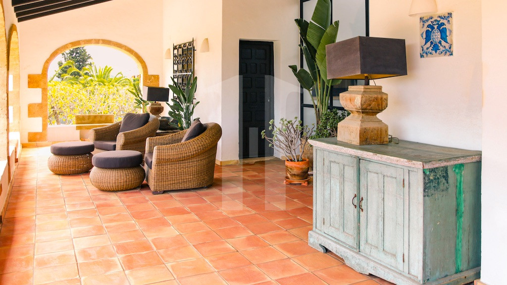 La "Naya", o terraza cubierta con arcos que se extiende por toda la parte delantera de la villa, es encantadora. Este generoso espacio está separado del hueco de la escalera por una pared de cristal. Es fantástico poder sentarse a resguardo aquí, con una magnífica vista del paisaje que rodea Jávea, incluida la "montaña de la casa", el Montgó, y un pequeño trozo del mar Mediterráneo.