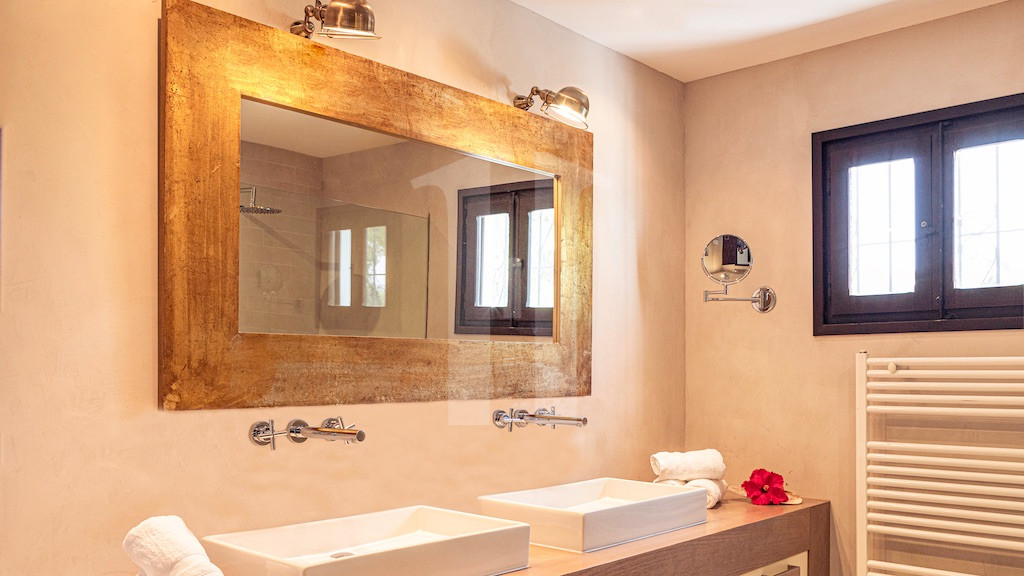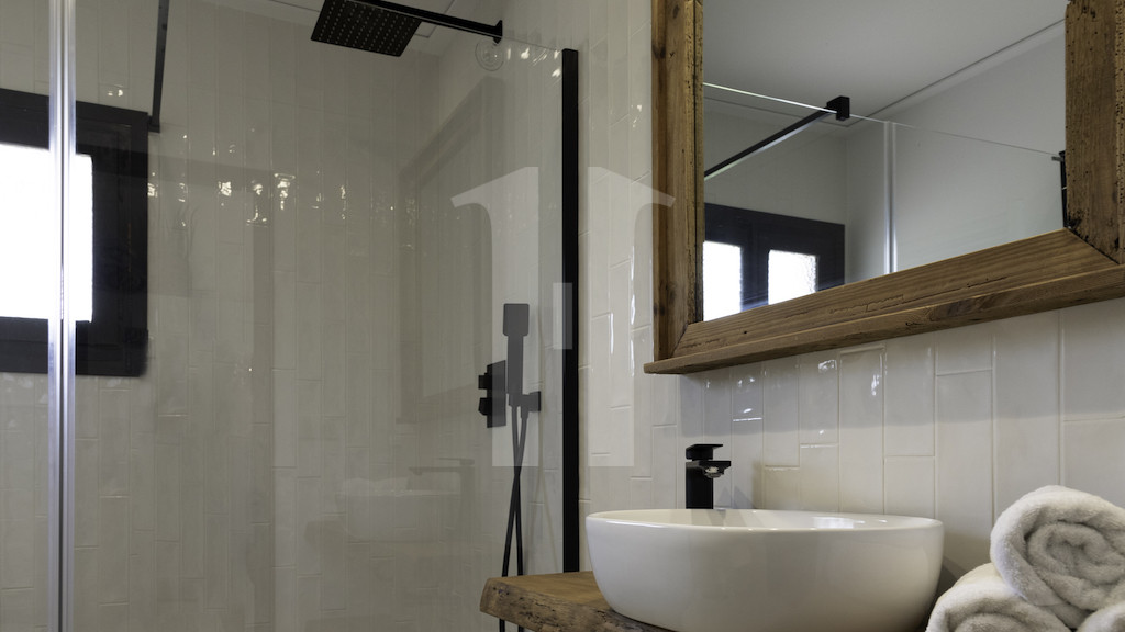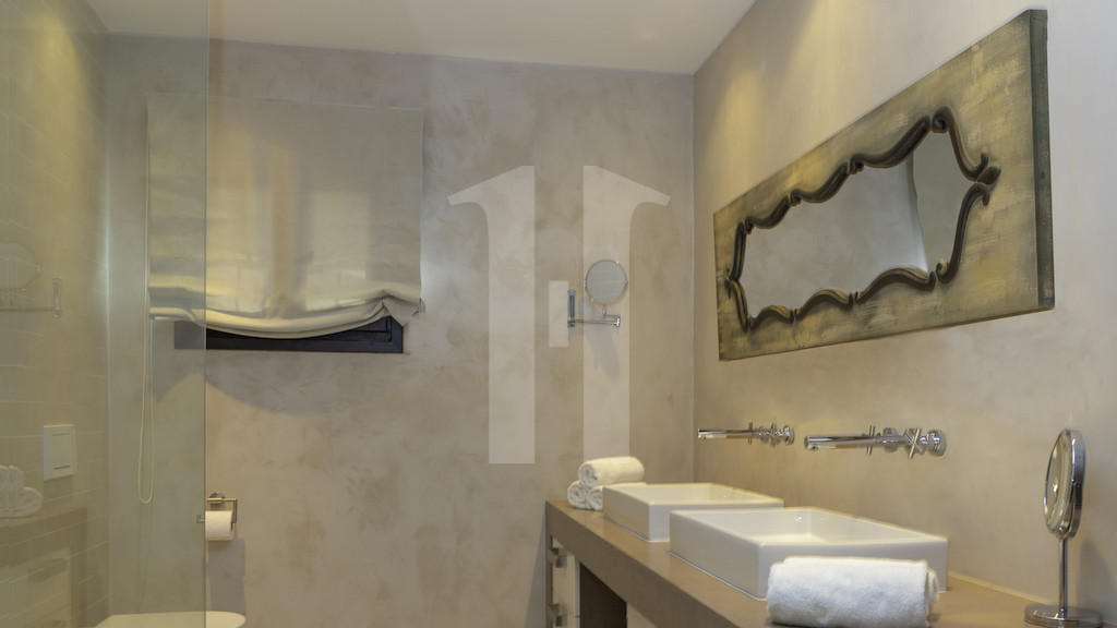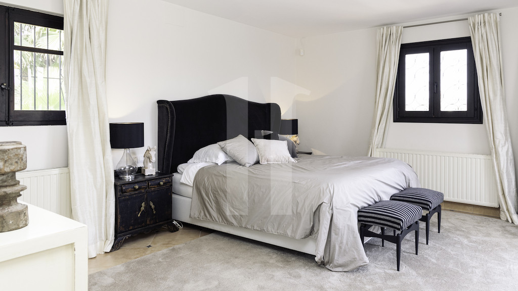 Esta villa cuenta con abundantes dormitorios. Mientras que en la planta baja vimos un total de dos amplios dormitorios y una sala de estar/dormitorio, la planta superior cuenta con tres dormitorios más espaciosos. El lavadero, algo más pequeño, puede utilizarse como cuarto dormitorio. Un elegante cuarto de baño (compartido) linda con el amplio rellano. Cuenta con un lavabo doble con mueble, una ducha a ras de suelo y un inodoro. Realmente contemporáneo en todos los sentidos. El generoso dormitorio principal cuenta con un cuarto de baño privado, también equipado con un lavabo doble con tocador, una ducha a ras de suelo y un inodoro. Por supuesto, está diseñado en el mismo estilo, pero con una característica adicional: calefacción eléctrica por suelo radiante. Las puertas francesas dobles de esta espaciosa zona de dormitorio dan a una fantástica terraza cubierta con vistas al faro de Jávea.