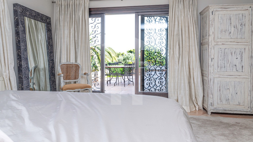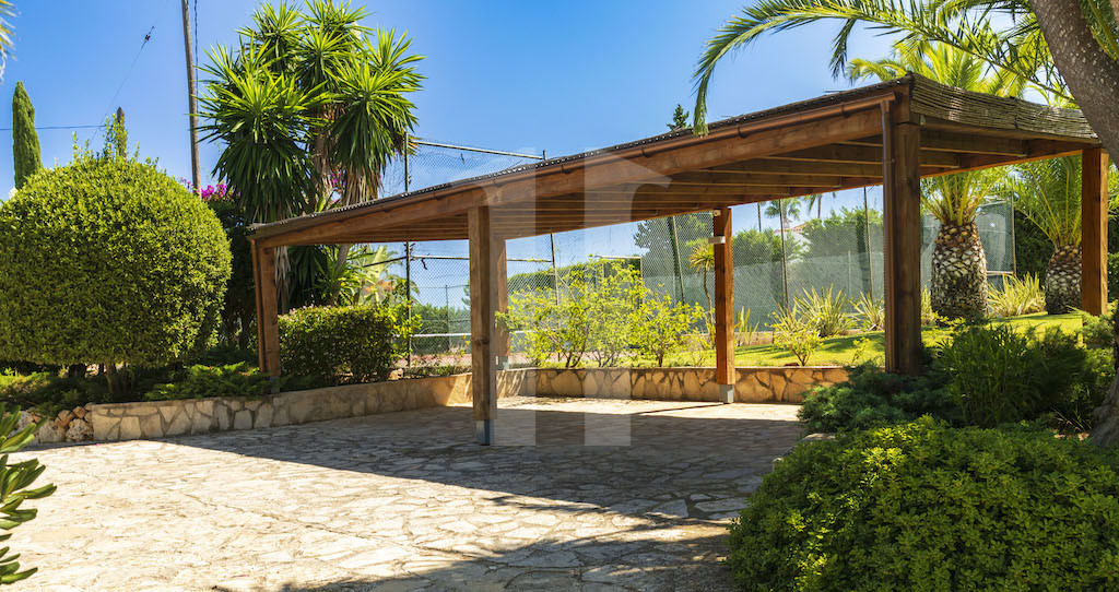 La piscina, con ducha exterior, habla por sí sola. La piscina está rodeada por un amplio borde de piedra natural de color claro. Mucho espacio para tomar el sol. Es un lugar con mucha intimidad, con el telón de fondo de las palmeras y la auténtica fachada española de la villa. Y además, en el "patio trasero", hay una pista de tenis. Deporte en su propia propiedad, sin duda.