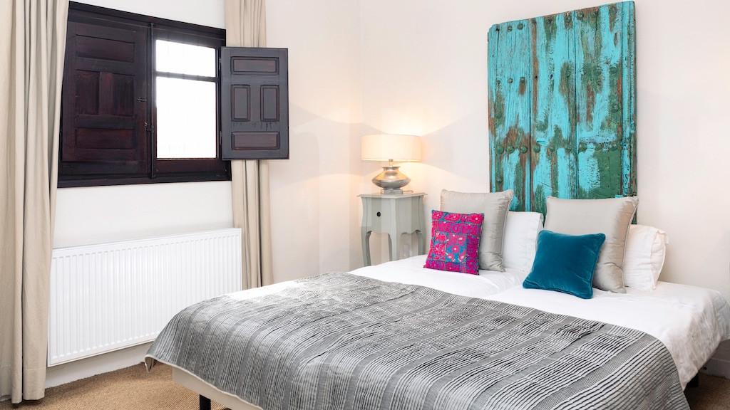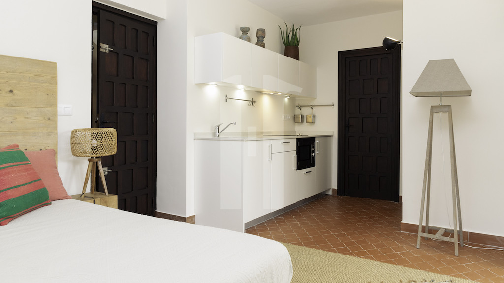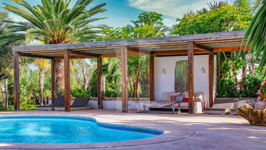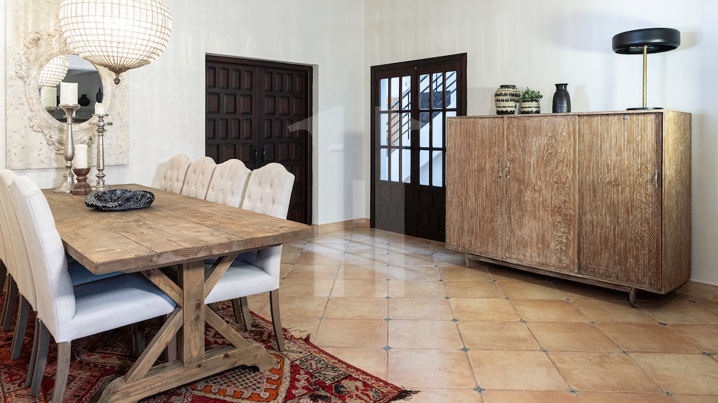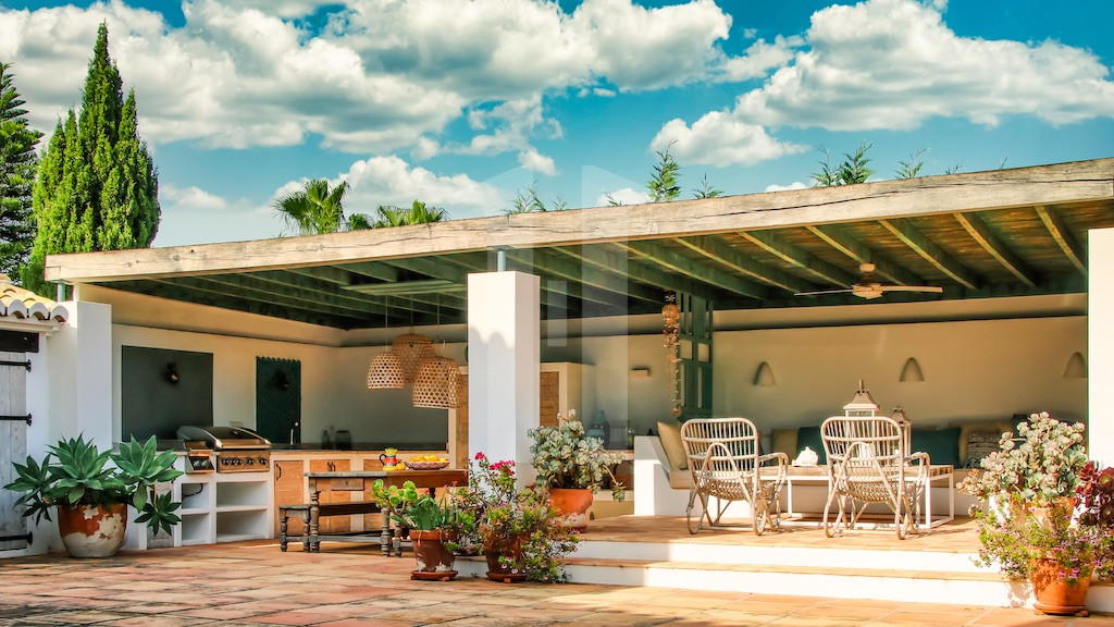Estar al aire libre es lo que se busca en un país como España, ¿verdad? , mientras algunos nunca tienen suficiente sol, otros prefieren buscar la sombra. Para ello están los robustos toldos de madera a ambos lados de la piscina. "También mandamos construir una cocina exterior, con el mismo estilo de hacienda. Era un deseo nuestro". La espaciosa cocina exterior, situada junto a la villa, está equipada con una barbacoa XL y dos quemadores de gas. Y, por supuesto, una zona de fregadero. Los huéspedes pueden reunirse en torno a una gran mesa de madera. La cocina exterior también cuenta con una acogedora zona de estar donde relajarse.