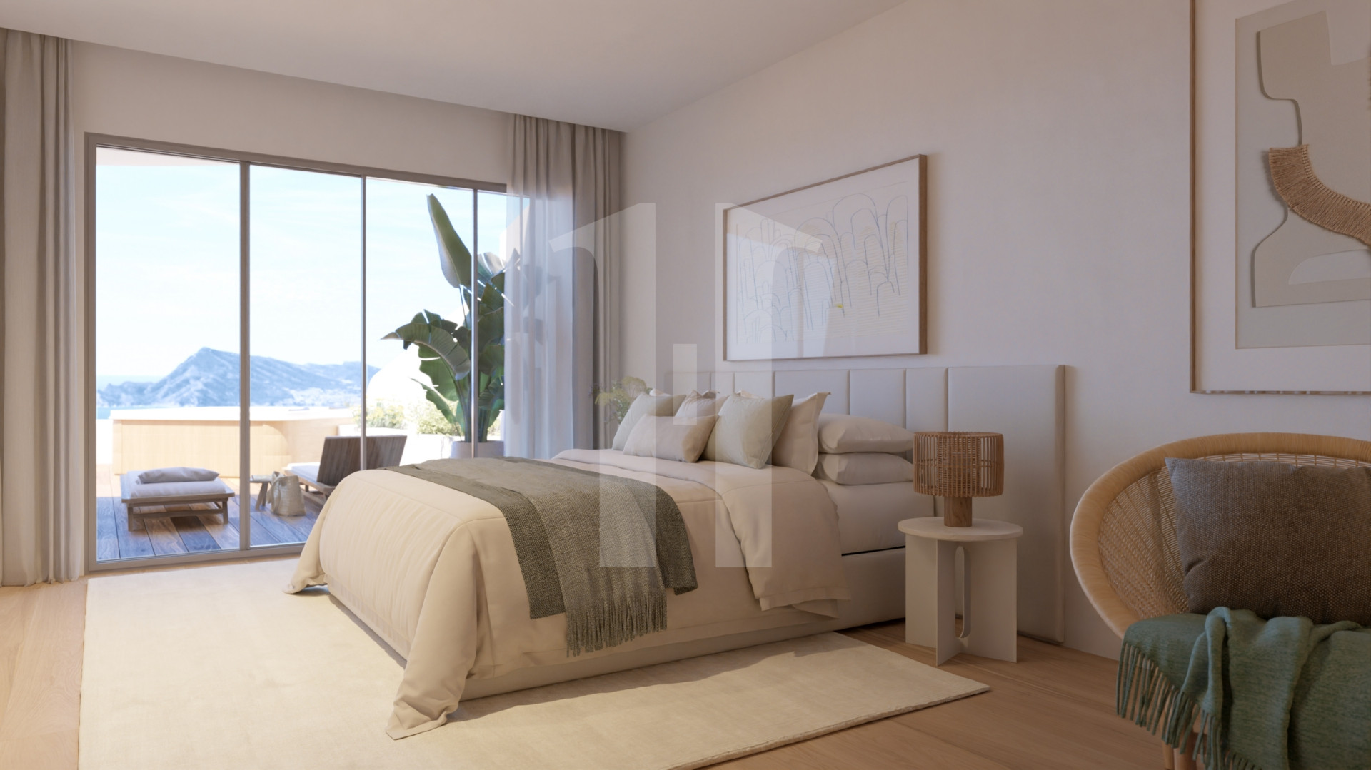 Cada vivienda tiene un total de 3 dormitorios, con amplios armarios empotrados totalmente equipados y un espacioso cuarto de baño de uso exclusivo, con ducha y bañera exenta. El dormitorio principal de aproximadamente 51 m² dispone de un espacioso vestidor y cuarto de baño en suite, también con ducha y bañera. Los 3 dormitorios disponen de acceso directo a la terraza y disfrutan de fantásticas vistas al mar.