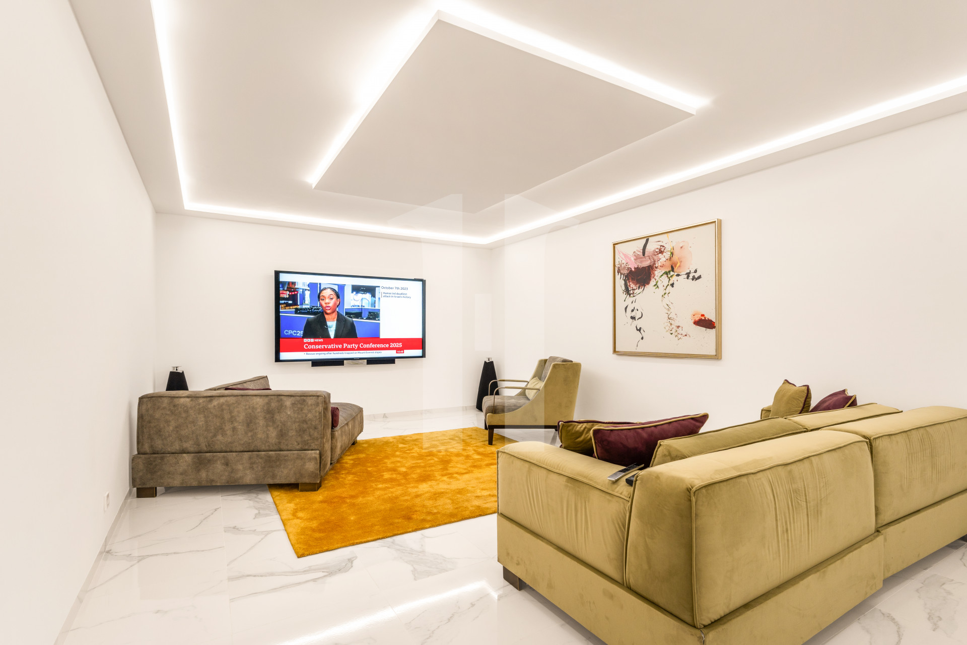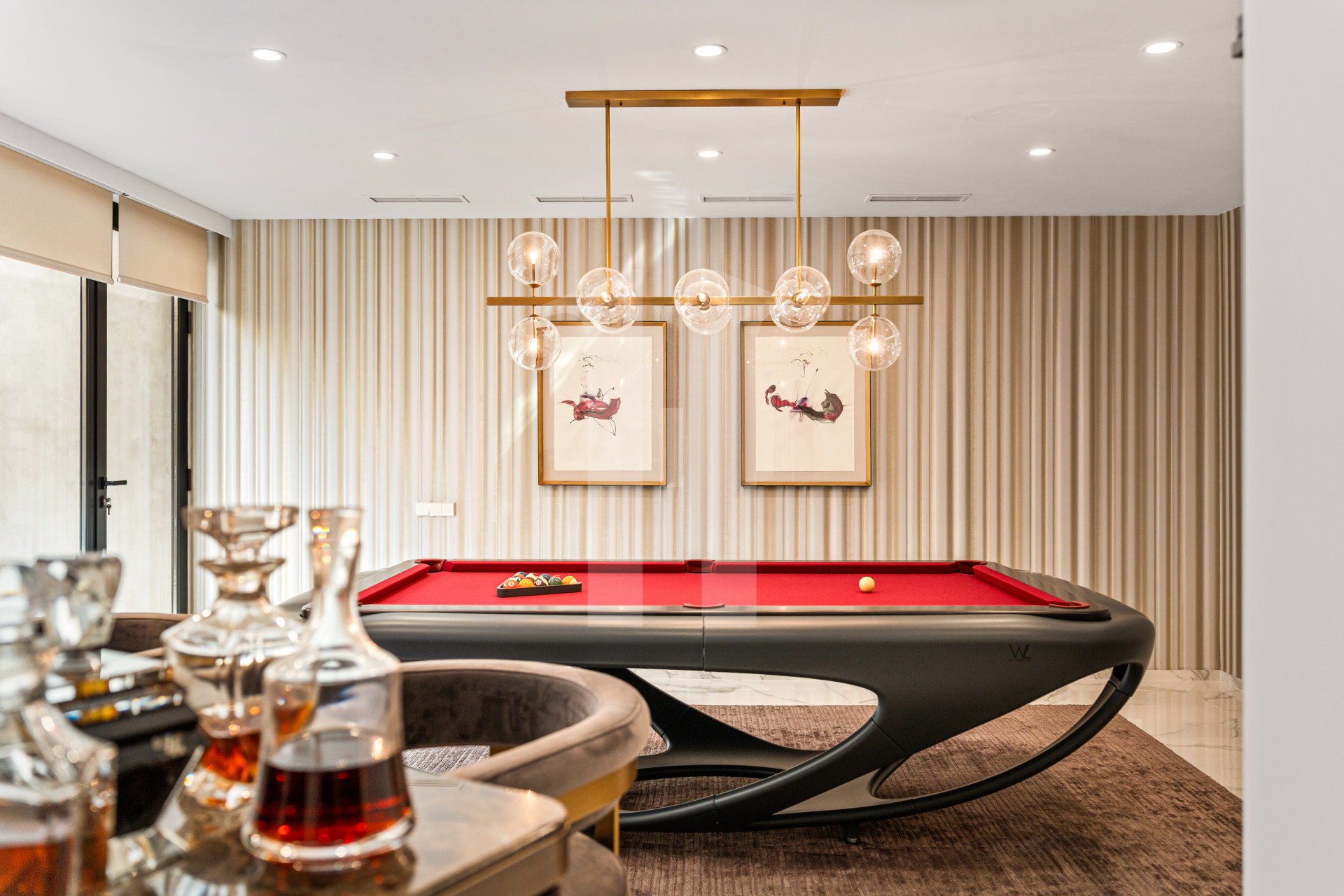 Los interiores destacan por su luminosidad y fluidez, con paredes de vidrio retráctiles que integran el espacio interior con las terrazas y jardines. El salón-comedor con chimenea de doble cara y la cocina abierta —equipada con electrodomésticos Miele y mobiliario Doca— forman el corazón de la casa. En esta planta también se encuentra un salón de lectura, un aseo, un apartamento independiente y un garaje cerrado para tres vehículos con punto de carga eléctrica.