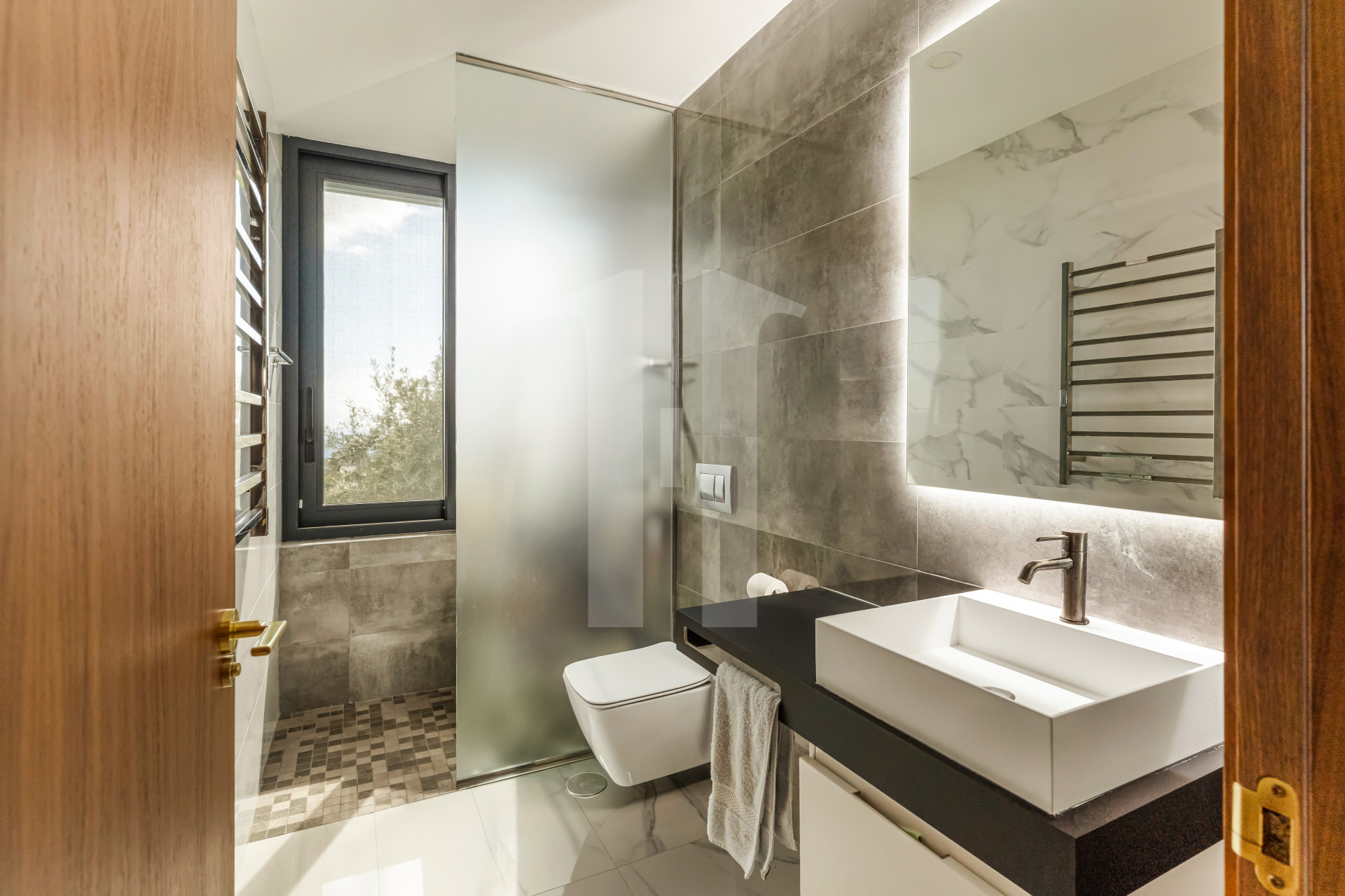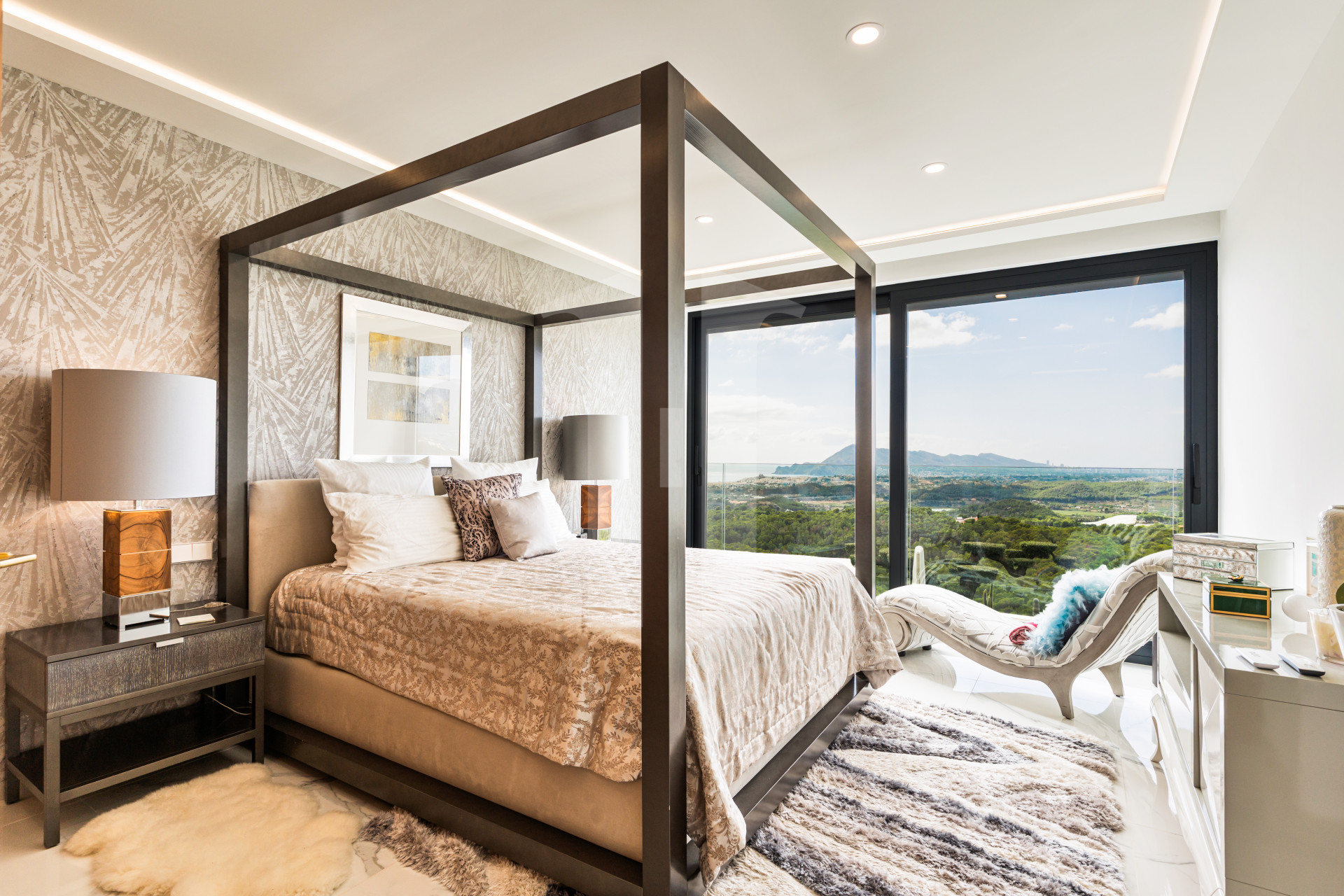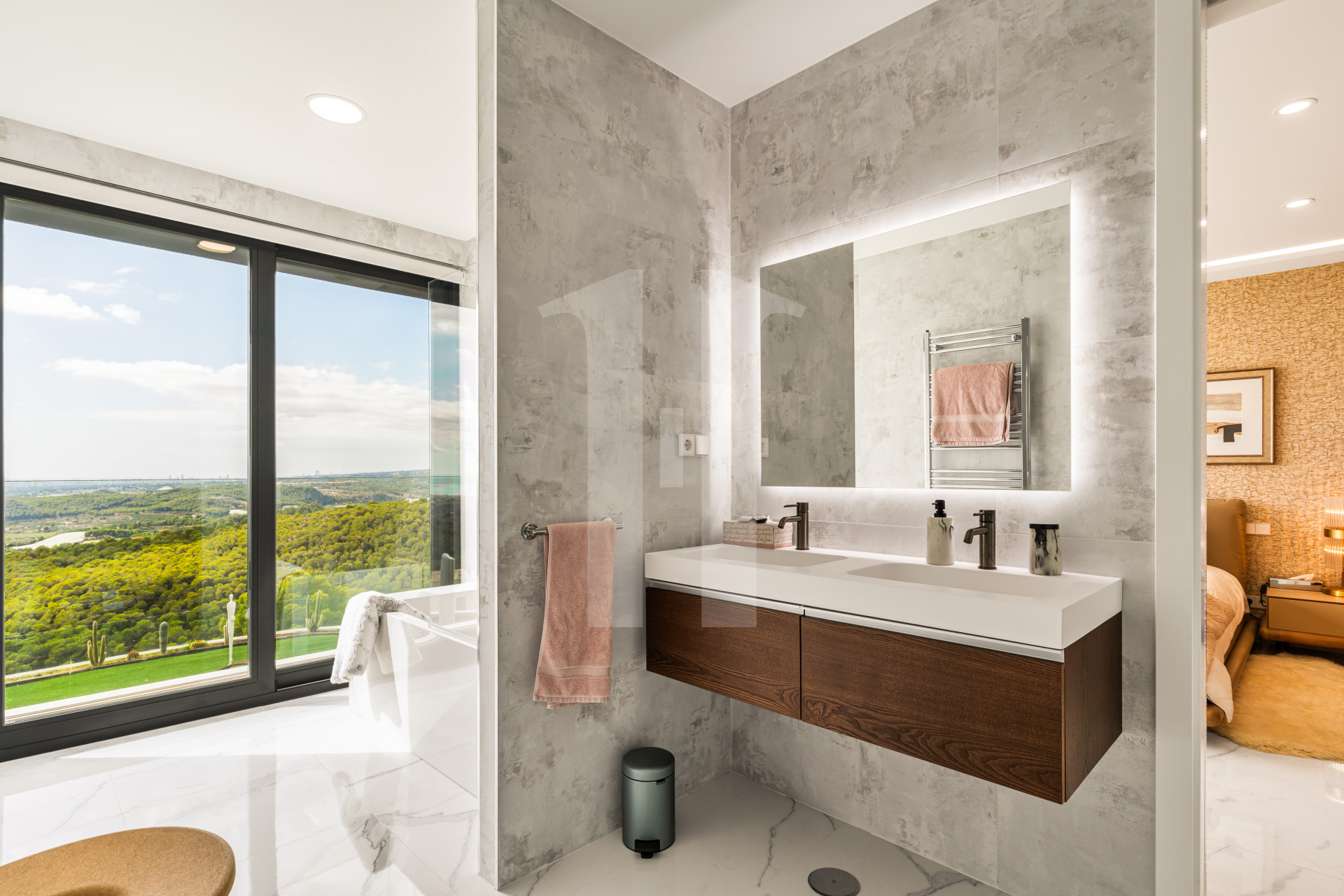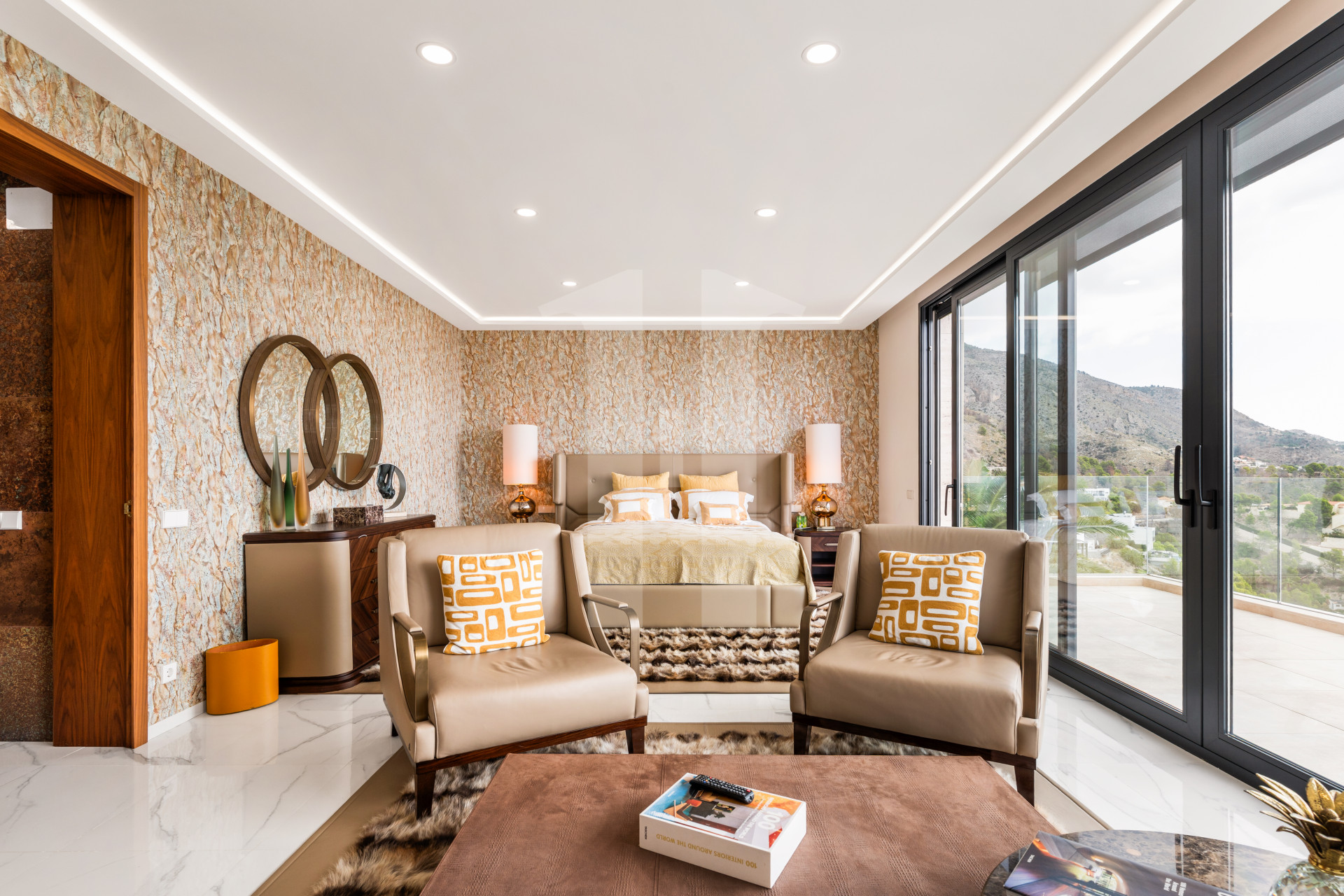 La planta superior alberga cinco dormitorios y un despacho, todos con acabados de lujo. La suite principal ofrece sala de estar, vestidor, baño en mármol y terraza privada con vistas al Mediterráneo.