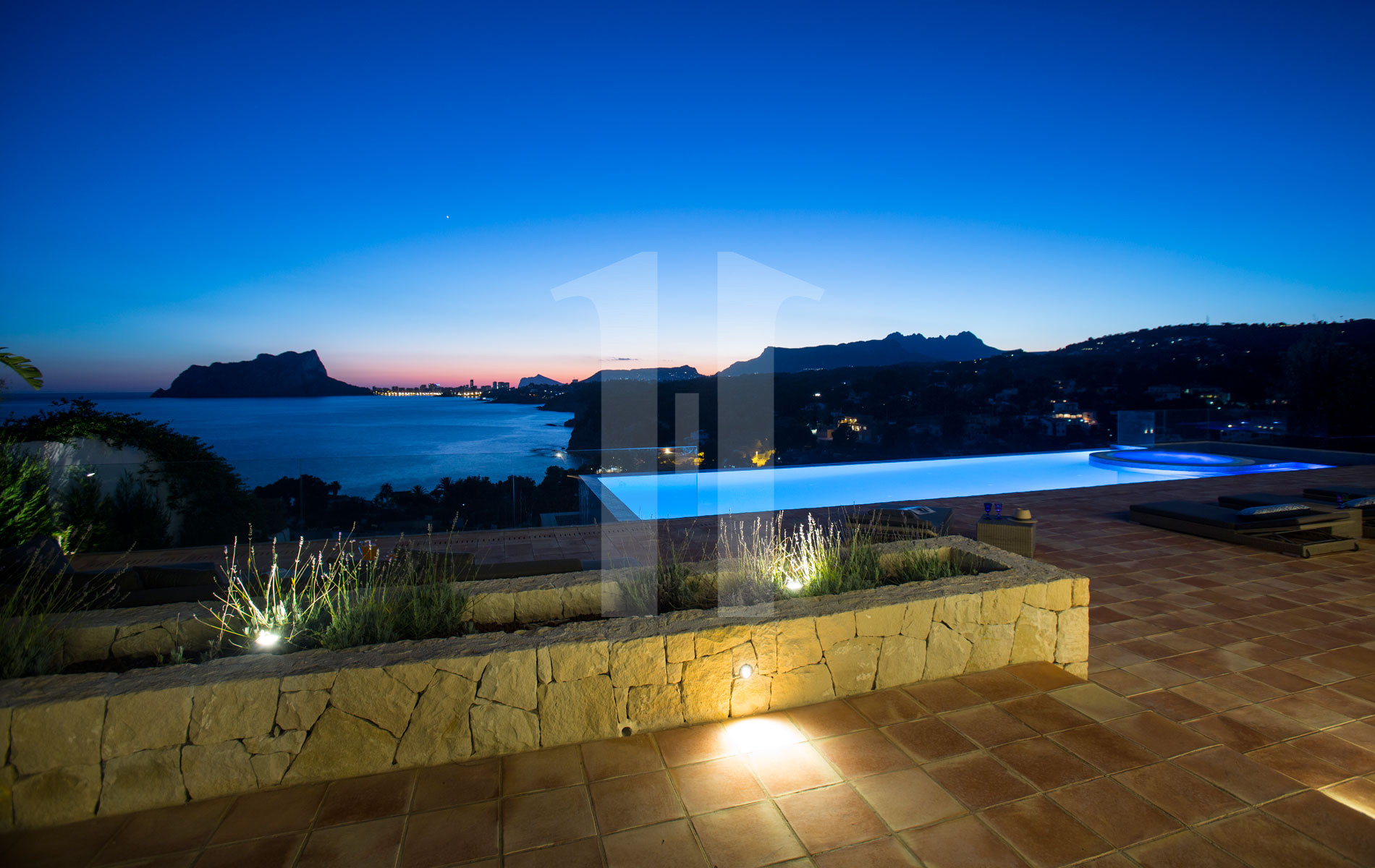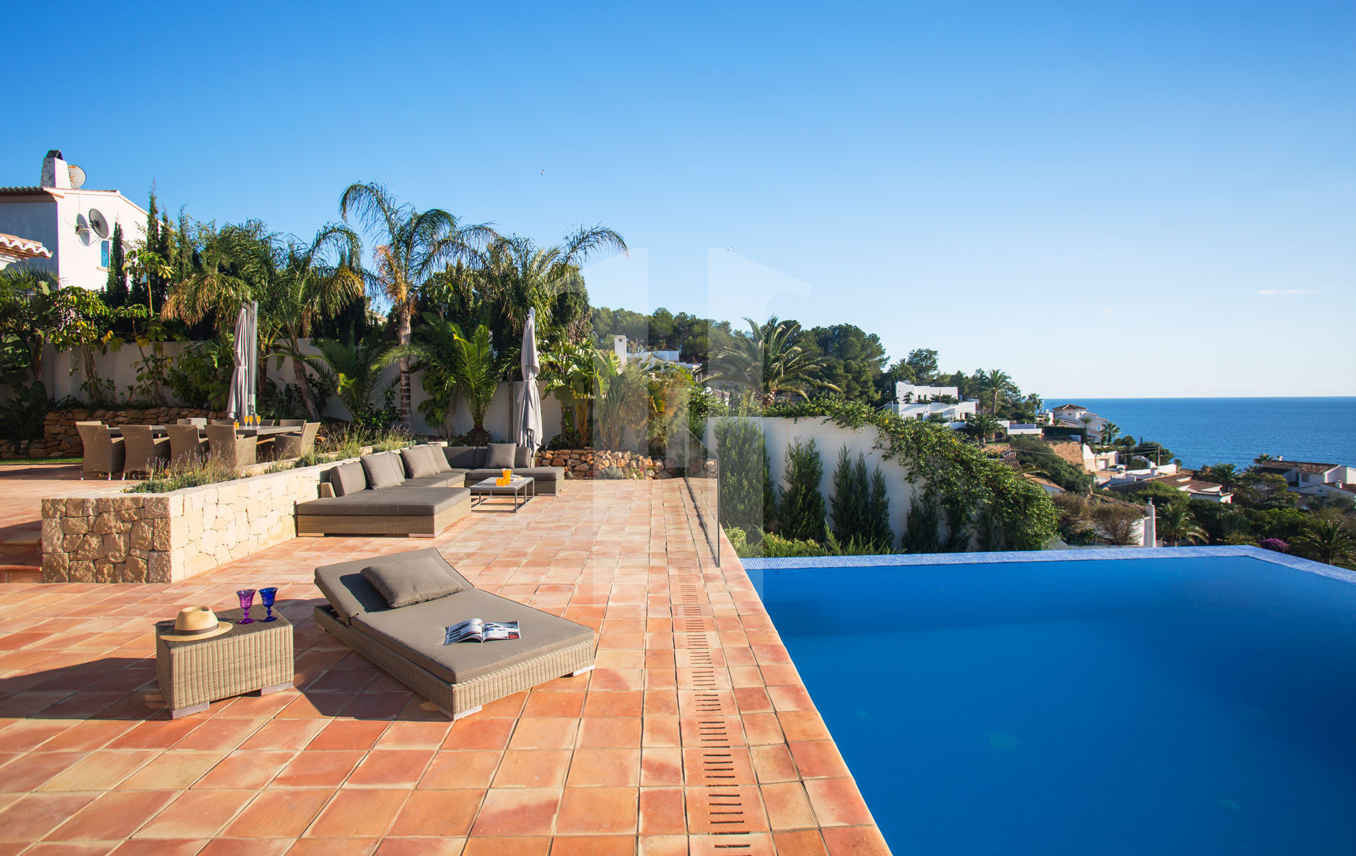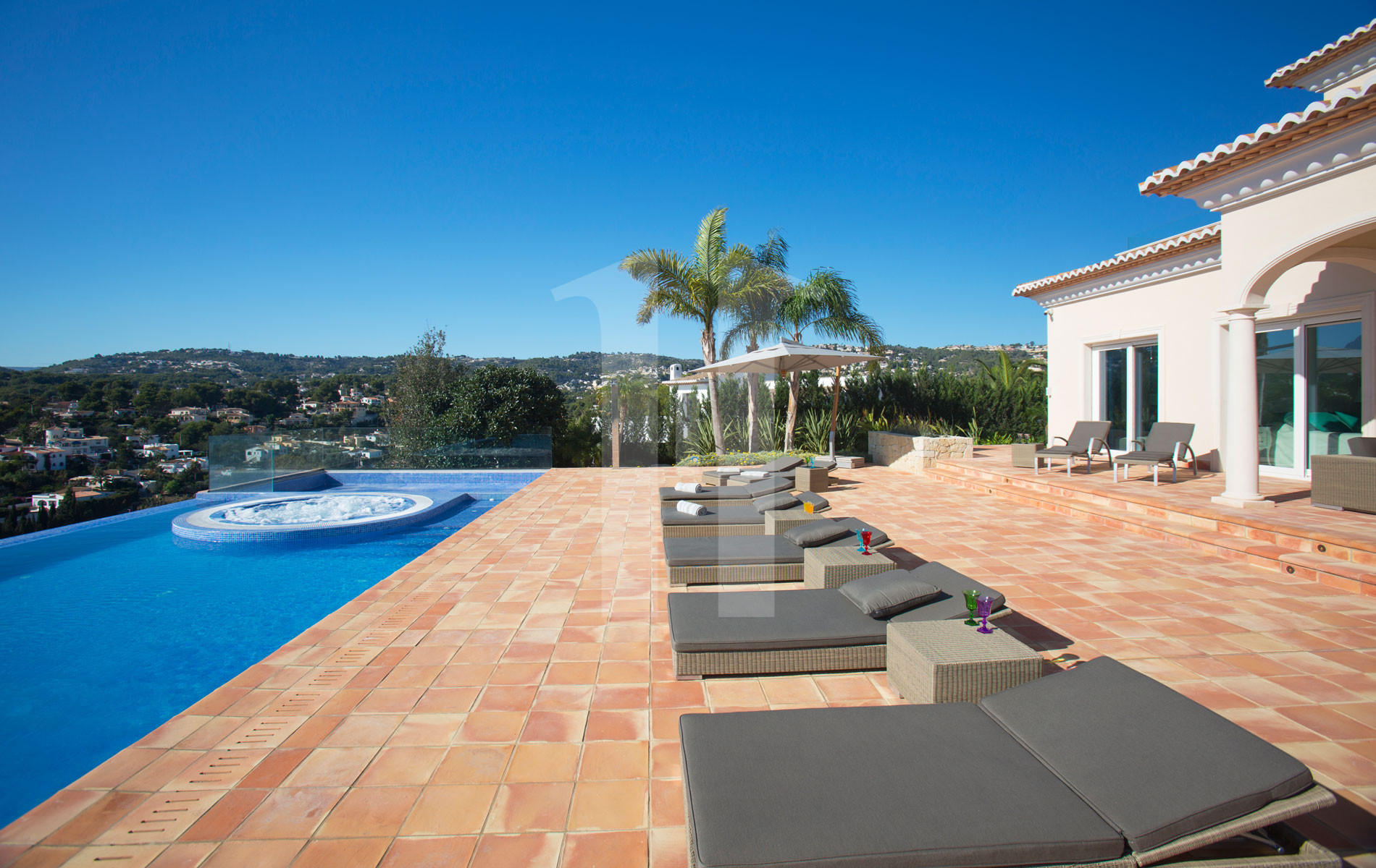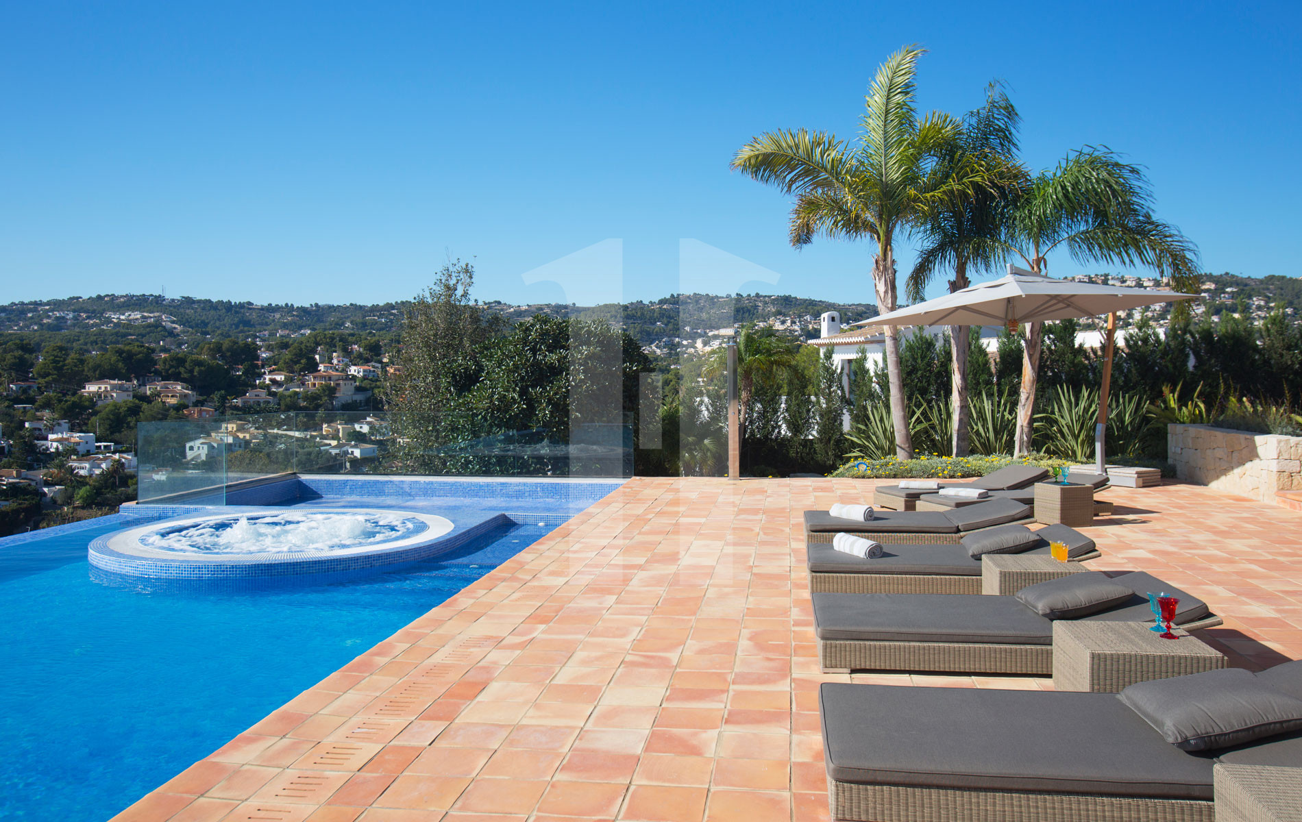 Enmarcan esta villa impresionantes muros de piedra seca, típicos de la zona levantina, así como un idílico cinturón verde en el que predominan palmeras, bananeros y otras plantas exóticas y que se extiende entre las fabulosas terrazas, las logradas zonas exteriores y, como no, a lo largo de la amplia piscina desbordante con su maravilloso jacuzzi integrado, fuente natural de bienestar corporal y exuberante lujo.