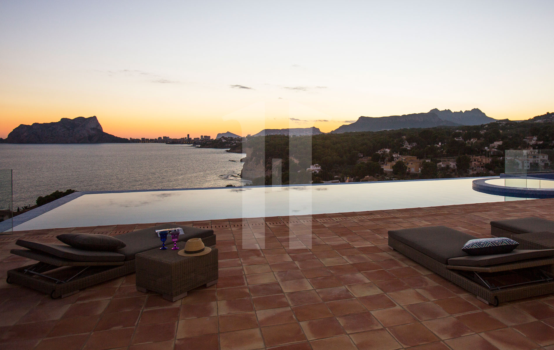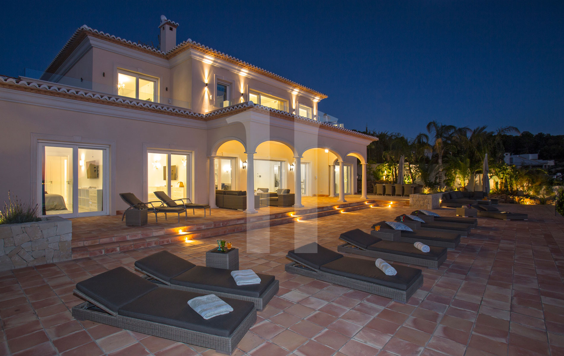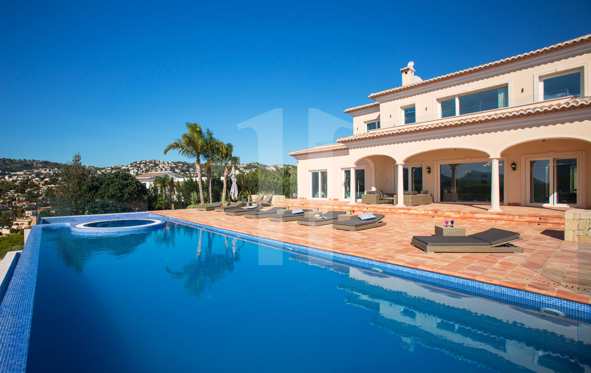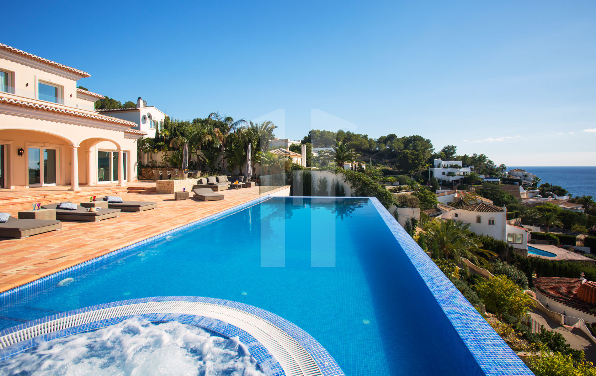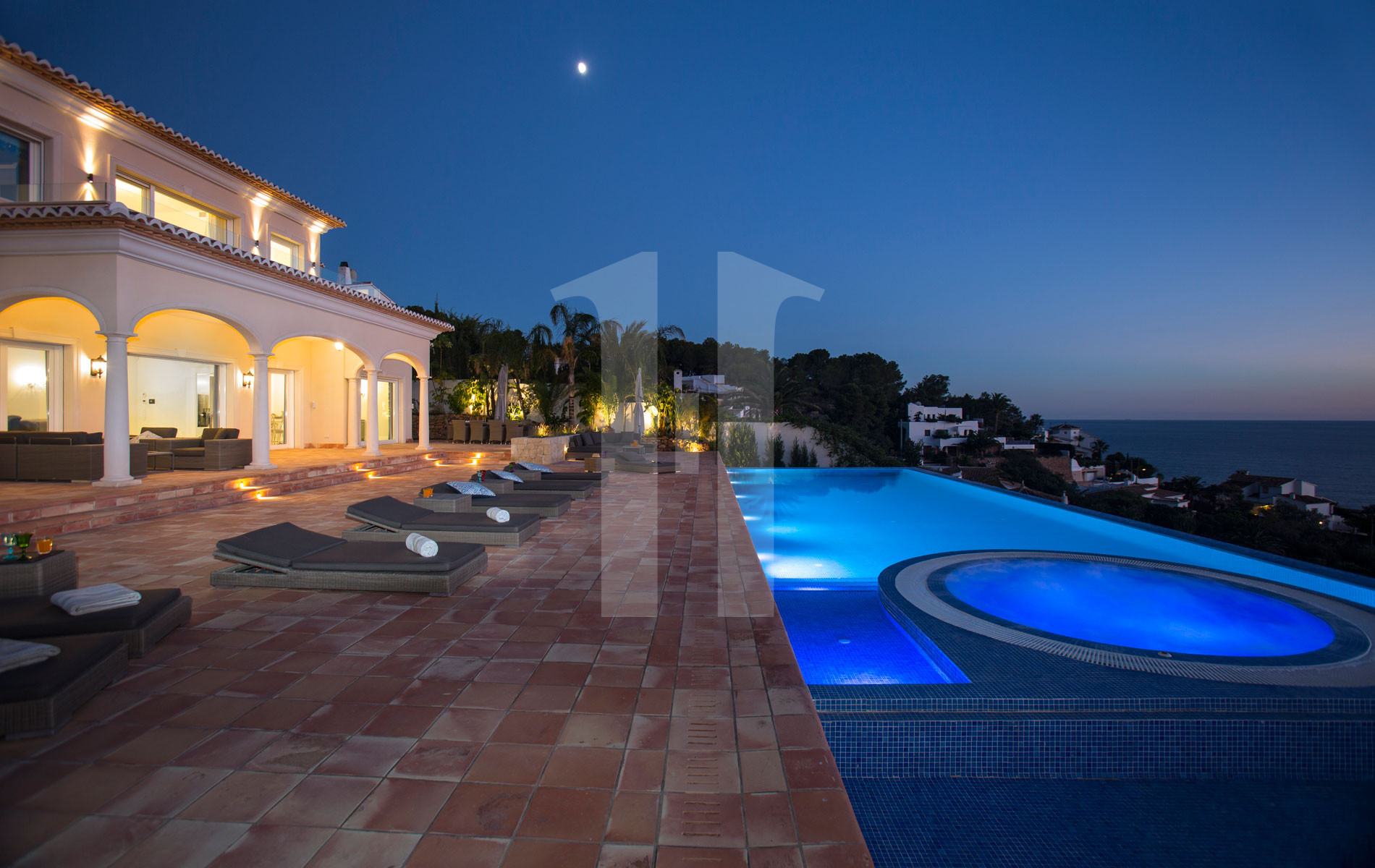 Enmarcan esta villa impresionantes muros de piedra seca, típicos de la zona levantina, así como un idílico cinturón verde en el que predominan palmeras, bananeros y otras plantas exóticas y que se extiende entre las fabulosas terrazas, las logradas zonas exteriores y, como no, a lo largo de la amplia piscina desbordante con su maravilloso jacuzzi integrado, fuente natural de bienestar corporal y exuberante lujo.