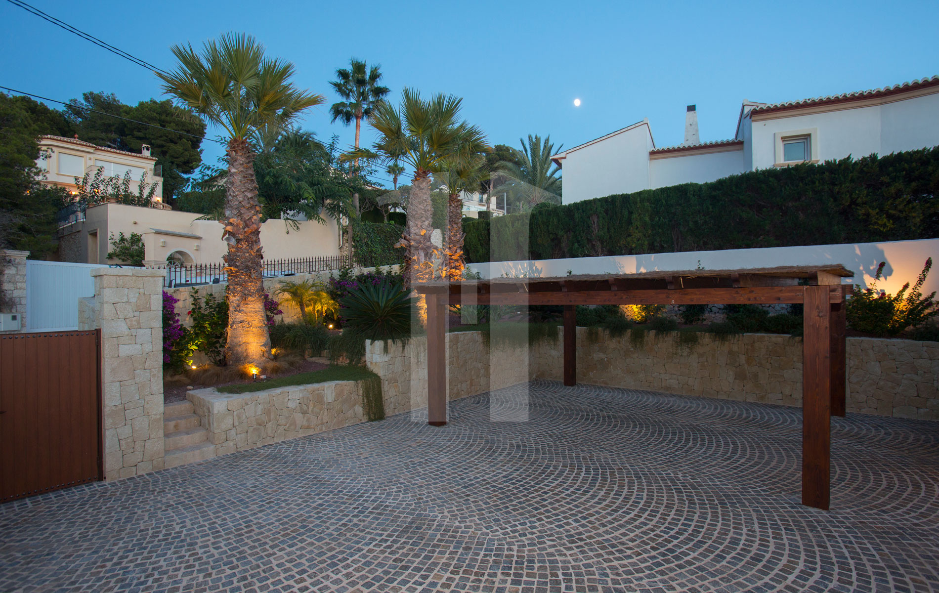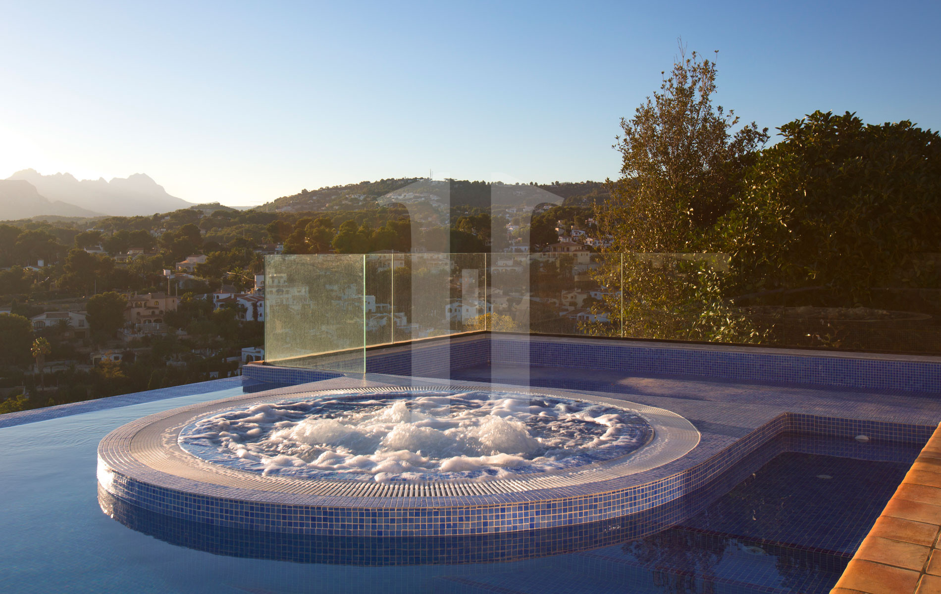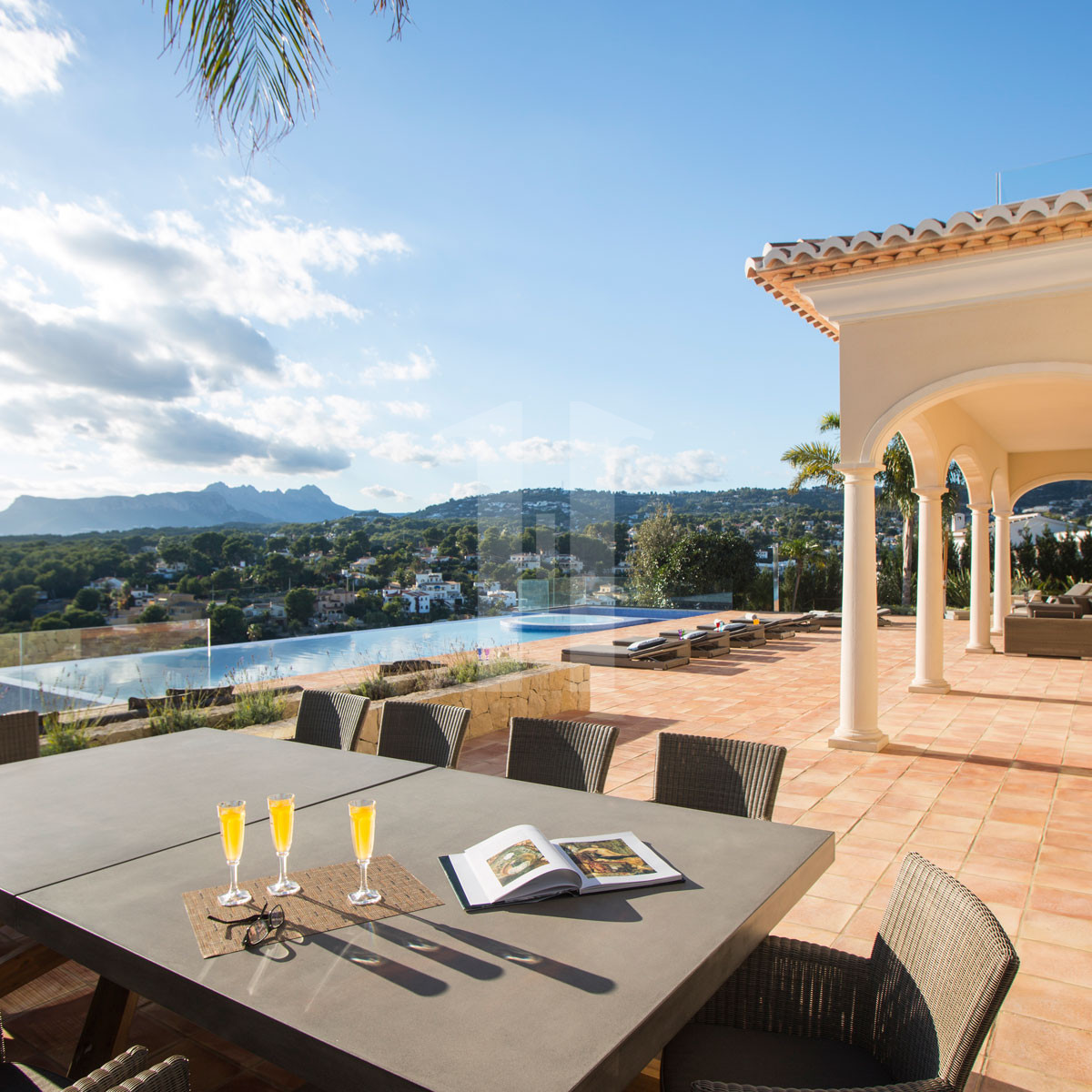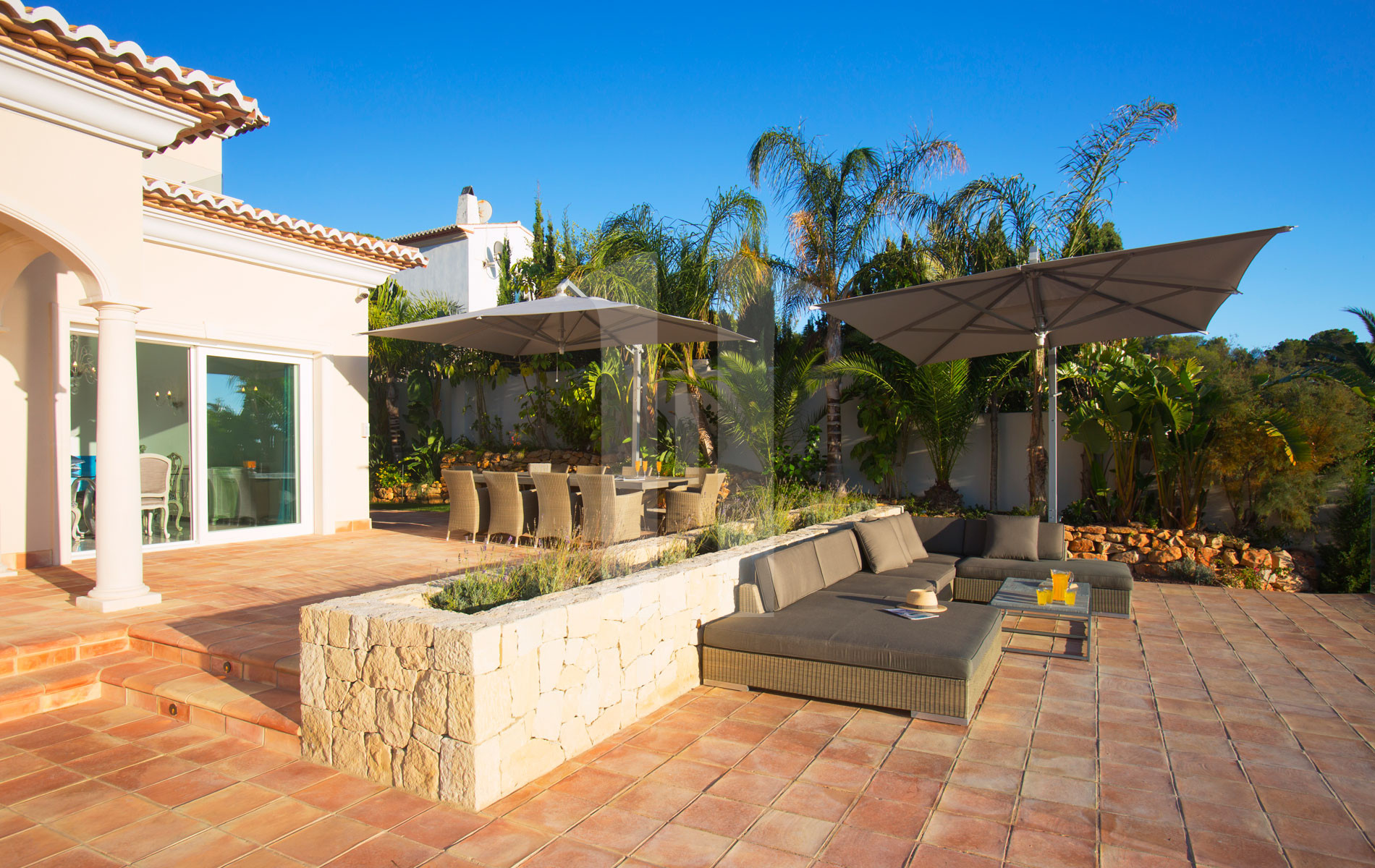 Enmarcan esta villa impresionantes muros de piedra seca, típicos de la zona levantina, así como un idílico cinturón verde en el que predominan palmeras, bananeros y otras plantas exóticas y que se extiende entre las fabulosas terrazas, las logradas zonas exteriores y, como no, a lo largo de la amplia piscina desbordante con su maravilloso jacuzzi integrado, fuente natural de bienestar corporal y exuberante lujo.