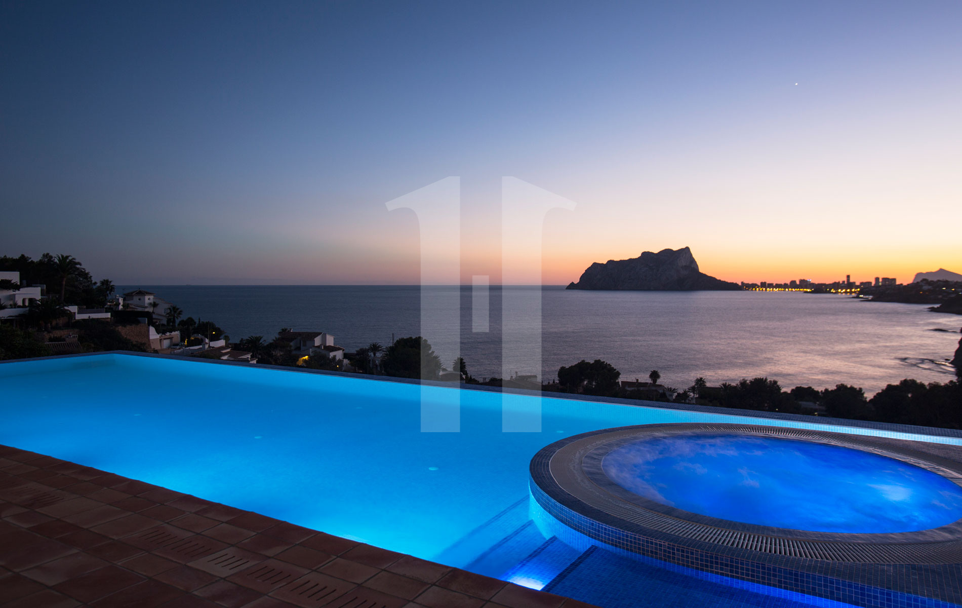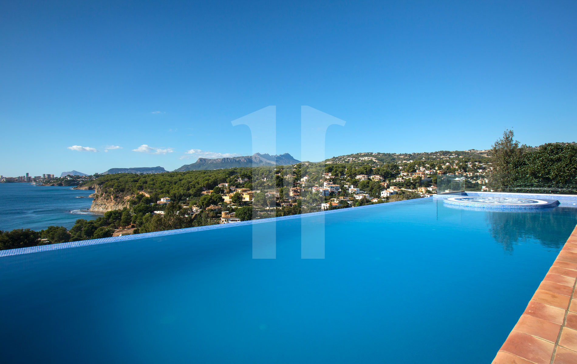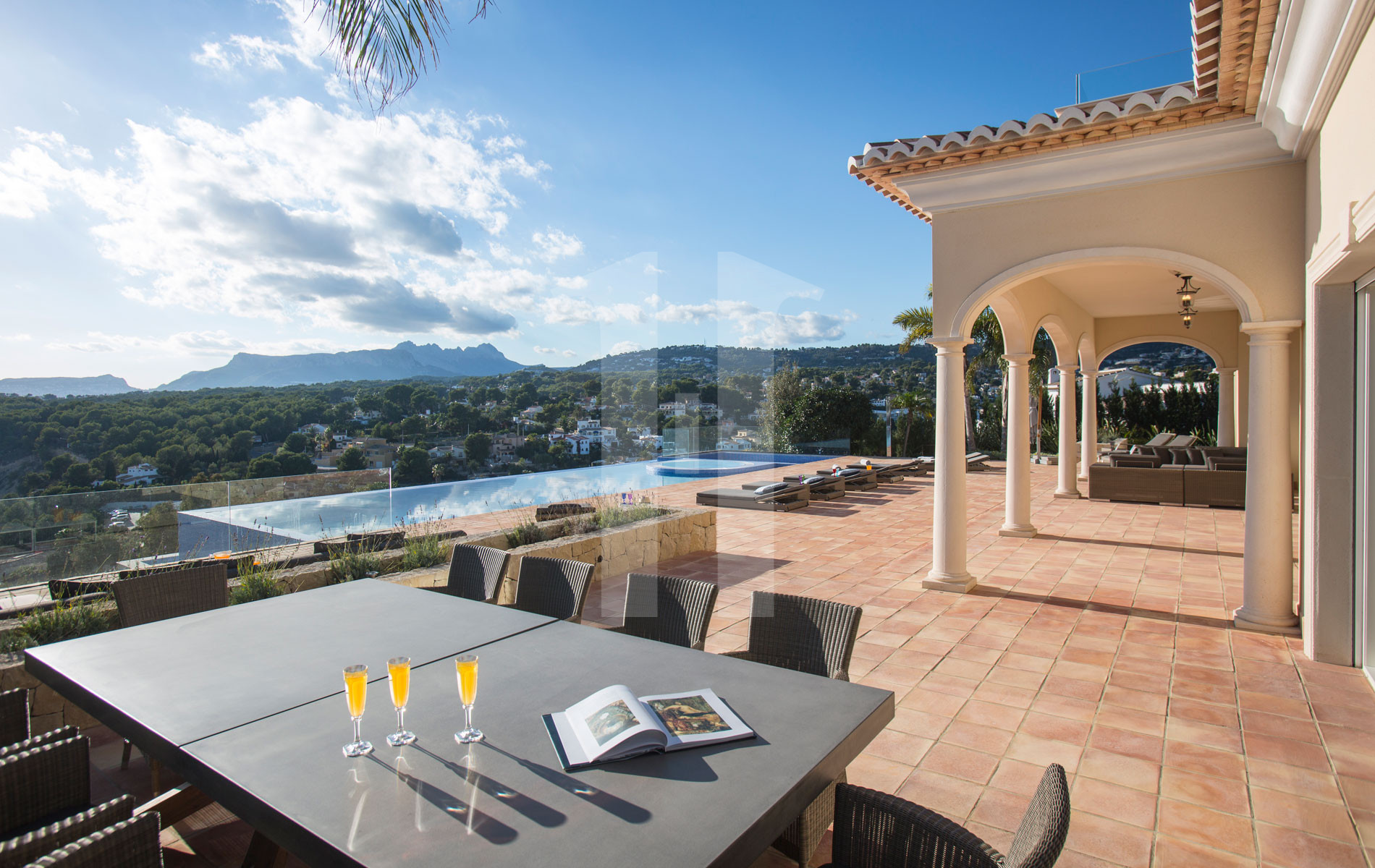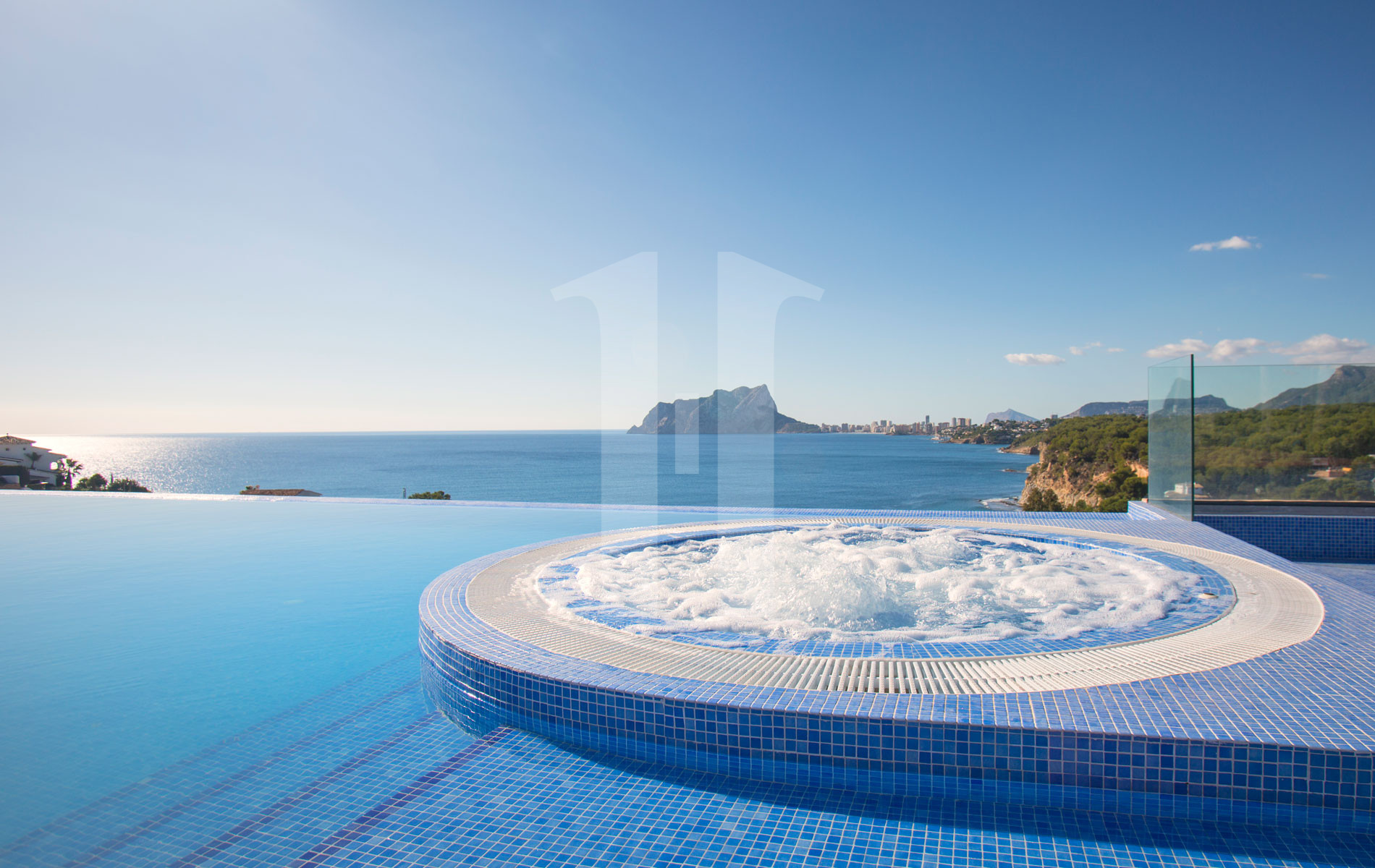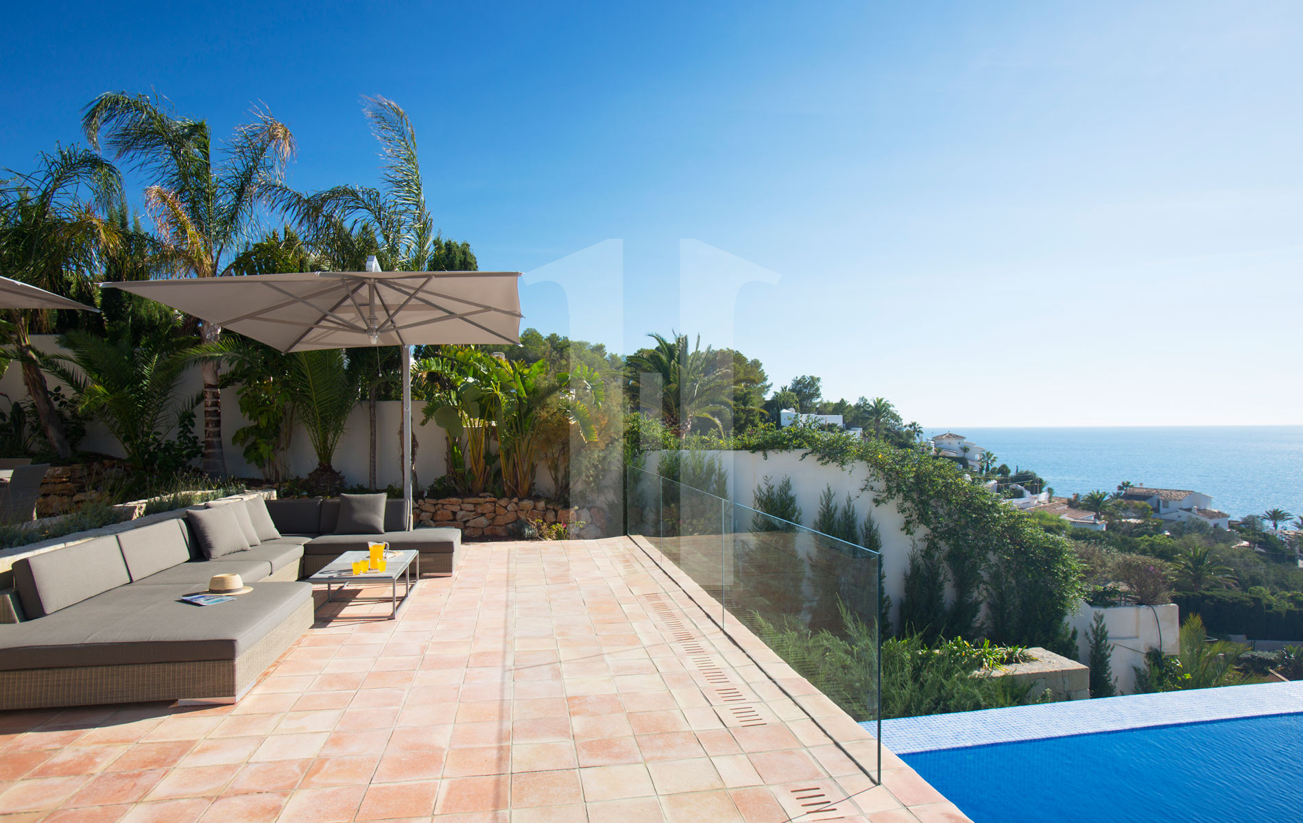 Enmarcan esta villa impresionantes muros de piedra seca, típicos de la zona levantina, así como un idílico cinturón verde en el que predominan palmeras, bananeros y otras plantas exóticas y que se extiende entre las fabulosas terrazas, las logradas zonas exteriores y, como no, a lo largo de la amplia piscina desbordante con su maravilloso jacuzzi integrado, fuente natural de bienestar corporal y exuberante lujo.
