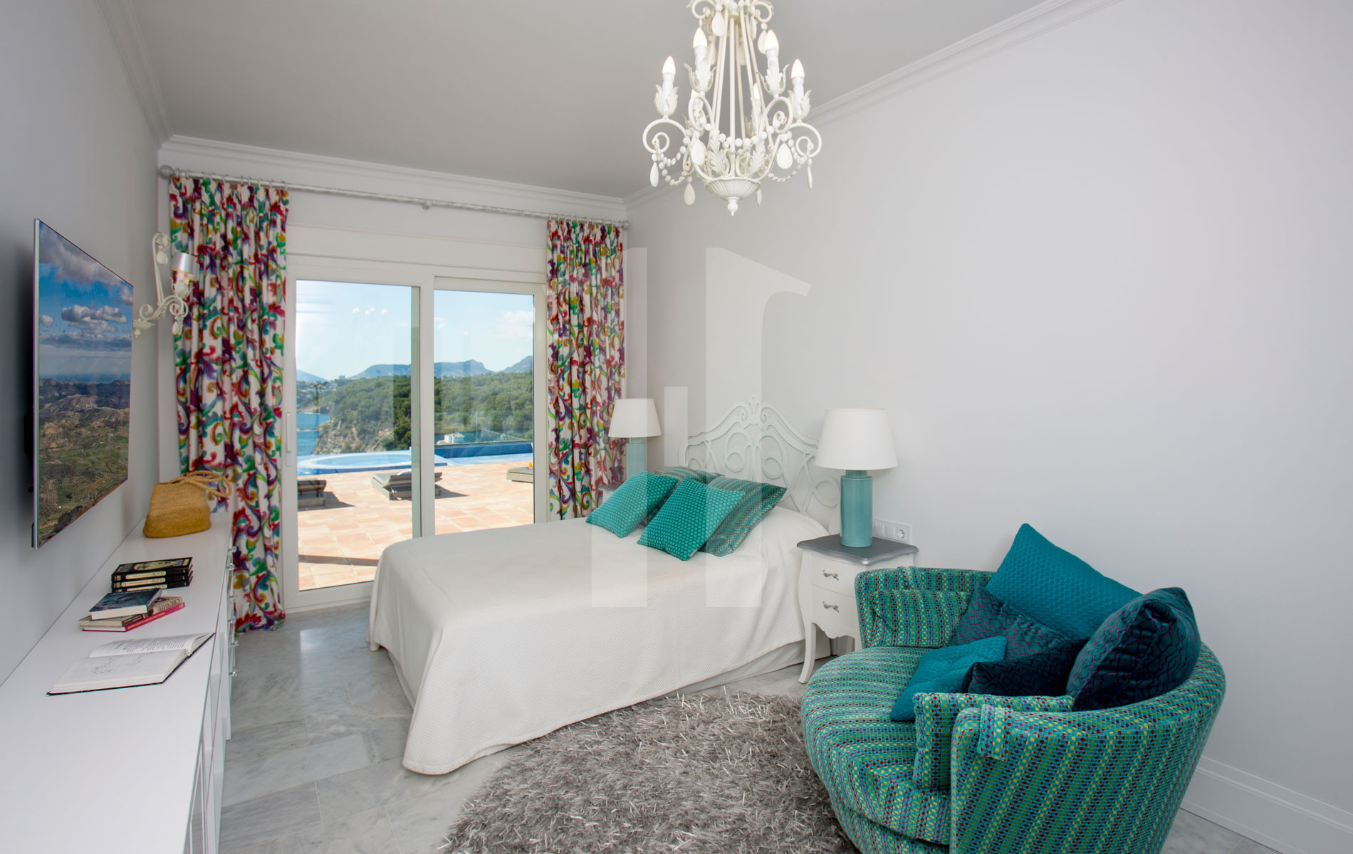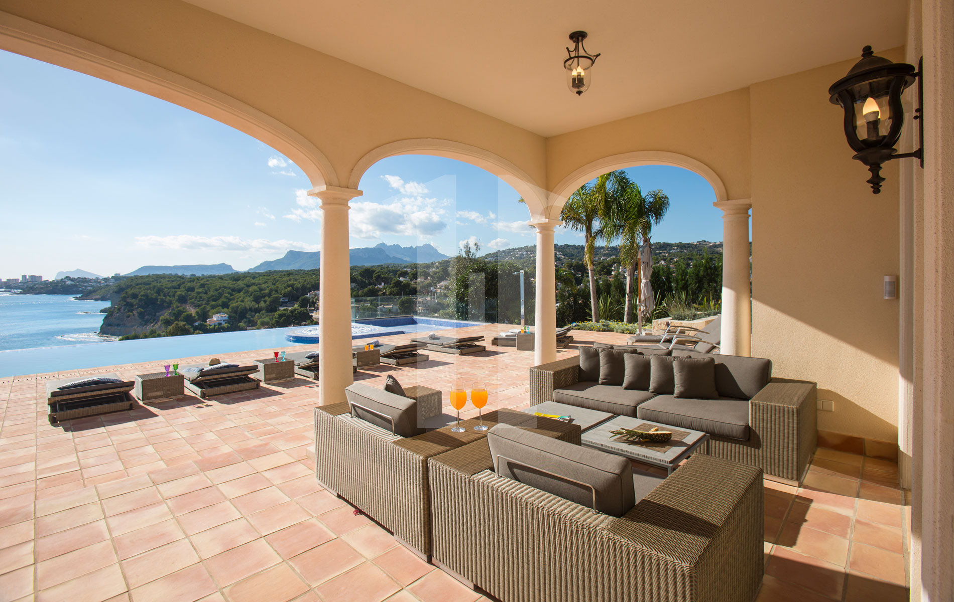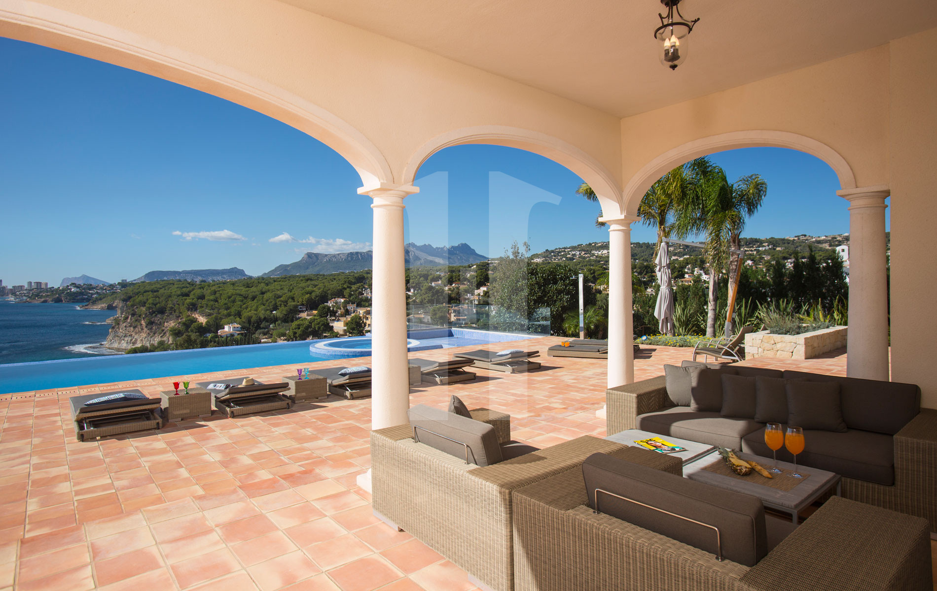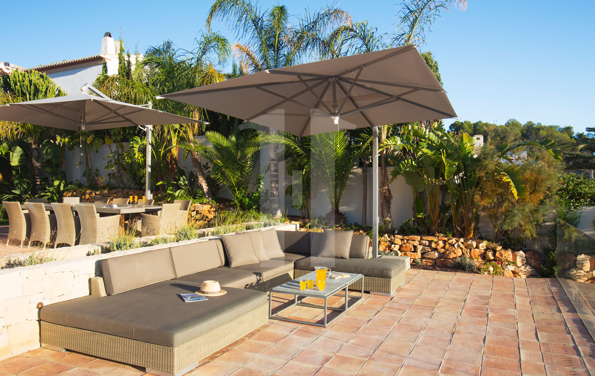 Enmarcan esta villa impresionantes muros de piedra seca, típicos de la zona levantina, así como un idílico cinturón verde en el que predominan palmeras, bananeros y otras plantas exóticas y que se extiende entre las fabulosas terrazas, las logradas zonas exteriores y, como no, a lo largo de la amplia piscina desbordante con su maravilloso jacuzzi integrado, fuente natural de bienestar corporal y exuberante lujo.