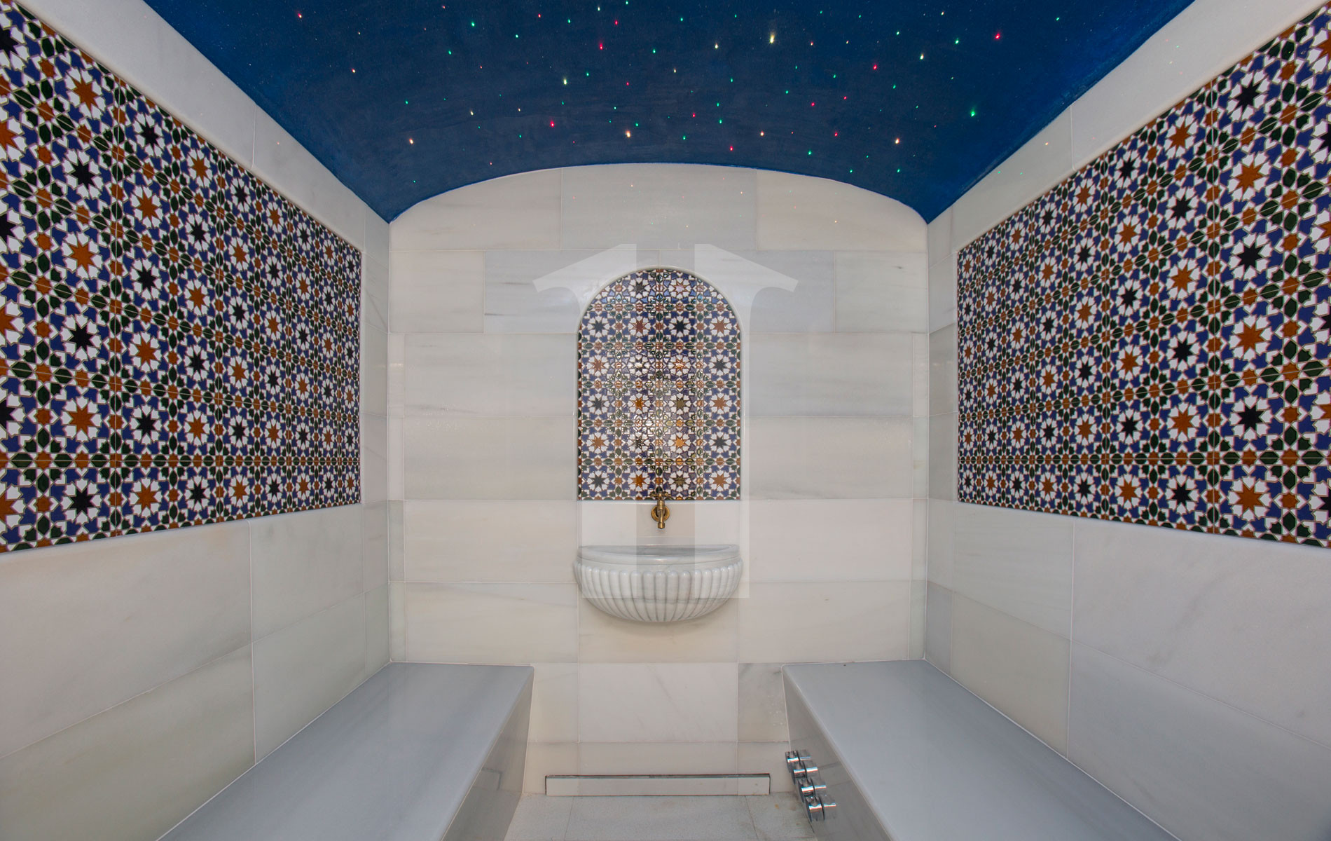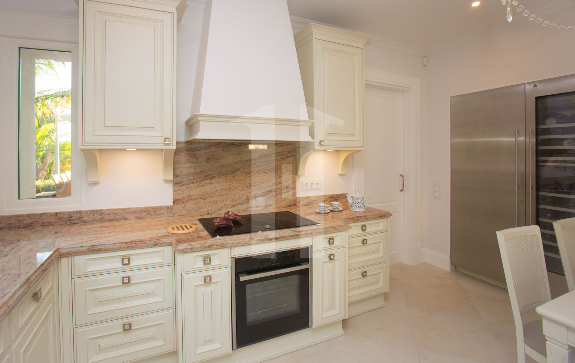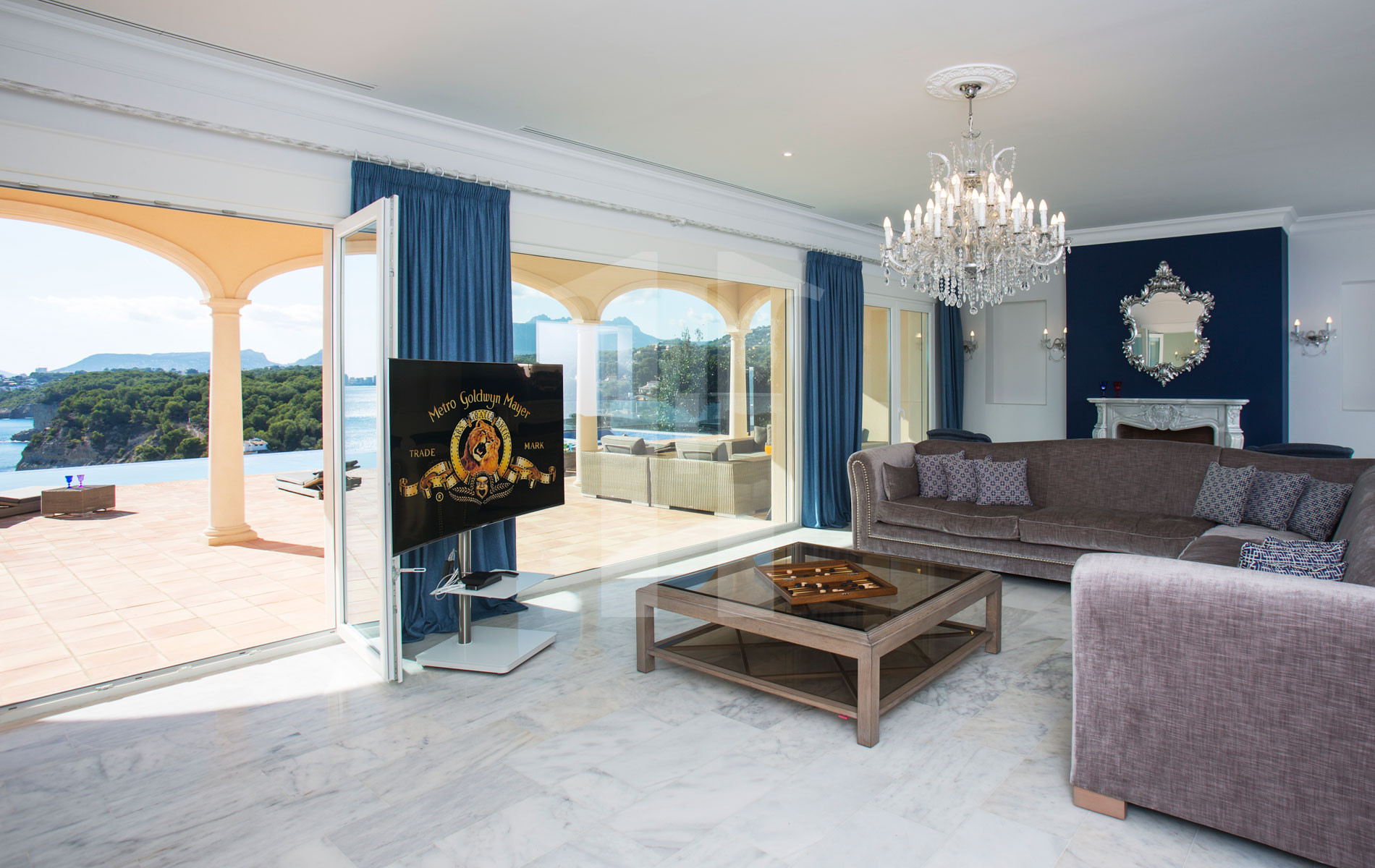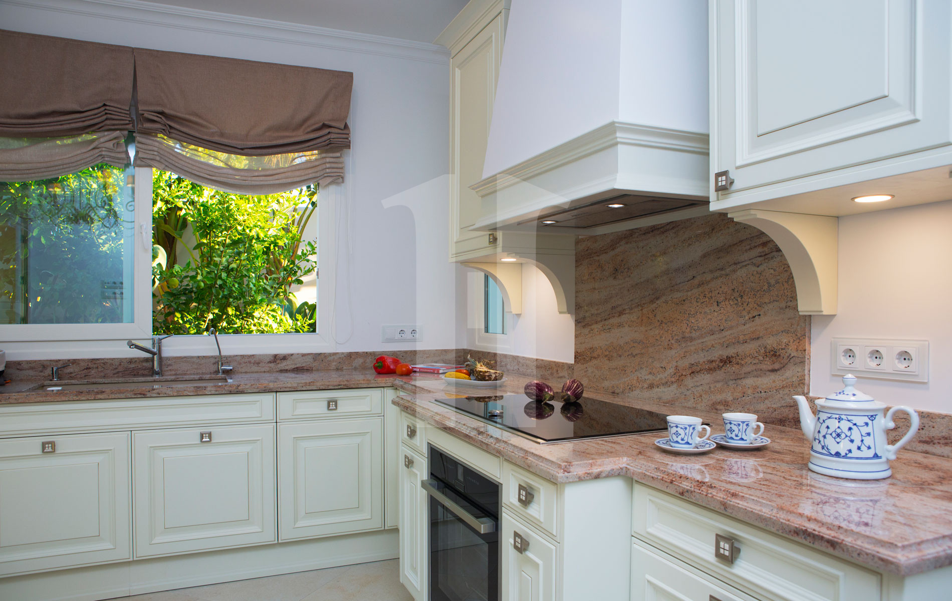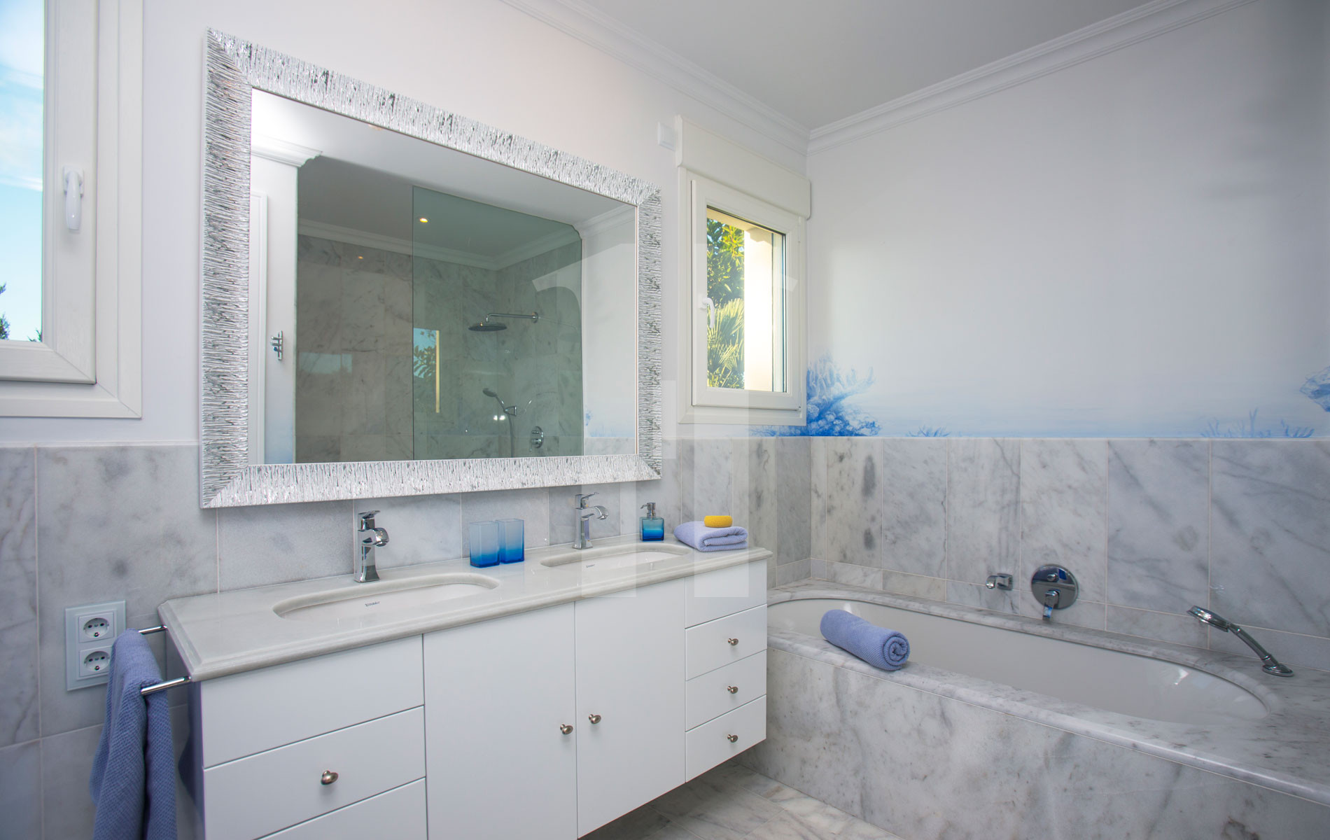 Enmarcan esta villa impresionantes muros de piedra seca, típicos de la zona levantina, así como un idílico cinturón verde en el que predominan palmeras, bananeros y otras plantas exóticas y que se extiende entre las fabulosas terrazas, las logradas zonas exteriores y, como no, a lo largo de la amplia piscina desbordante con su maravilloso jacuzzi integrado, fuente natural de bienestar corporal y exuberante lujo.