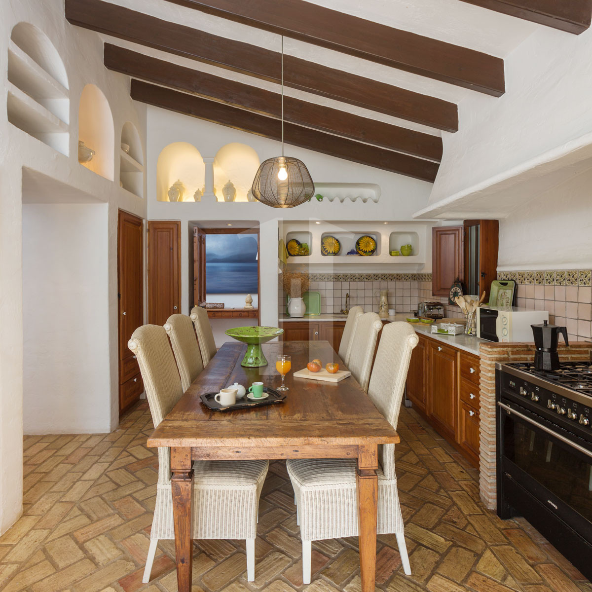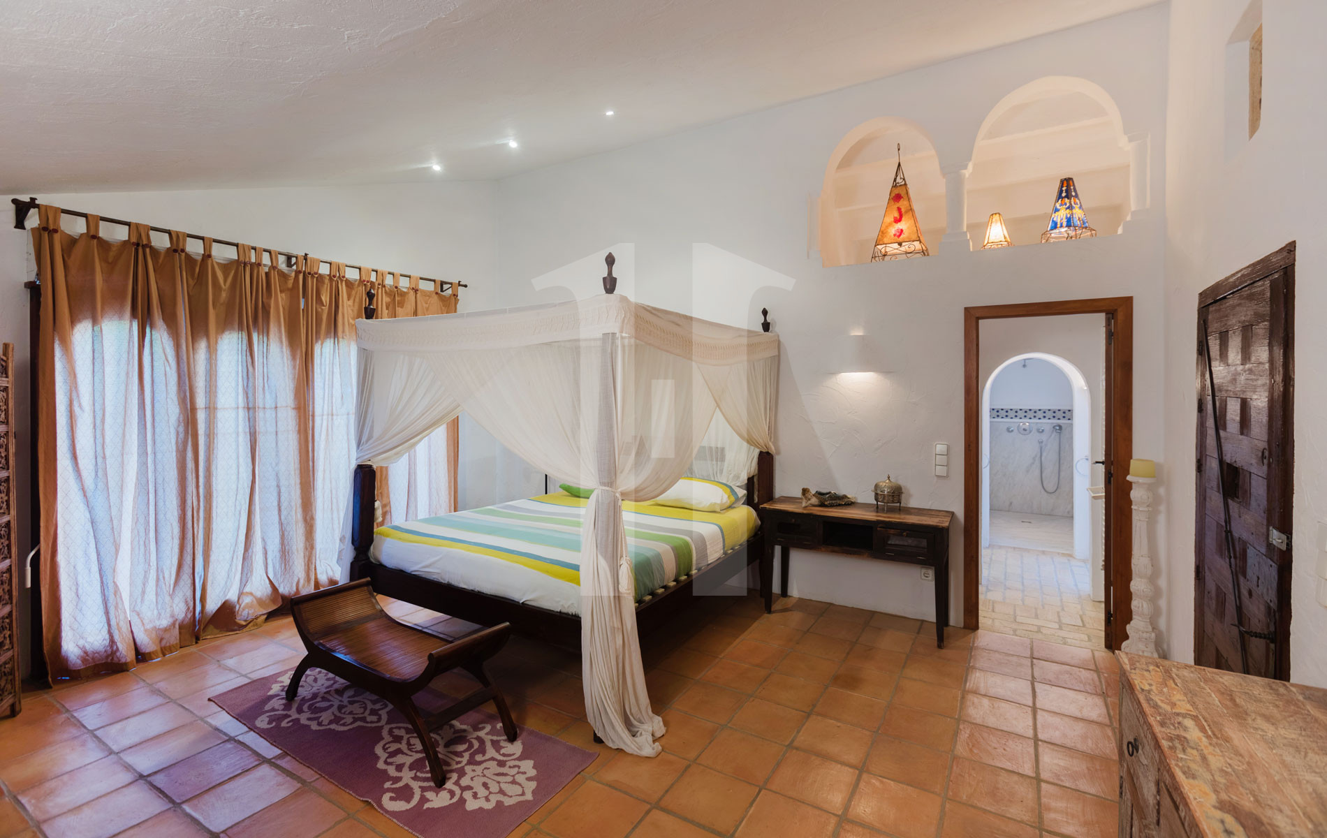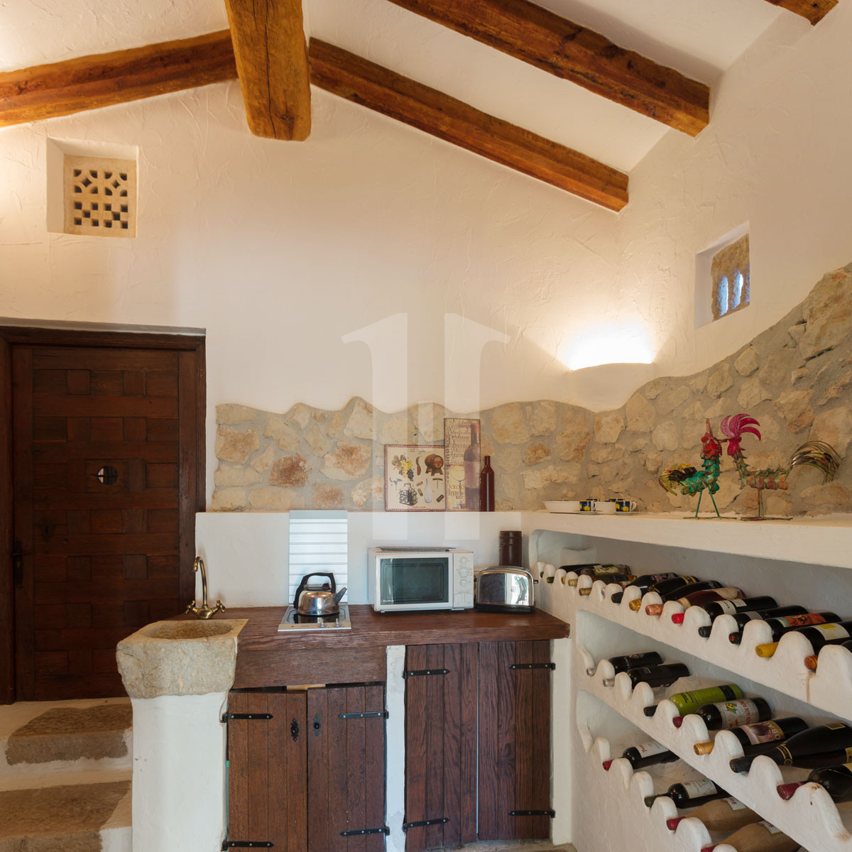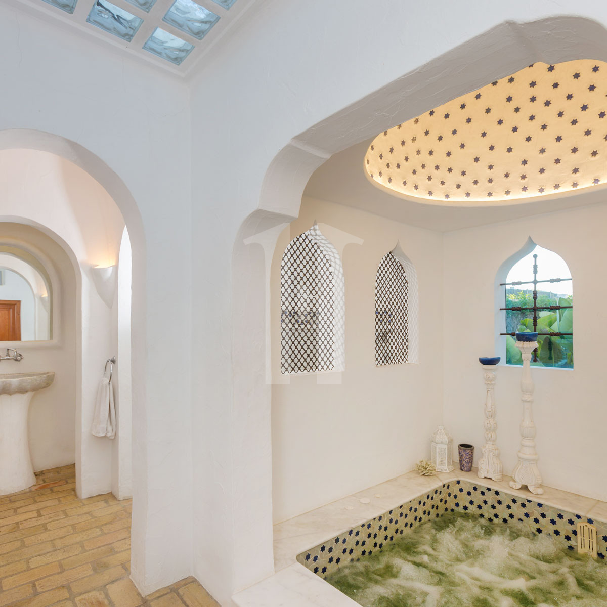 La vivienda principal destaca por su refinada arquitectura de inspiración sarracena, albergando una impresionante suite con un baño de diseño excepcional. A su mismo nivel, la casa de huéspedes ofrece un espacio acogedor e independiente, complementado por magníficas zonas exteriores. Entre ellas, una cocina de verano y varias terrazas de estilo mediterráneo invitan a disfrutar de inolvidables momentos al aire libre.