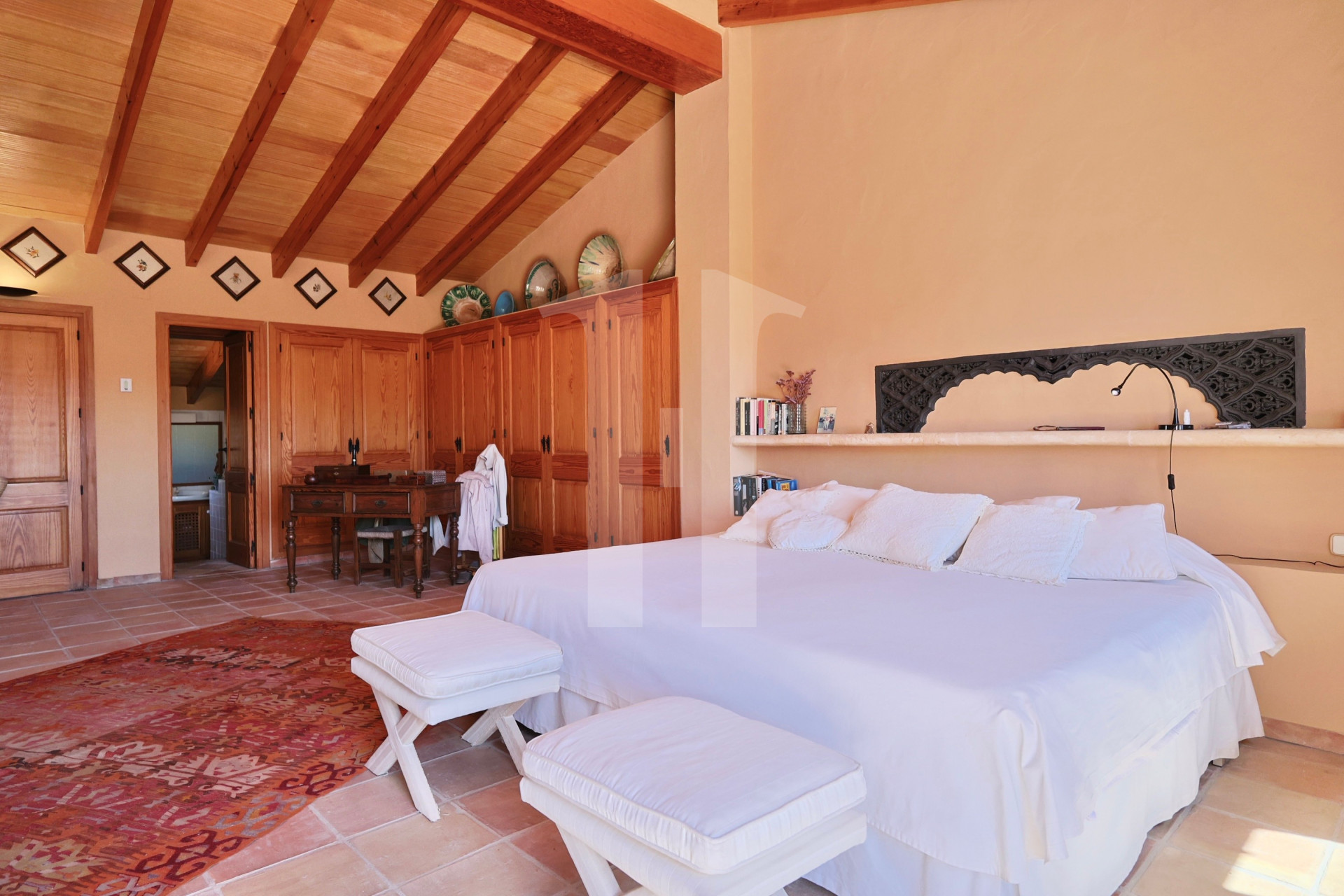 La planta superior se accede desde el espacioso hall, y alberga el luminoso dormitorio principal, con zona de estar, baño en suite, varios armarios empotrados y dos terrazas privadas: una orientada al sur con vistas abiertas al valle, y otra al norte con espectaculares vistas al Montgó. En este nivel también se encuentra un segundo dormitorio con baño en suite, conectado por un pasillo abierto que incluye un balcón con vistas al patio interior.