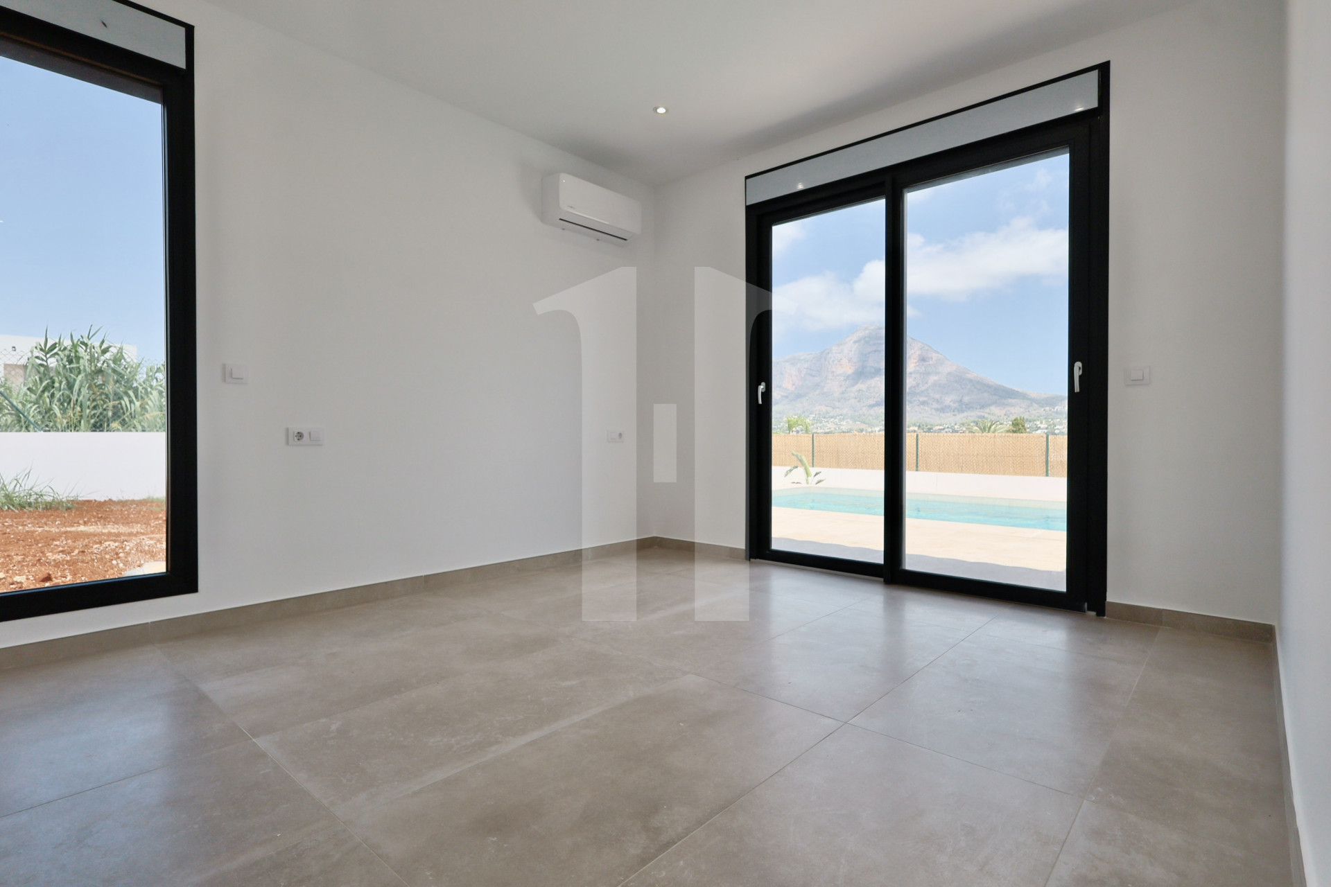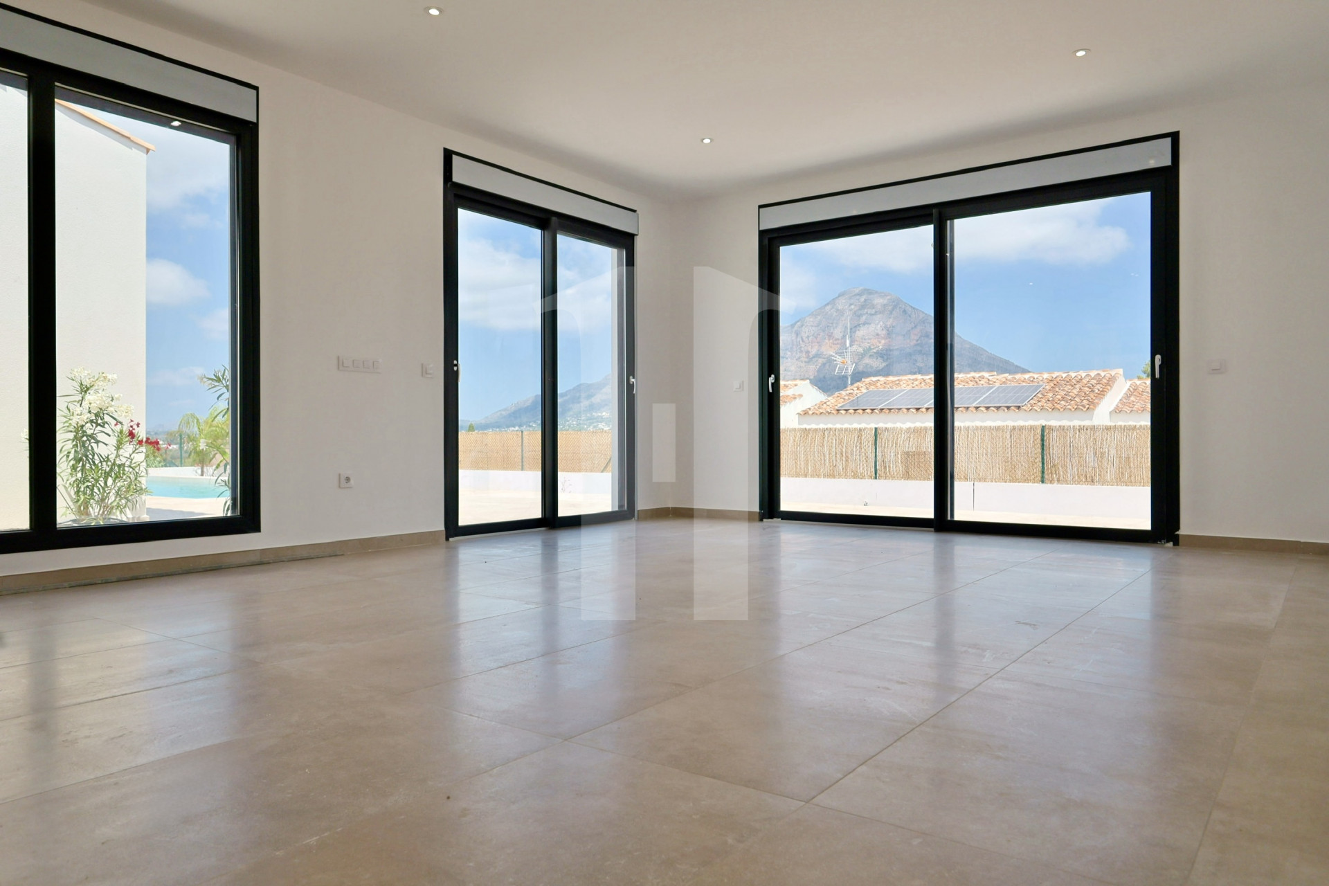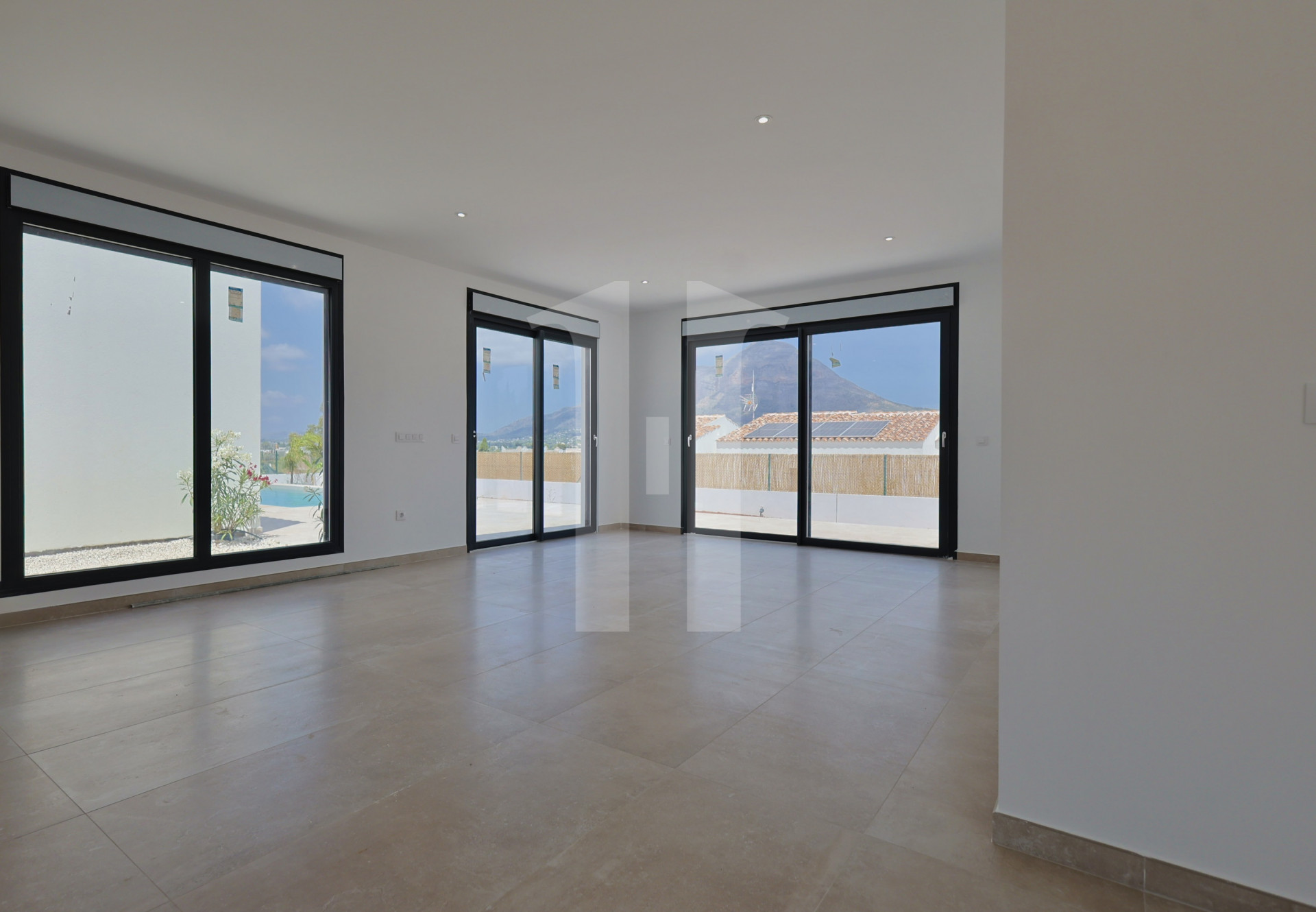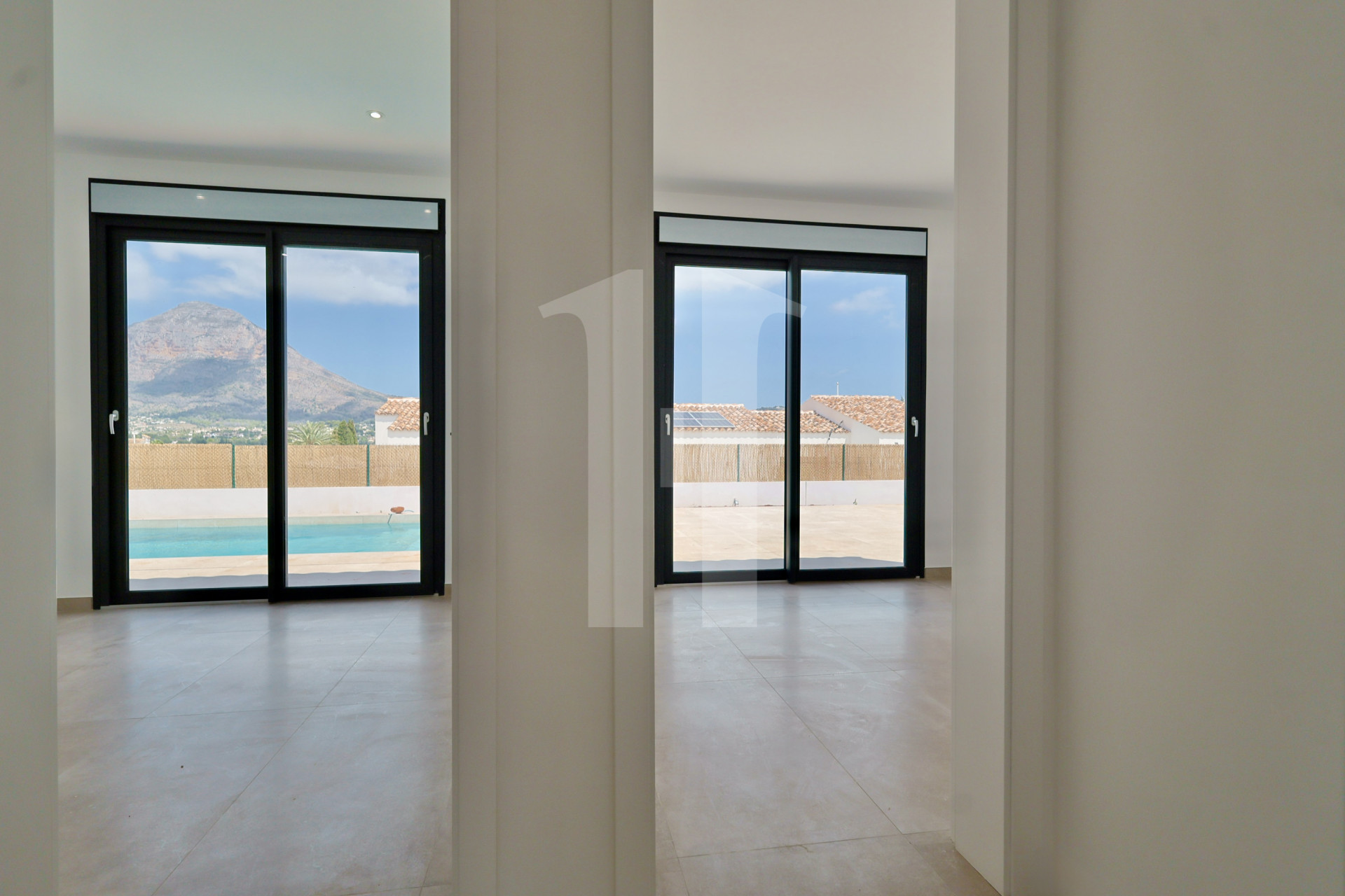 Distribuida en una sola planta, la villa permite moverse cómodamente entre las diferentes áreas. El salón destaca por su luminosidad y atractivo, gracias a los grandes ventanales que dan acceso directo a la terraza cubierta y a la piscina privada. Desde el salón, podrá disfrutar de impresionantes vistas a la piscina y al Montgó.