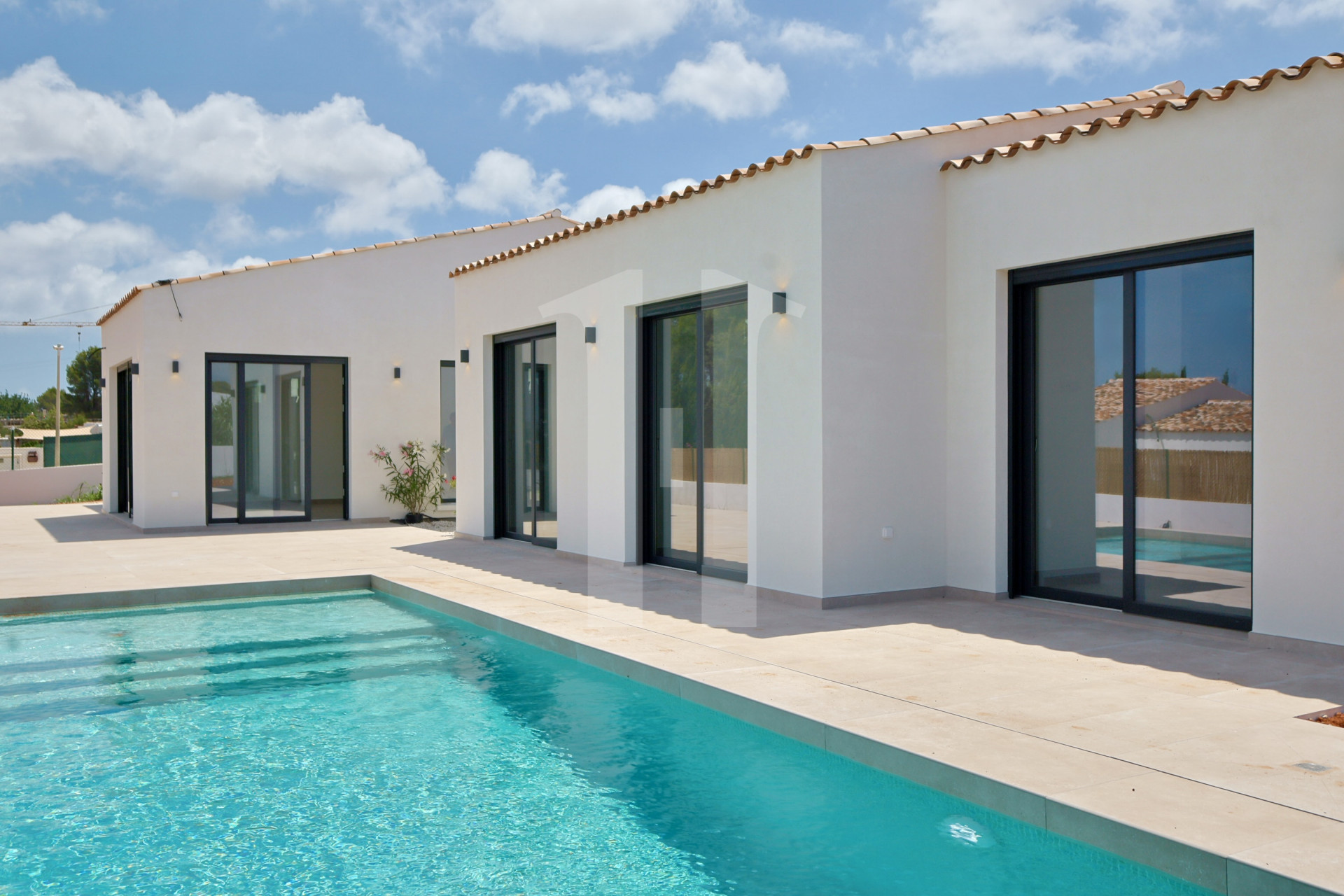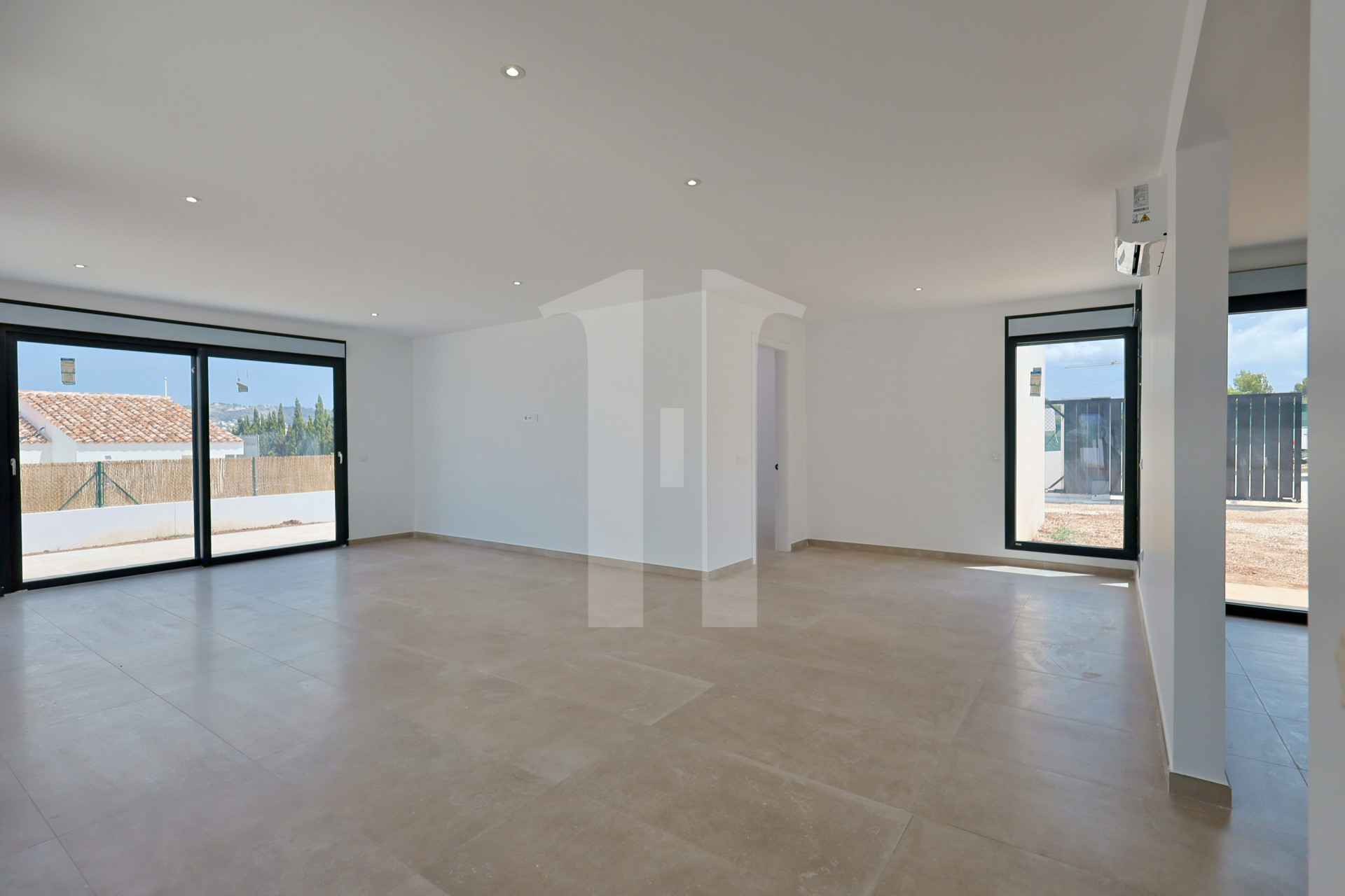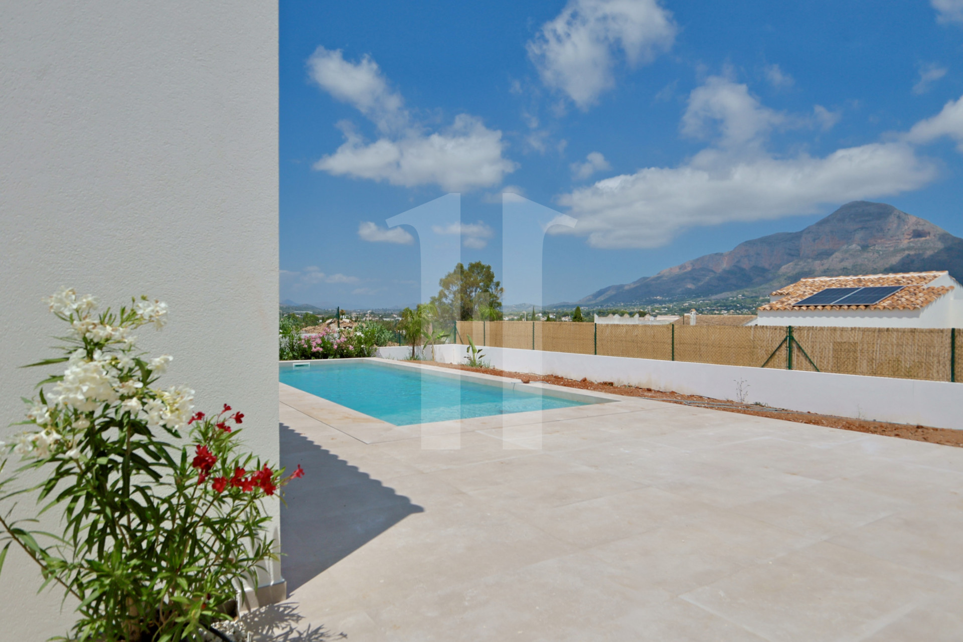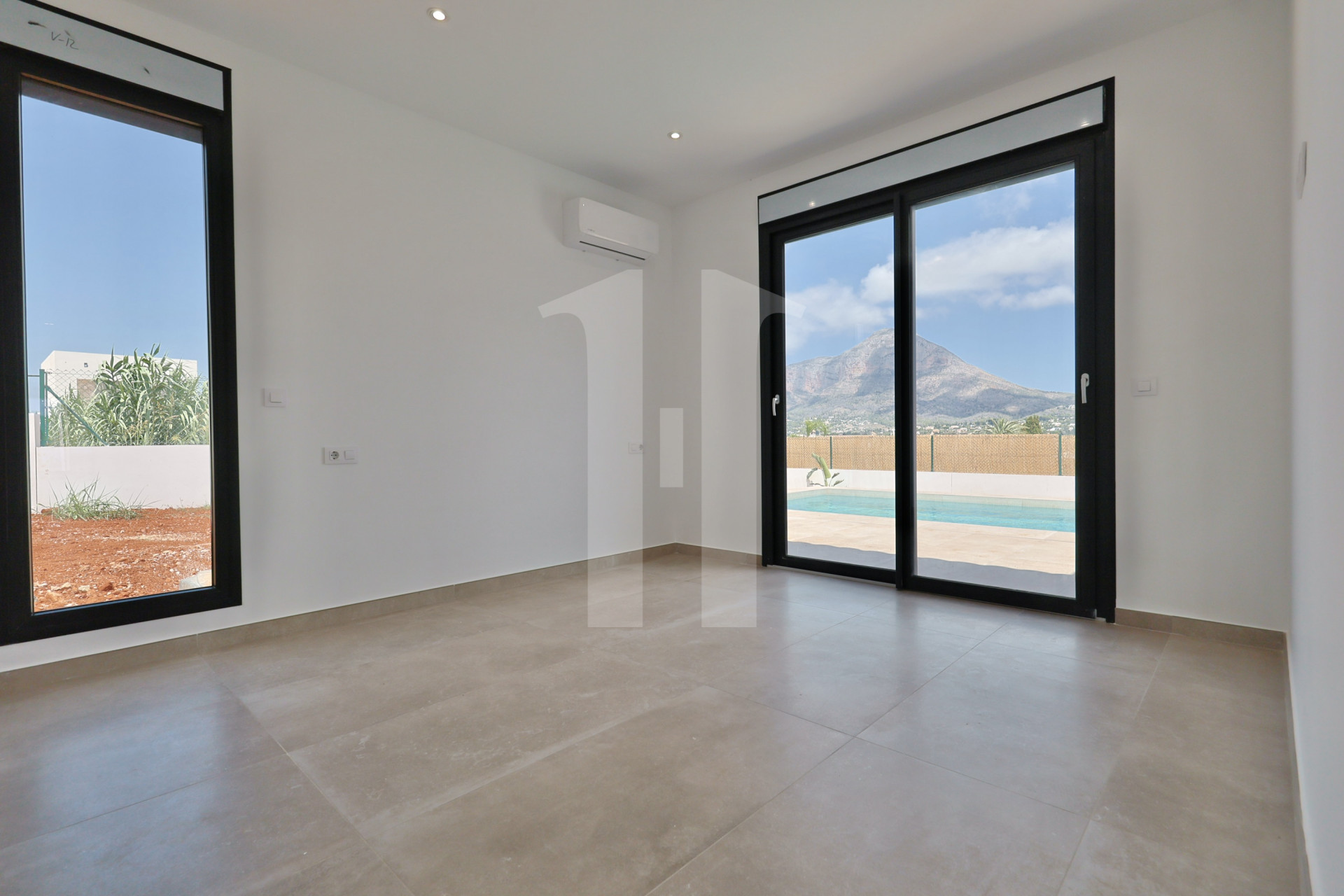 Distribuida en una sola planta, la villa permite moverse cómodamente entre las diferentes áreas. El salón destaca por su luminosidad y atractivo, gracias a los grandes ventanales que dan acceso directo a la terraza cubierta y a la piscina privada. Desde el salón, podrá disfrutar de impresionantes vistas a la piscina y al Montgó.