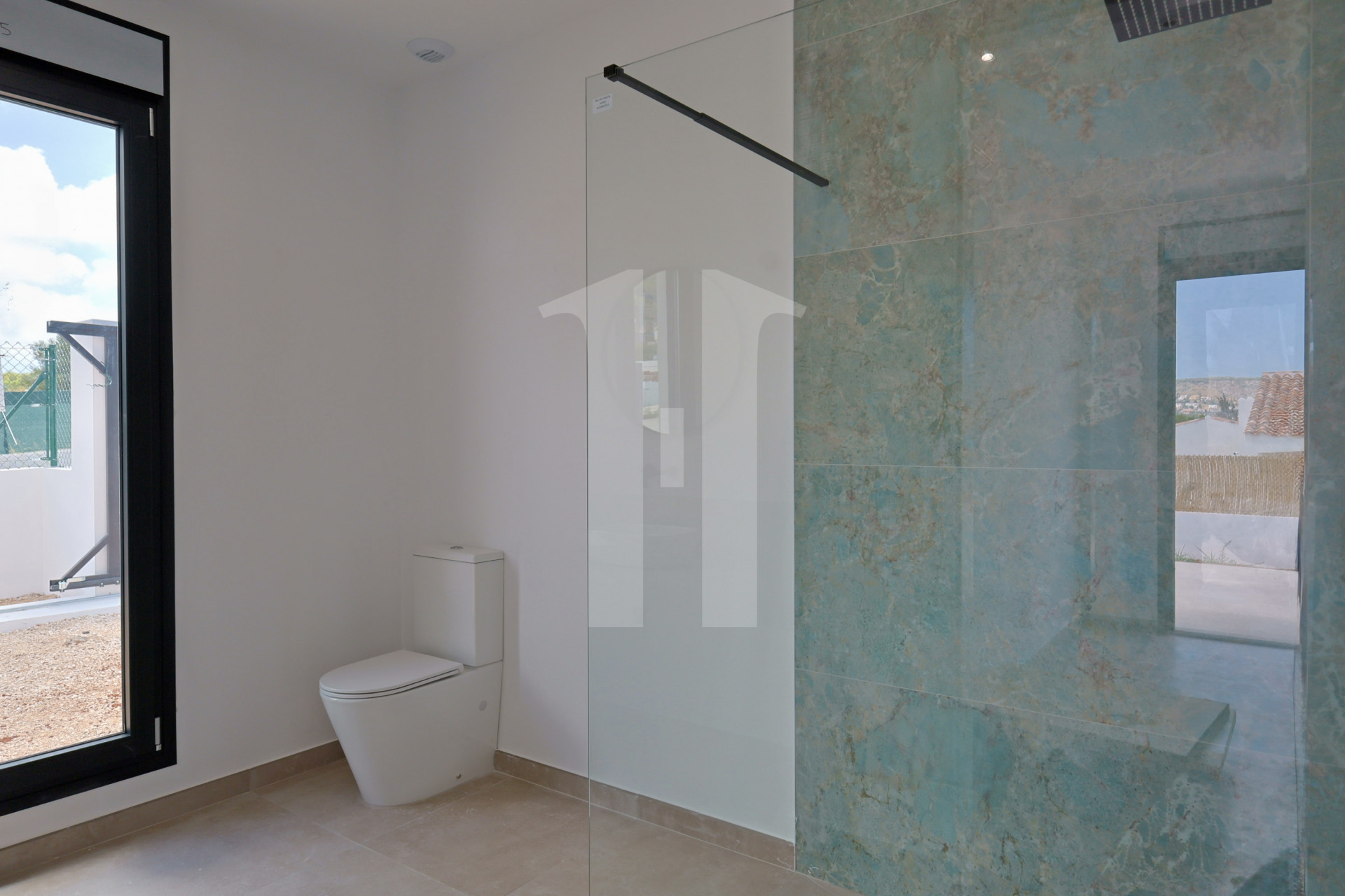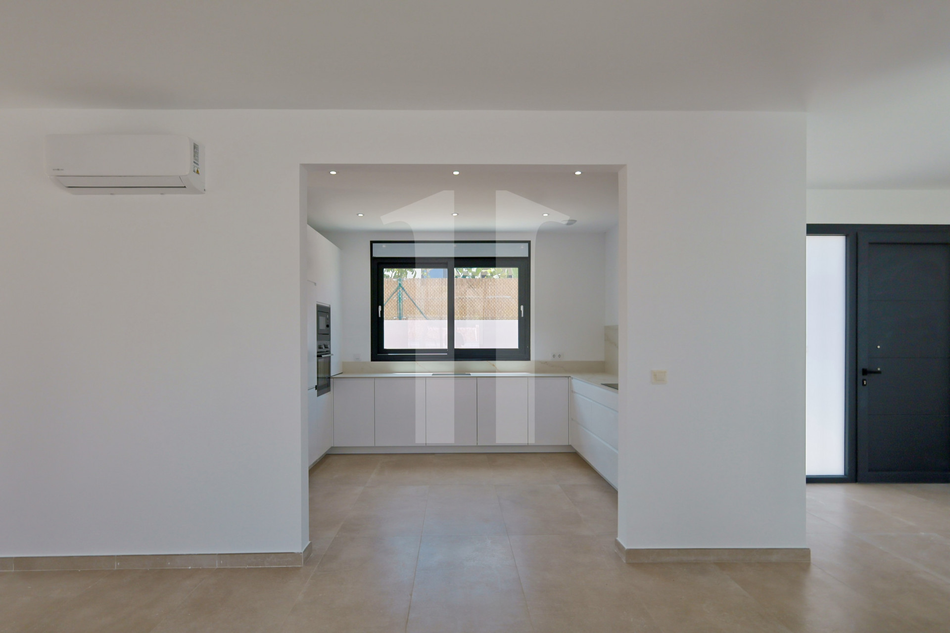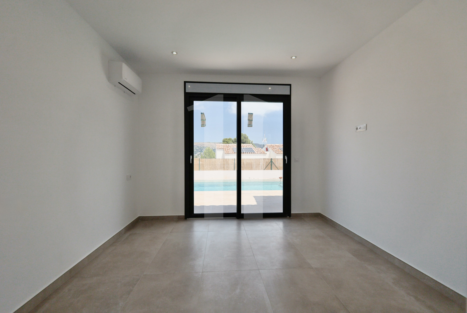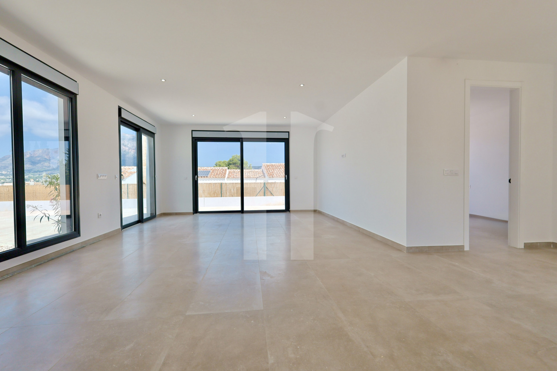 Distribuida en una sola planta, la villa permite moverse cómodamente entre las diferentes áreas. El salón destaca por su luminosidad y atractivo, gracias a los grandes ventanales que dan acceso directo a la terraza cubierta y a la piscina privada. Desde el salón, podrá disfrutar de impresionantes vistas a la piscina y al Montgó.