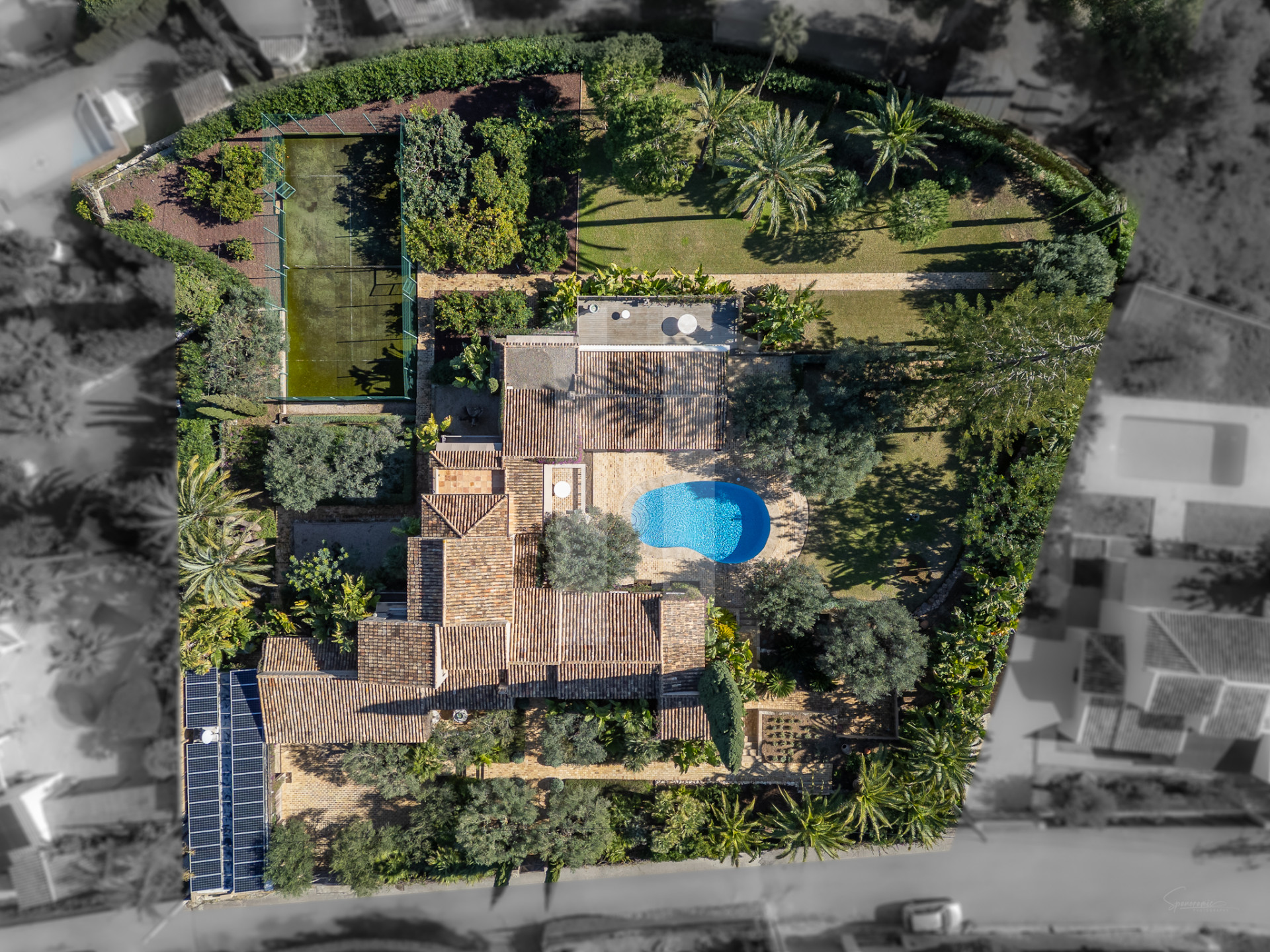 En el exterior, el lujo continúa con un amplio jardín cuidado al detalle, piscina privada, pista