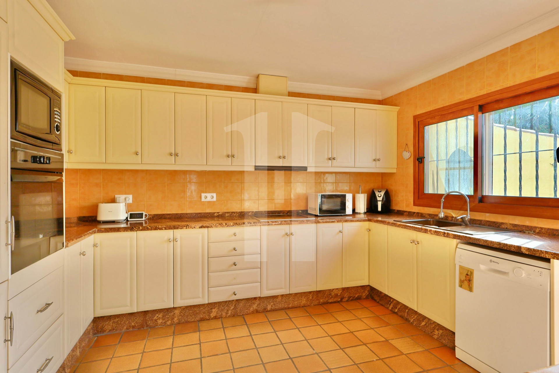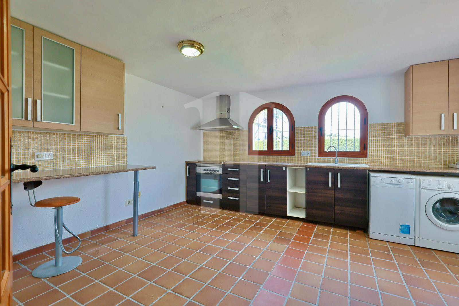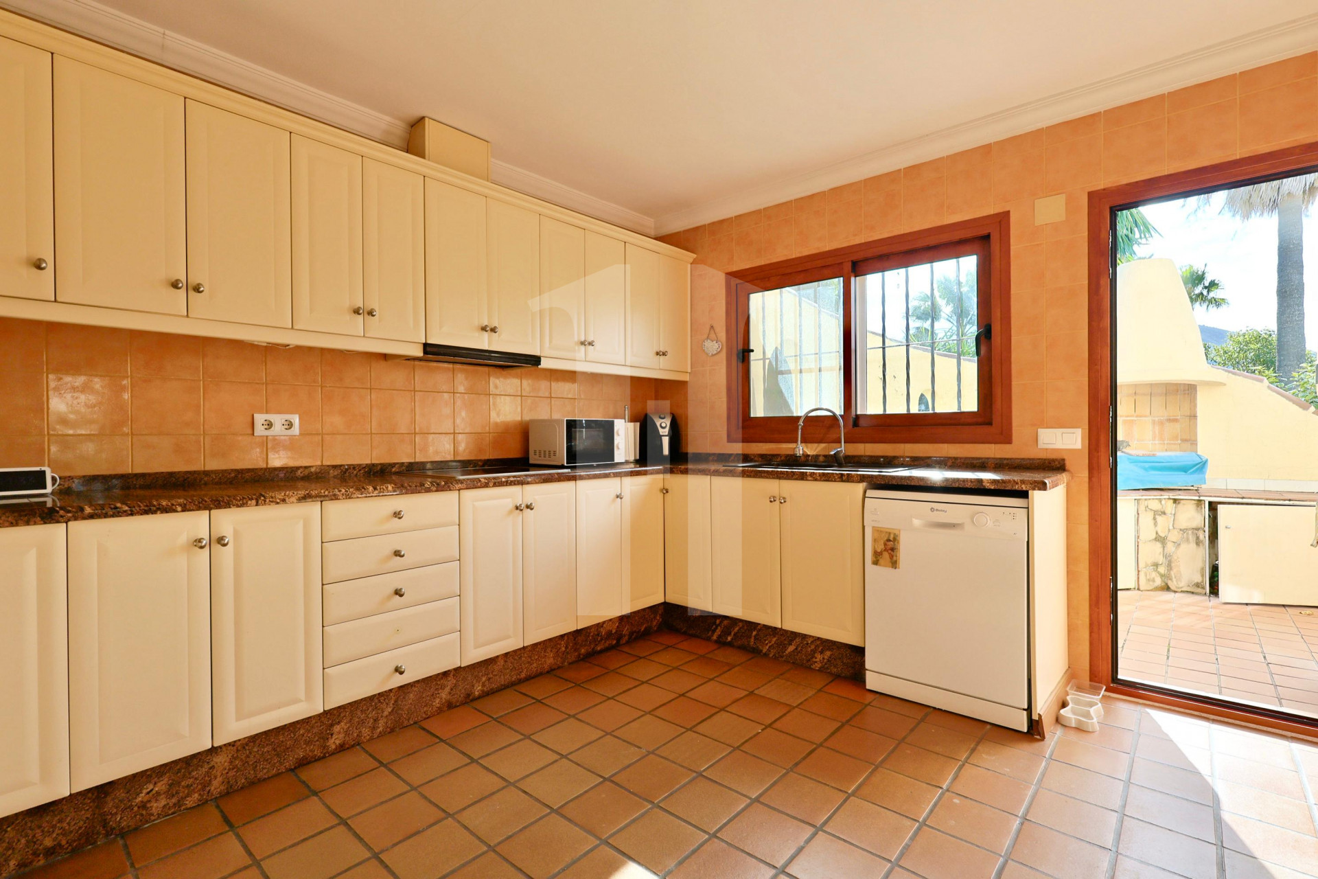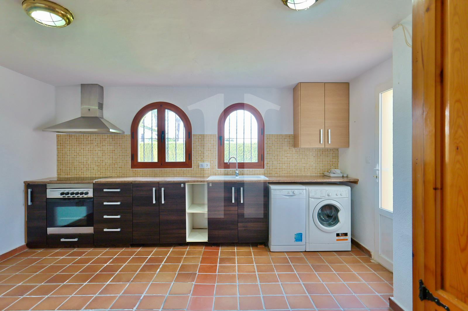 La cocina, de estilo moderno y totalmente equipada, dispone de abundante espacio de almacenamiento y salida directa a un patio abierto con zona de barbacoa y conexión con la terraza cubierta.